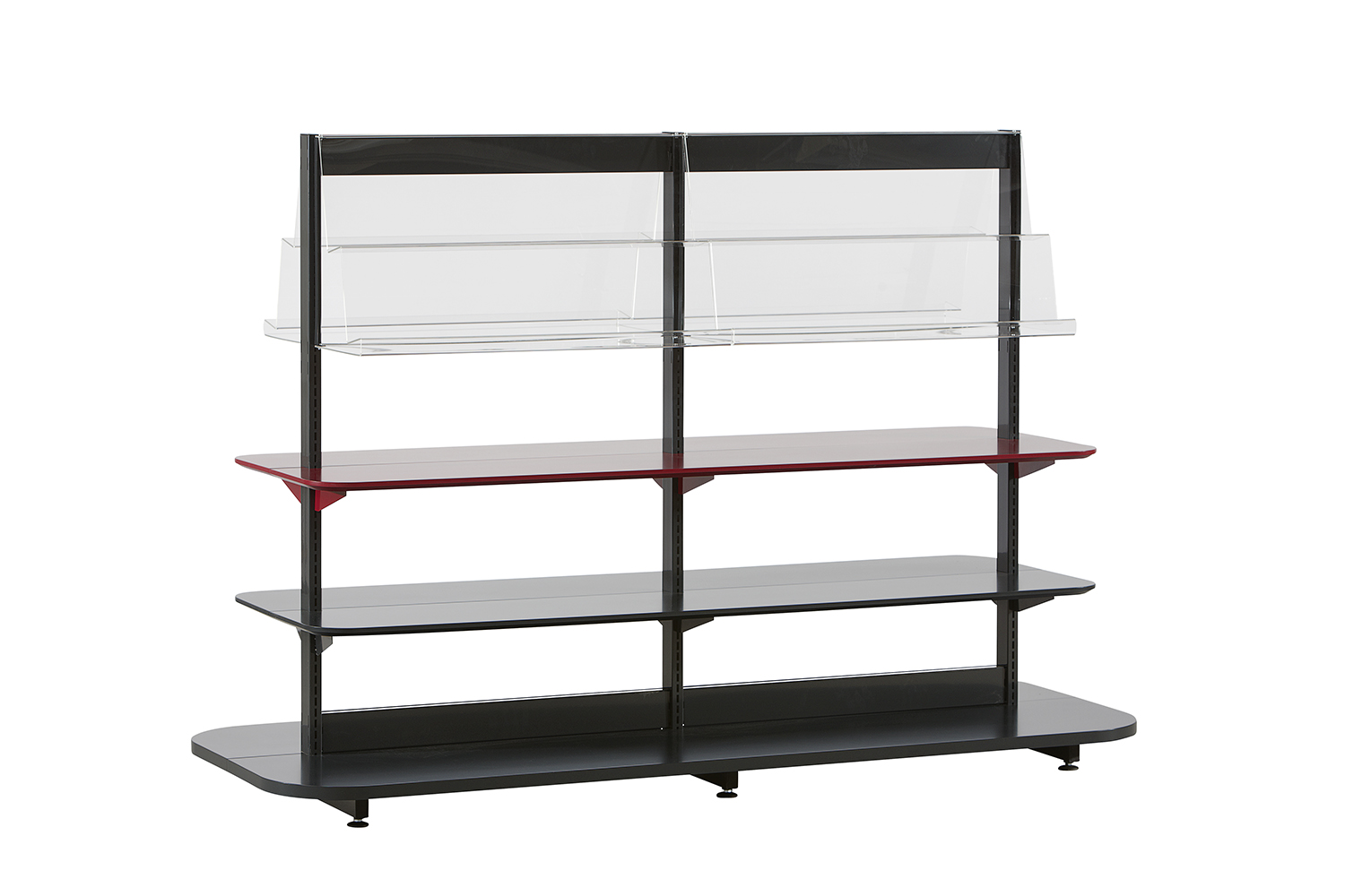 60/30 Expo est disponible en versions simple et double face, comme élément de base et complémentaire (maximum 3 éléments). Il se compose de montants métalliques, de tablettes en bois laquées et de tablettes de présentation en acrylique. Les montants métalliques et les tablettes en bois laquées sont disponibles dans tous nos coloris. Vous avez également le choix entre deux modèles de tablettes : à bords droits ou arrondis. De nombreuses configurations sont disponibles en standard, mais vous pouvez également composer un meuble de présentation sur mesure qui répond exactement aux exigences de votre bibliothèque.