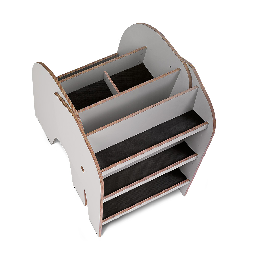 Nous utilisons du contreplaqué de bouleau – ici avec les bords visibles – pour créer une surface à la fois durable et robuste. Idéal pour les environnements de bibliothèque les plus exigeants !