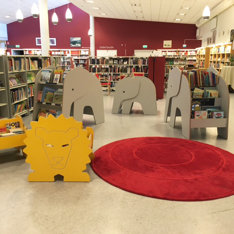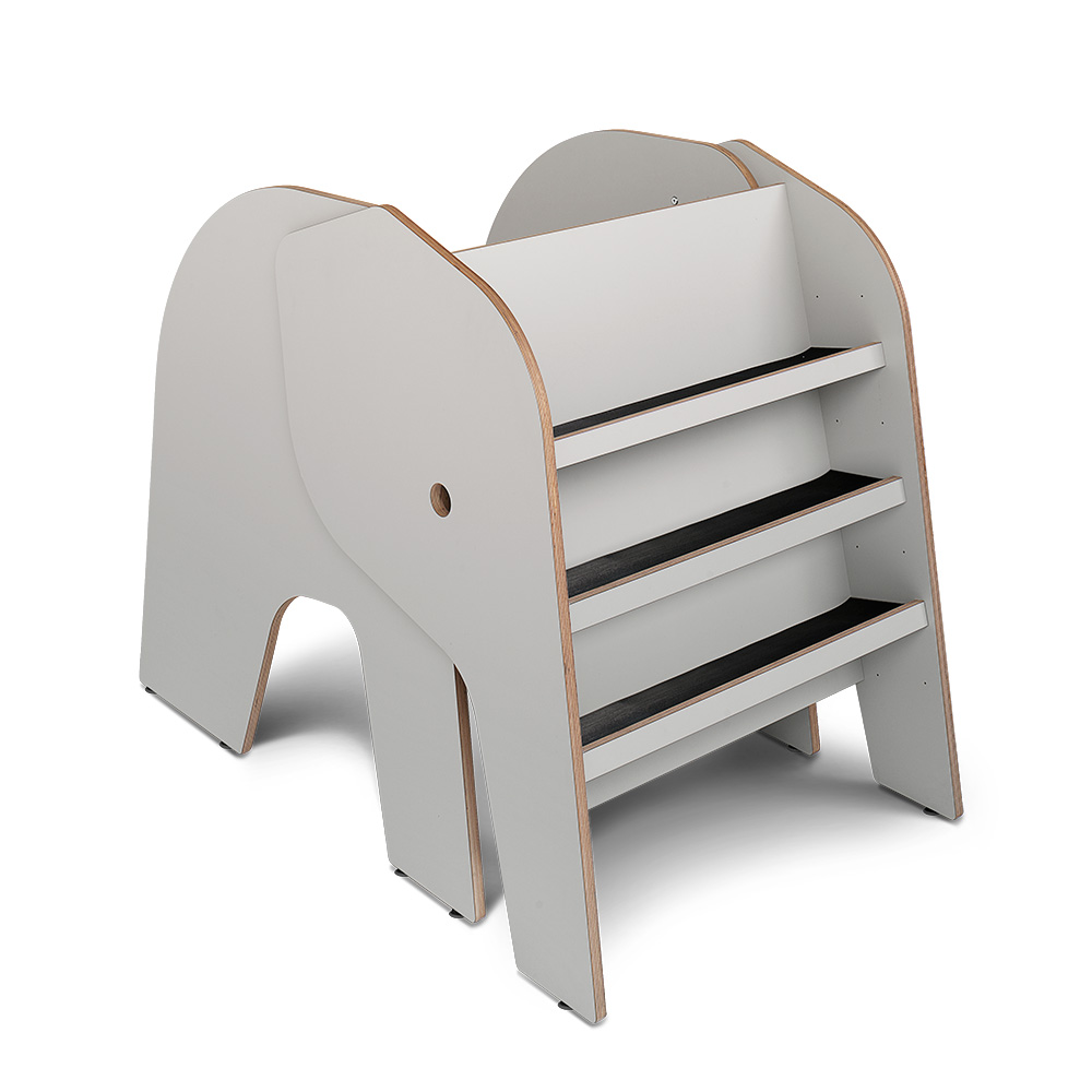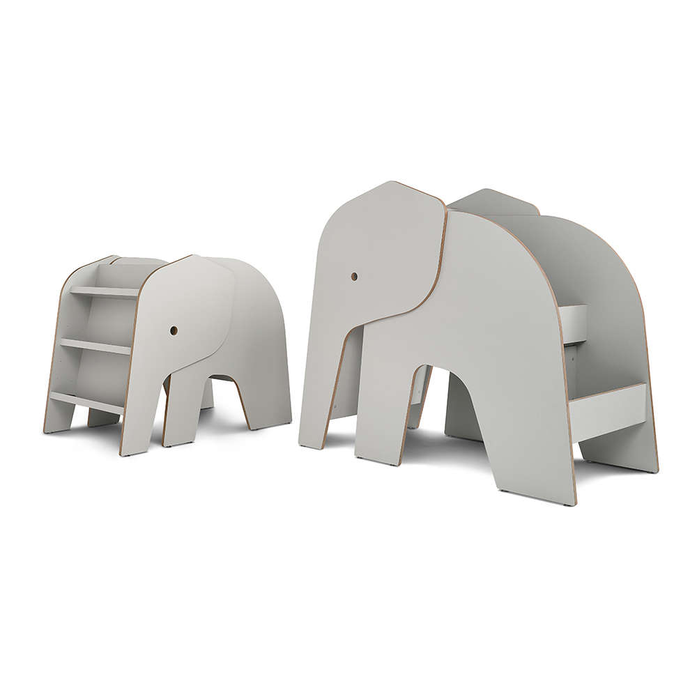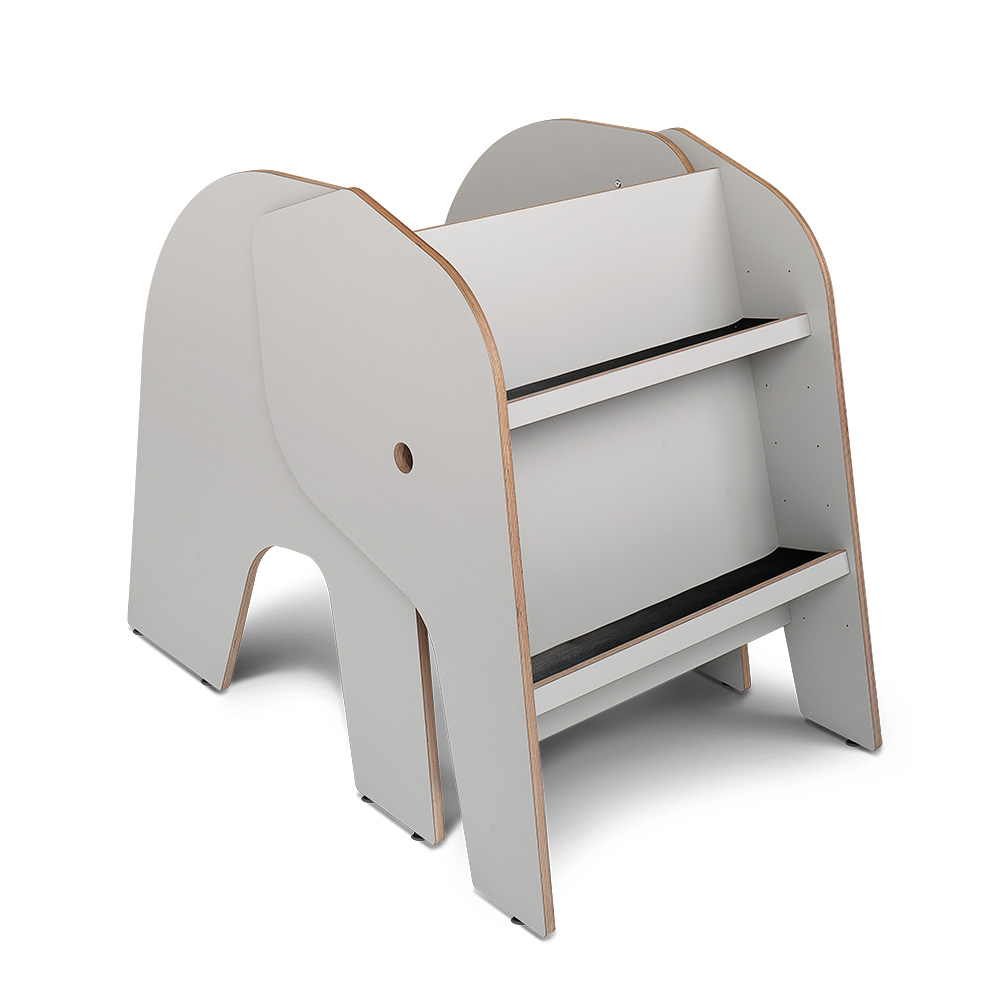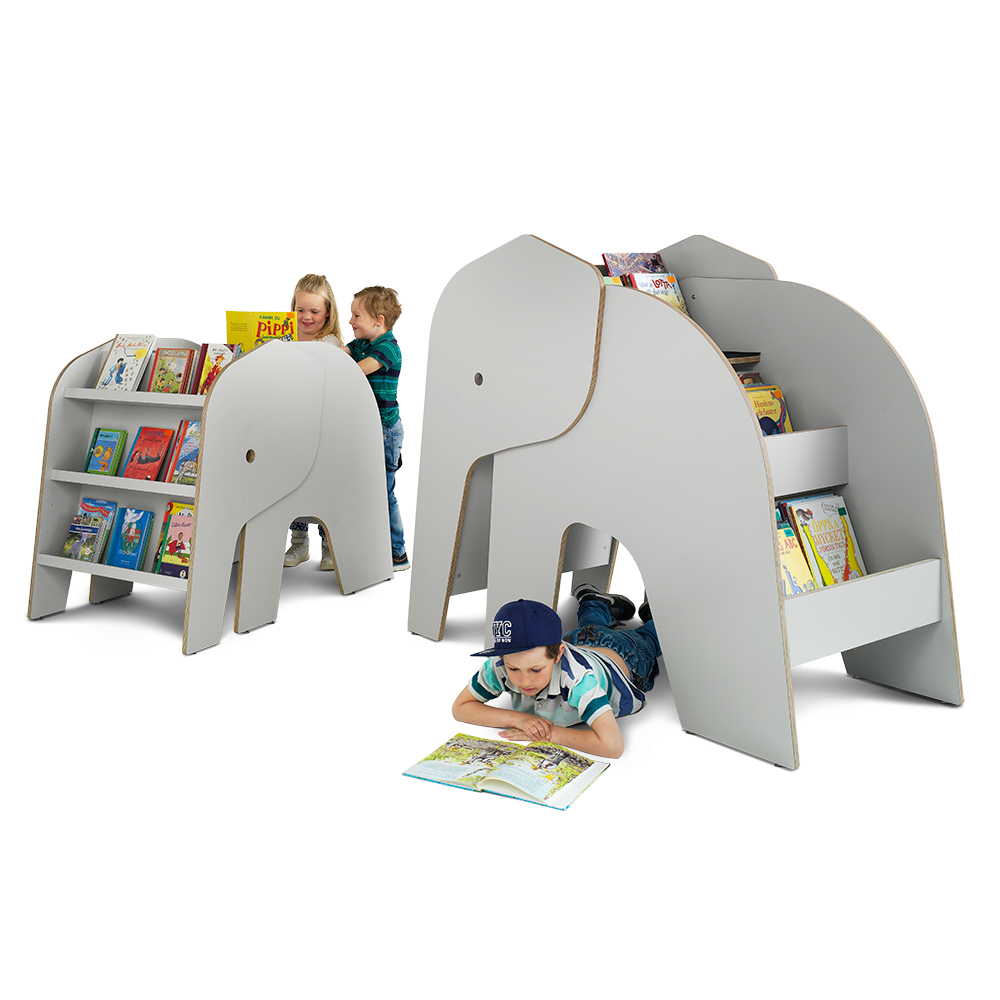 Petit Elof aide avec la charge! Elof est une version plus petite de Elna. Il aime aussi être avec les enfants et il est heureux d'être nourris avec des livres (c'est permis!).  Tablettes pour exposer des livres de face (le tronc) Selon la taille des livres choisis la défense d'Elof peut être équipé de trois étagères ( peuvent être ajustées)