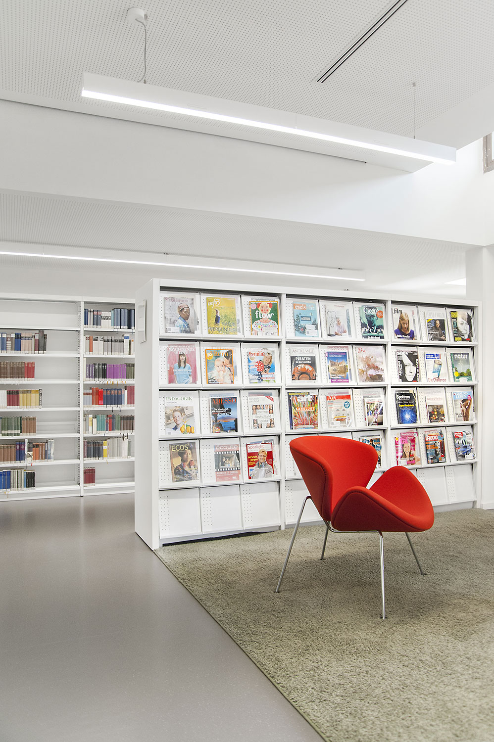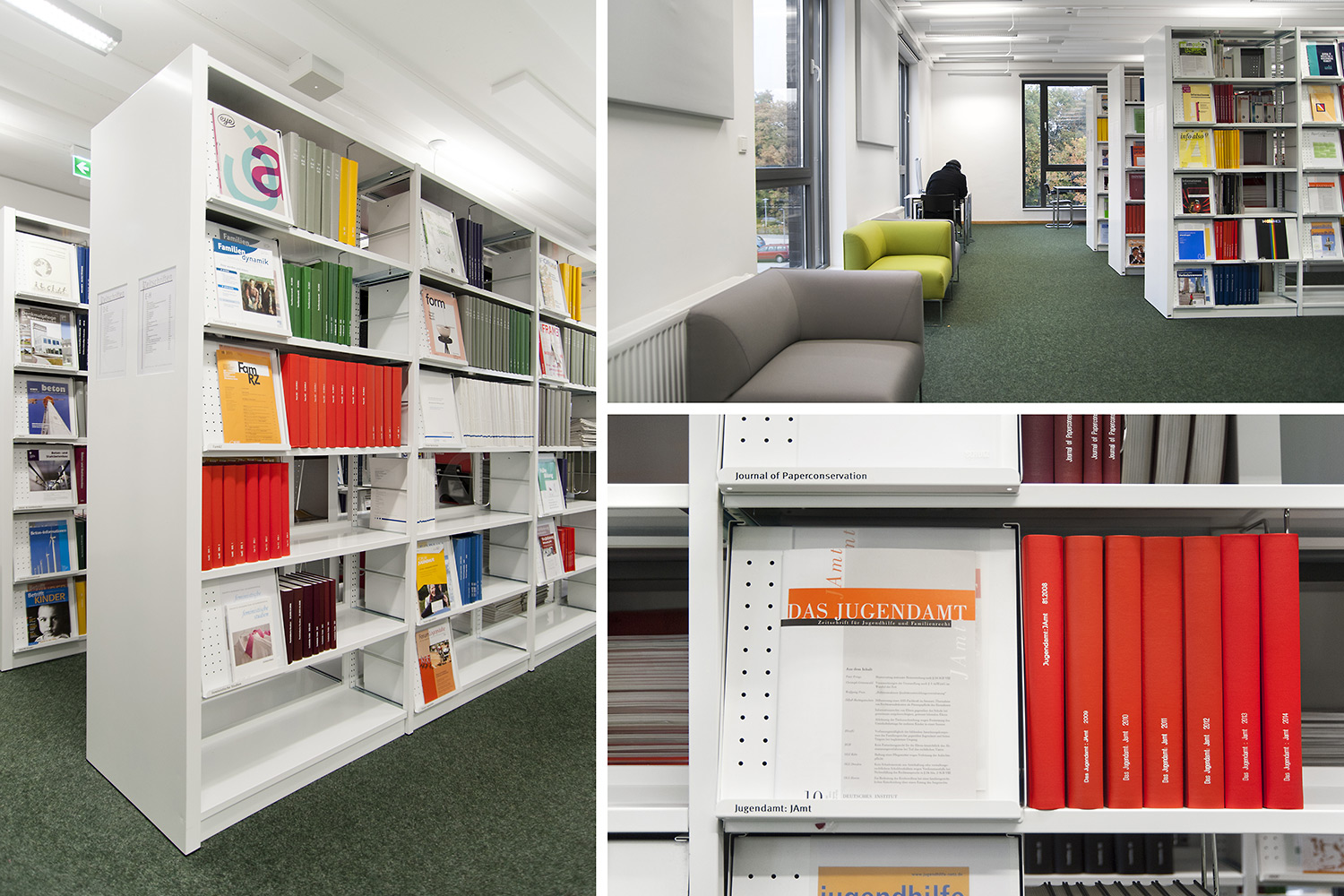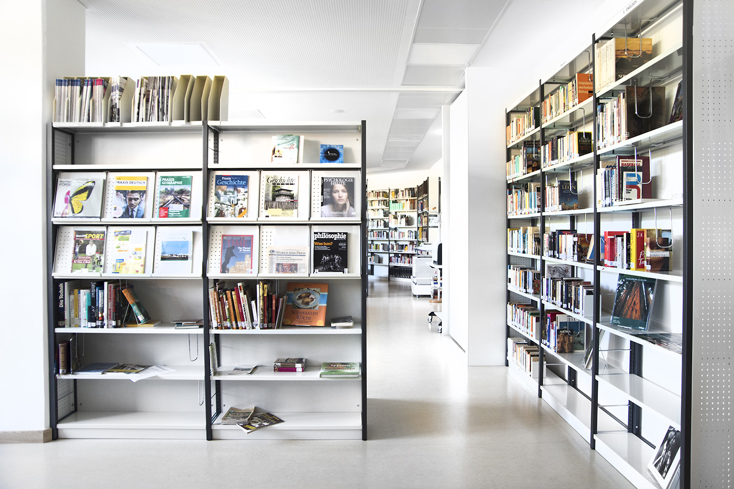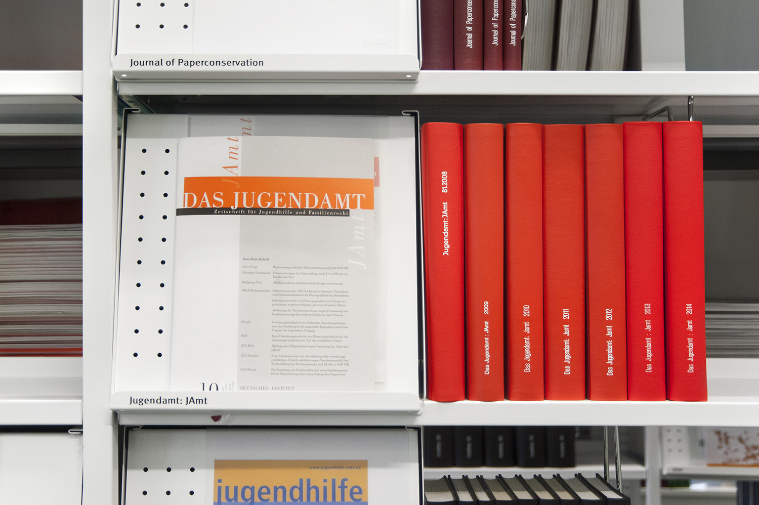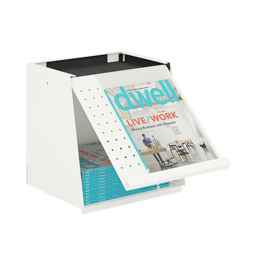 Boîte pratique pour étagère d’une profondeur maximale de 250 mm. Montre les périodiques avec la couverture tournée vers le visiteur.