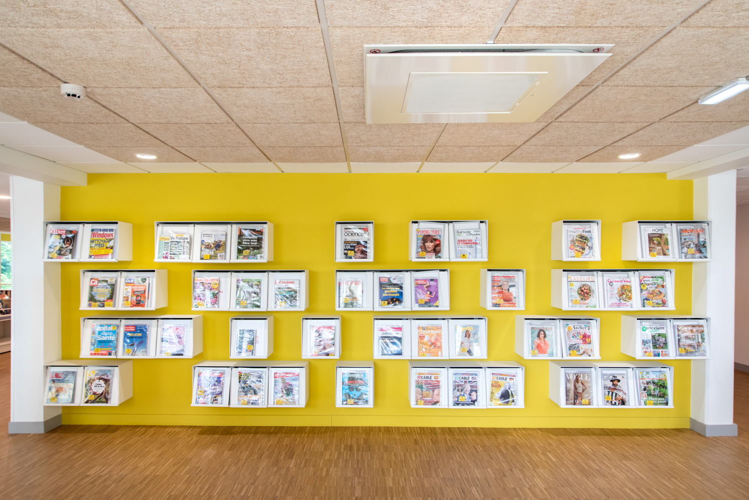 Les imprimés d’actualité sont conservés dans des casiers, derrière des rabats (lever et repousser). Le périodique exposé est maintenu en place par un film transparent qui couvre le rabat.