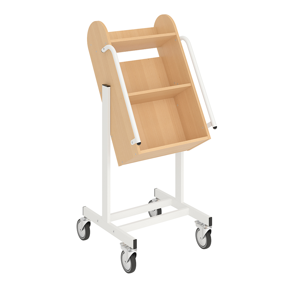 Chariot simple-face, caisson incliné avec 3 tablettes. à trois étagères, dont celle du milieu amovible.