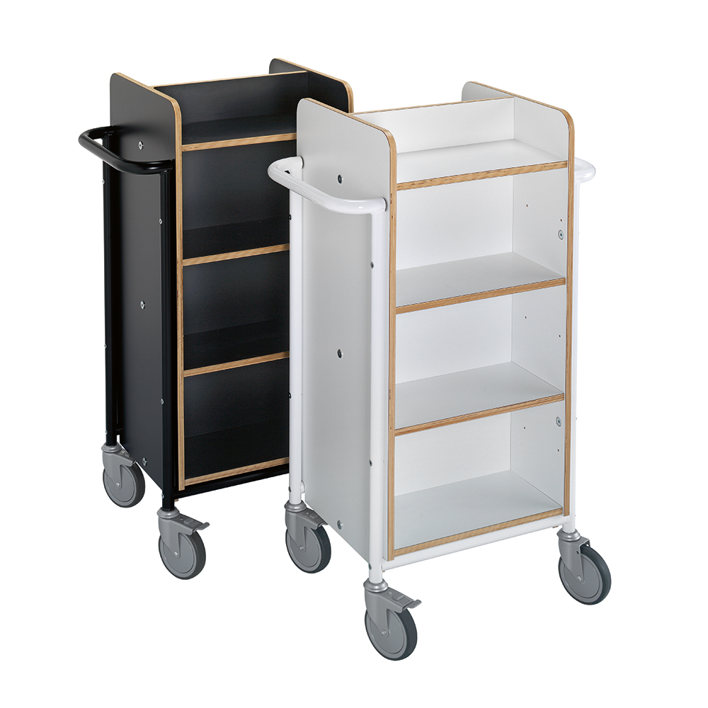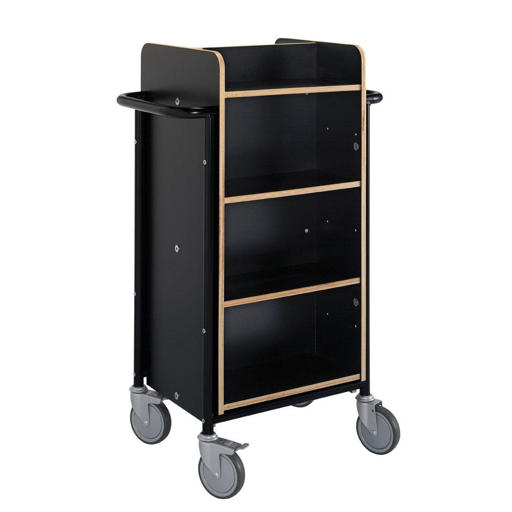 Un chariot double face fonctionnel et cloisonné, avec huit étagères amovibles.