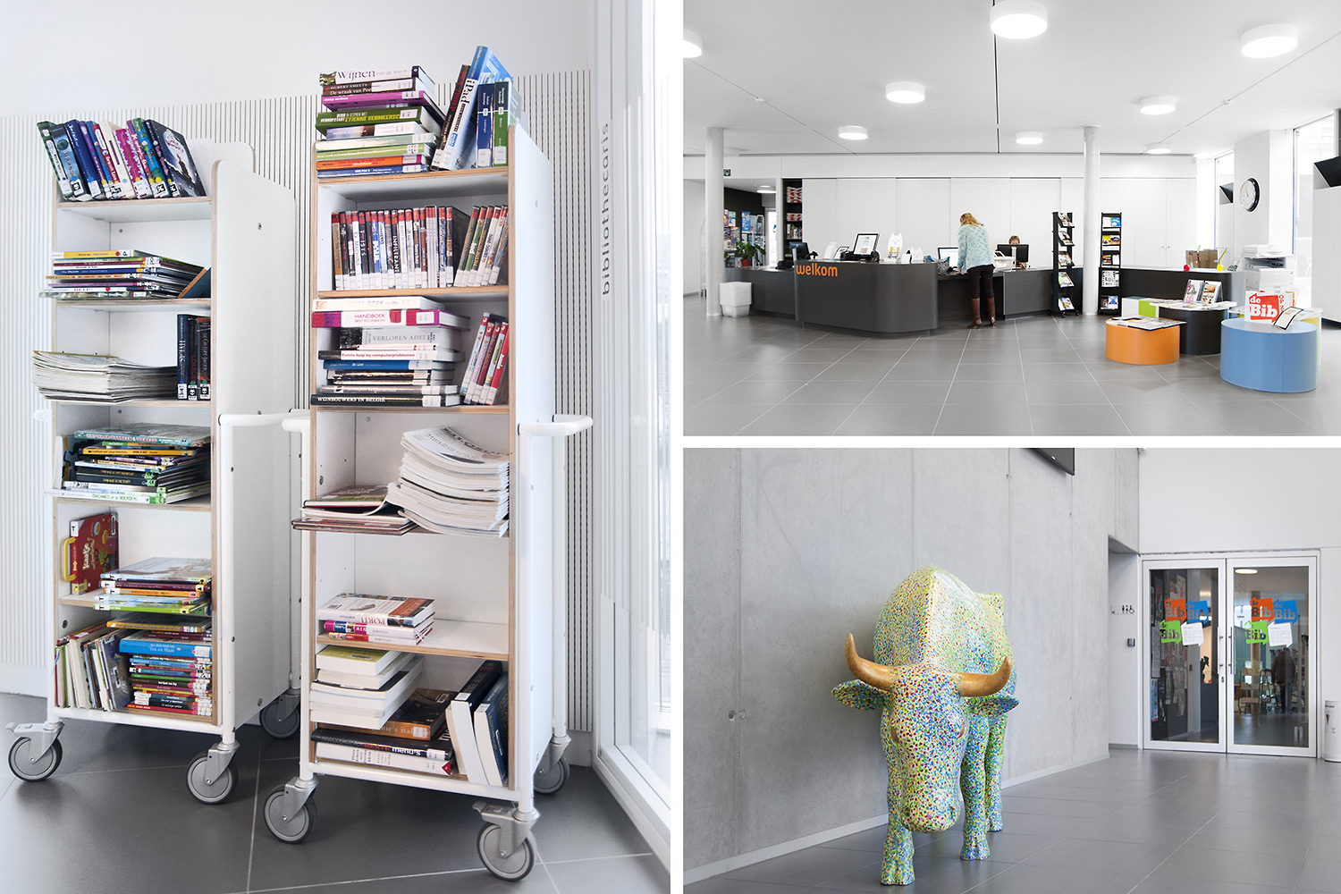 Chariot double face avec six étagères amovibles de chaque côté. Pratique pour le stock réservé, les retours, les nouveautés, comme tour de livres ou d’exposition mobile.
