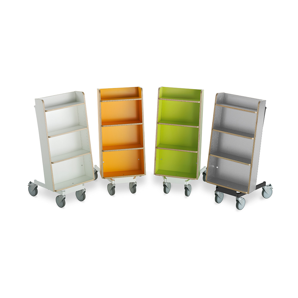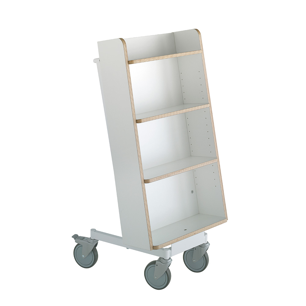 Pratique chariot simple face à quatre étagères inclinées, dont deux amovibles.