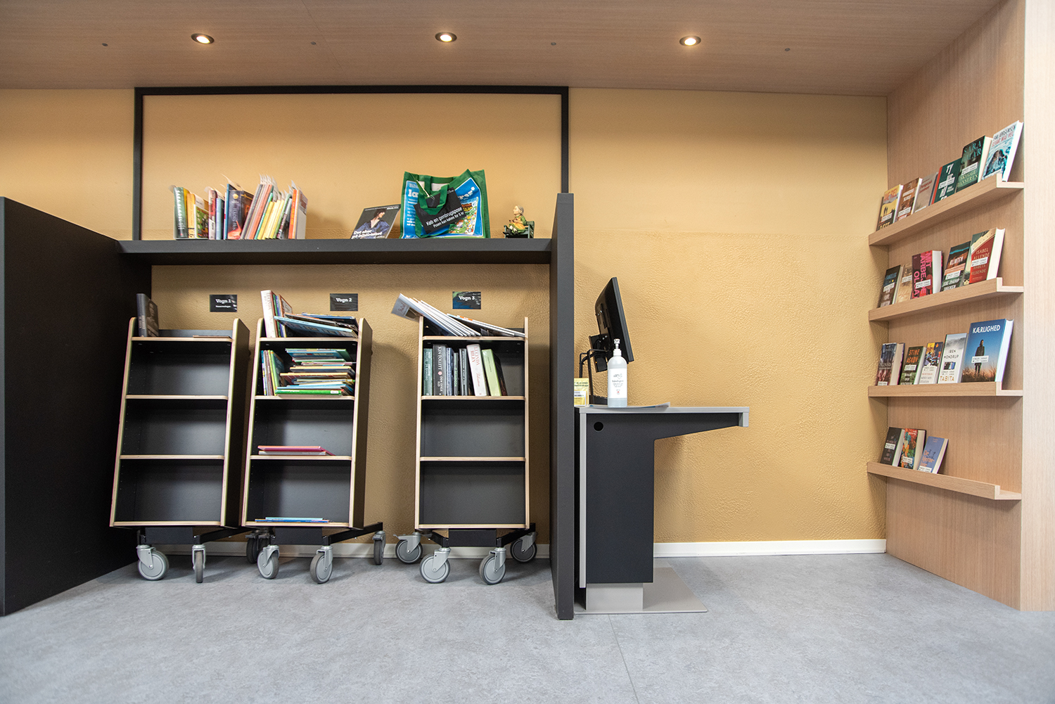 Nous utilisons du contreplaqué de bouleau – ici avec les bords visibles – pour créer une surface à la fois durable et robuste. Idéal pour les environnements de bibliothèque les plus exigeants !