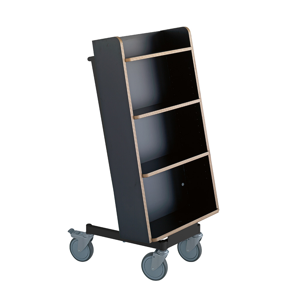 Pratique chariot simple face à quatre étagères inclinées, dont deux amovibles.