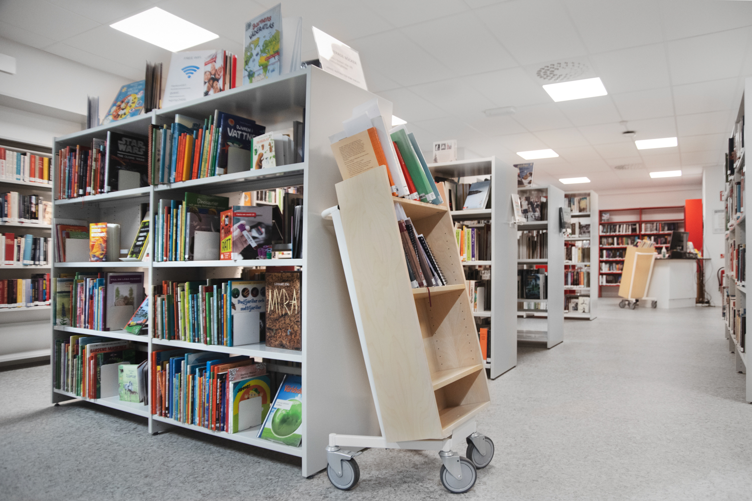 Pratique chariot simple face à quatre étagères inclinées, dont deux amovibles.