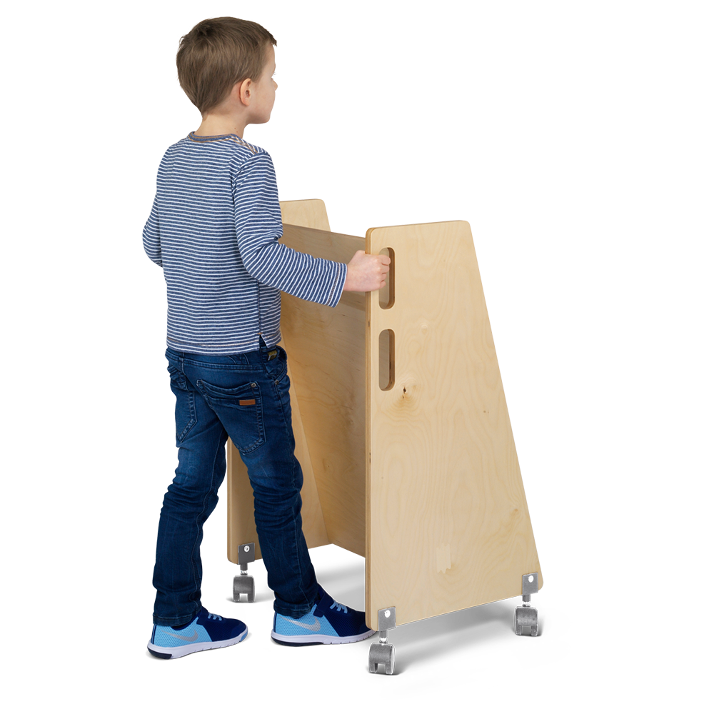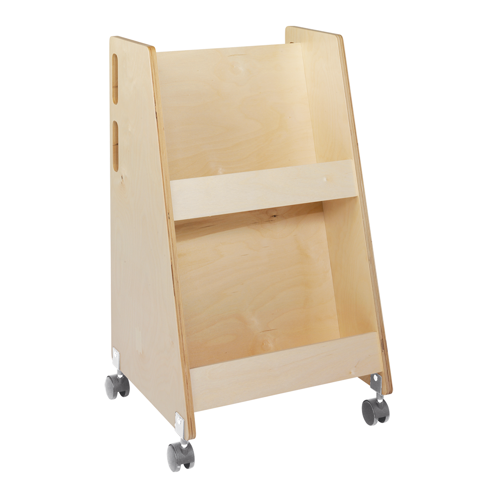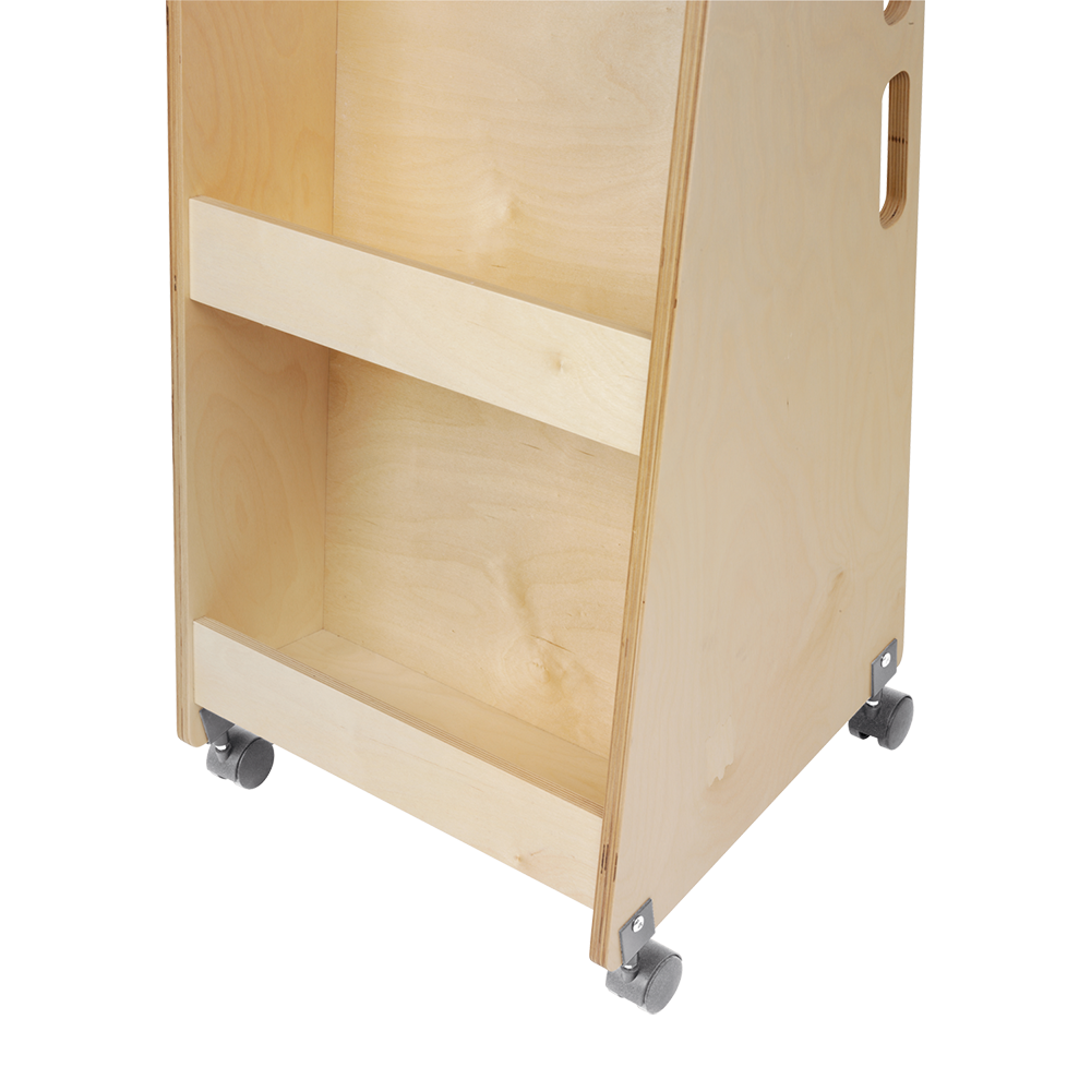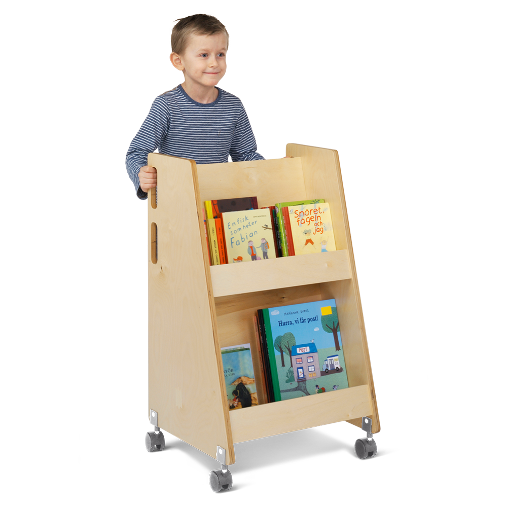 Chariot à livres compact en contreplaqué de bouleau pourvu de 2 tablettes fixes à rebords pour une présentation frontale d’albums/de BD.