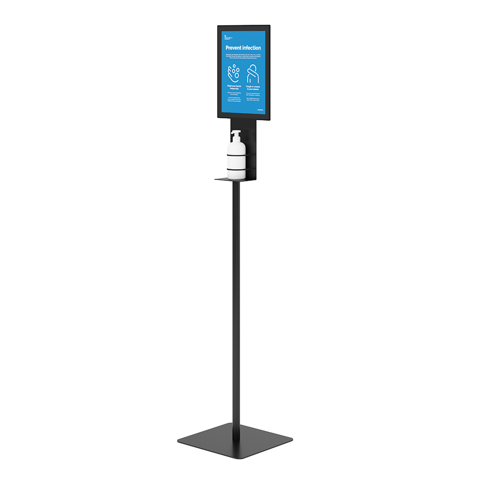 Borne autoportante pour la désinfection des mains, fourni avec un cadre aimanté, format A4, pour changer facilement les informations.