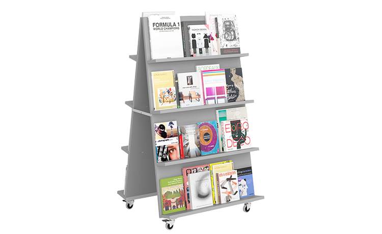 Présentoir double face sur roulettes. Pour mettre en valeur tous types de document dans les espaces ouverts.