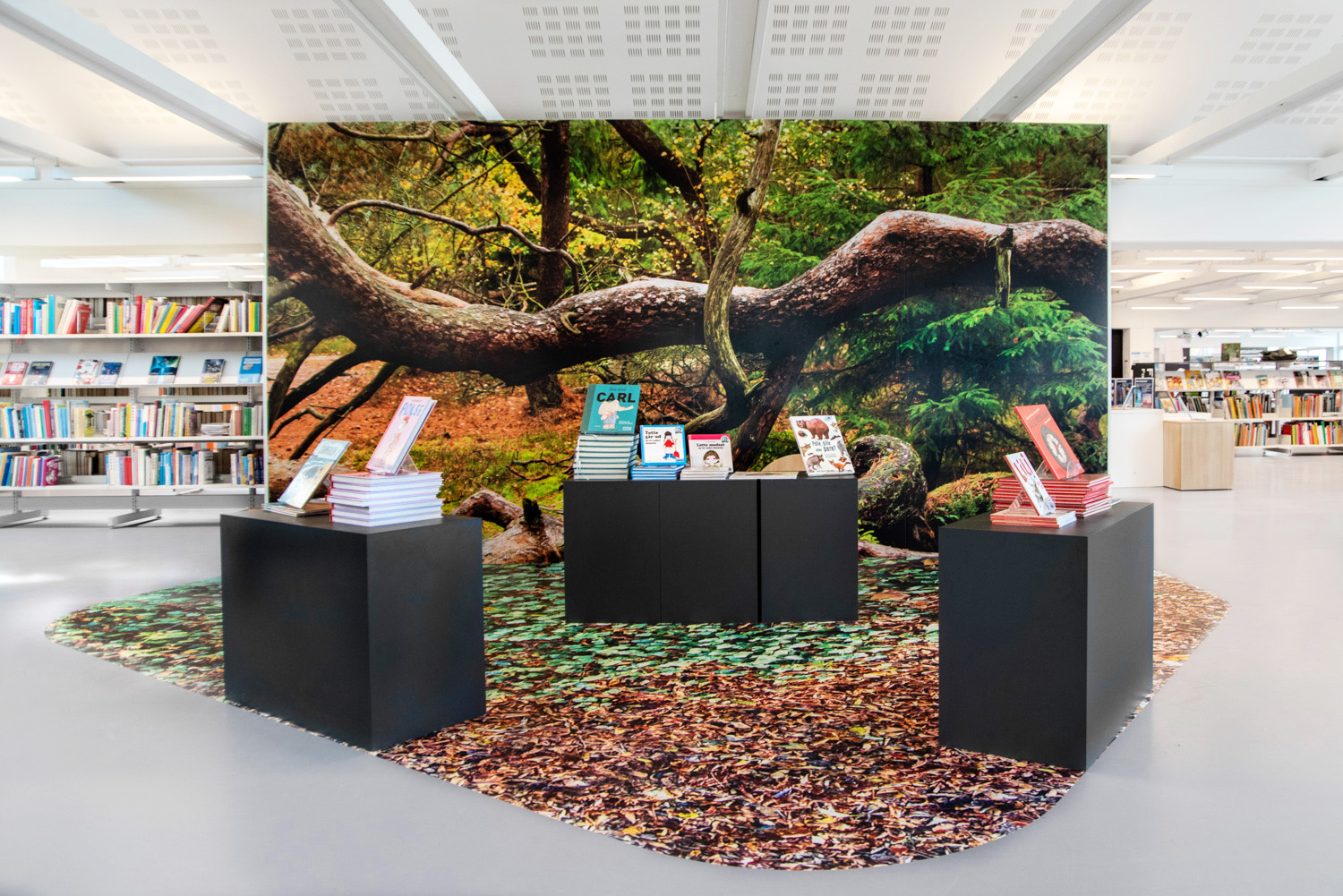 En apportant la forêt et la plage dans la bibliothèque, les visiteurs peuvent profiter d'une promenade entre les arbres ou faire une excursion en toute tranquillité. Nous avons intégré des arbres spécialement conçus pour servir comme panneaux d’extrémité des rayonnages avec des livres en présentation. Ces mobiliers originaux et les revêtements de sol représentant la forêt, les roches naturelles, l'océan et le sable.