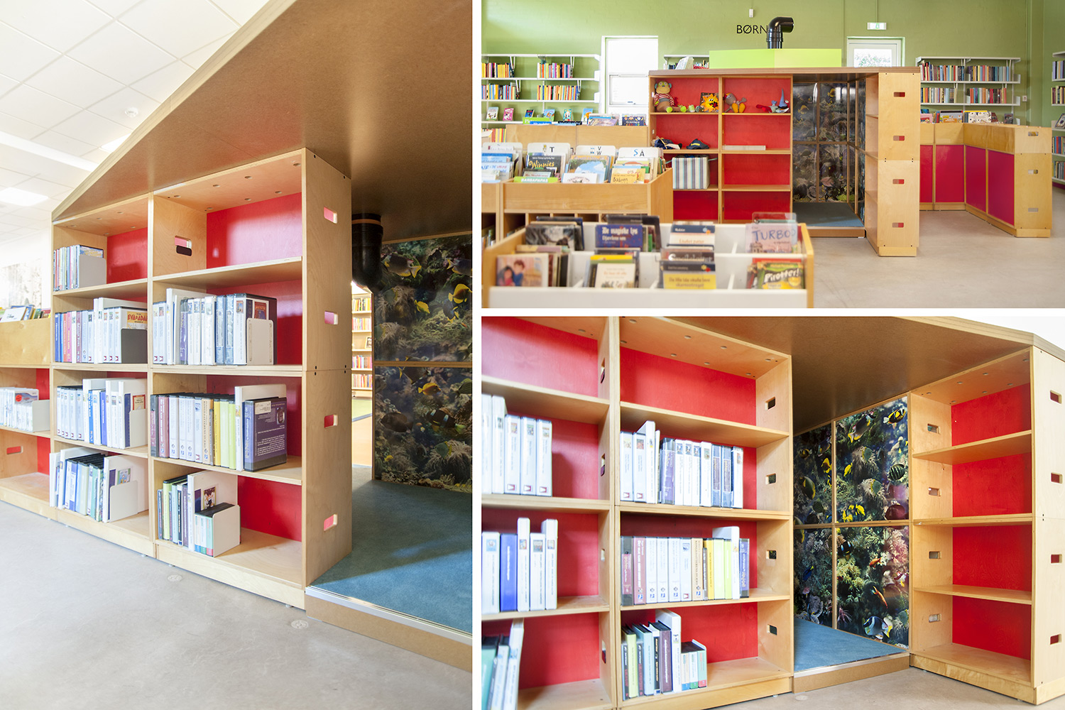 Dans la bibliothèque de Taulov, une simple réutilisation des étagères rouges existantes associée avec de nouveaux panneaux d’habillage a été effectuée. Dans l’espace jeunesse, des panneaux latéraux ont été ajoutés aux bacs à albums qui complétés avec de jolies cabanes spécialement construites créent une atmosphère agréable et conviviale.
