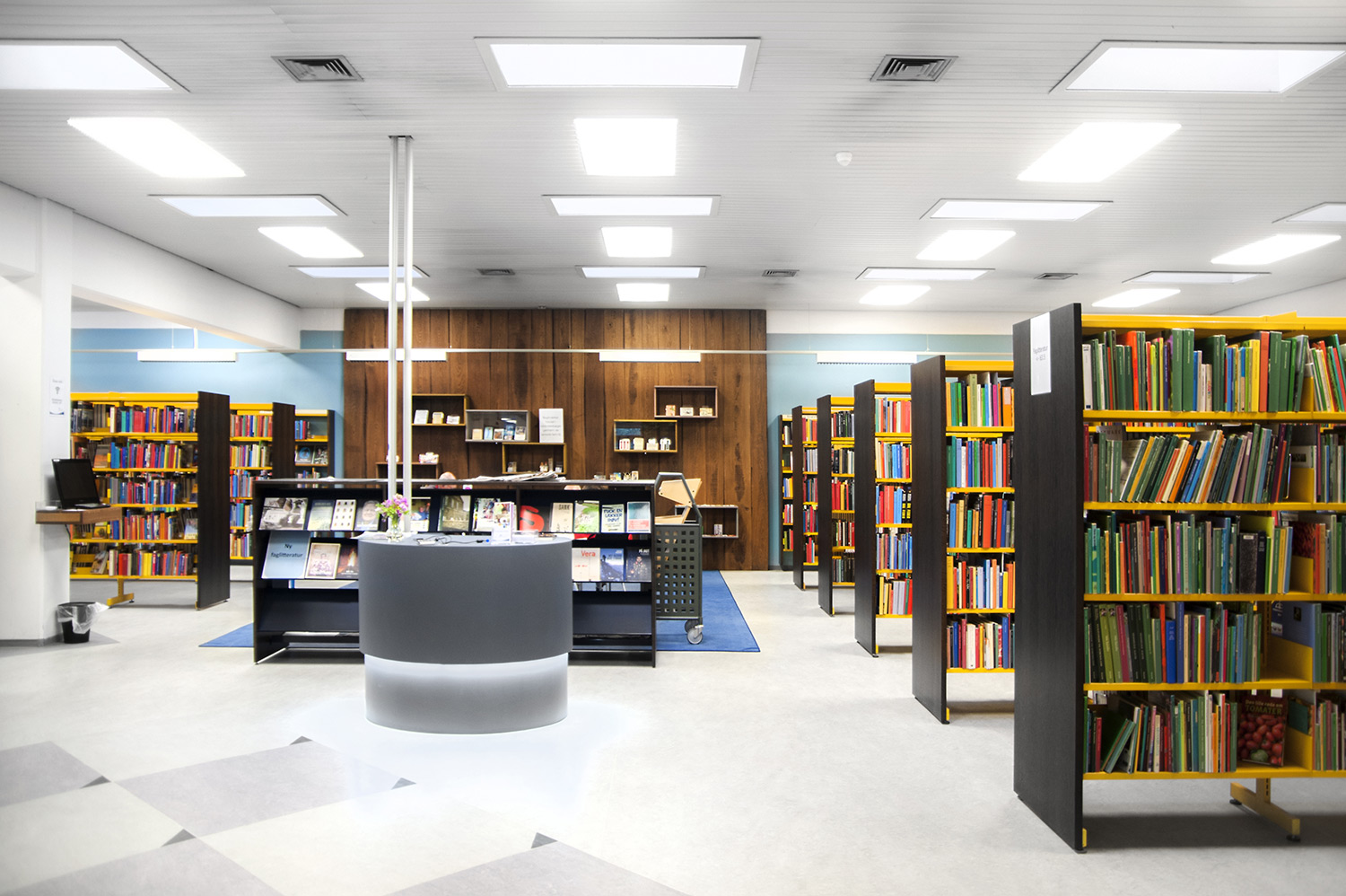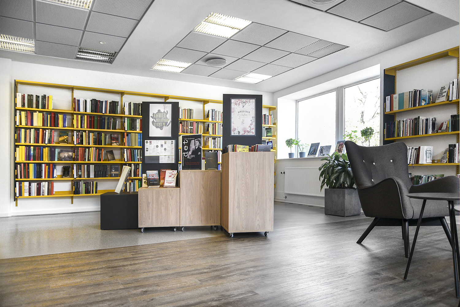 Dans le cadre de la restructuration de la bibliothèque Horsens, les anciennes étagères jaunes ont été réutilisées. Grâce à de nouveaux panneaux d’habillage d’extrémité gris anthracite, un look moderne et accueillant a été atteint. Dans le même temps, des podiums d’exposition en gris et chêne clair ont été ajoutés. Une décoration murale rappelant la forêt et un plancher en bois renforcent l’aspect « nature » des lieux. Dans l’espace jeunesse, la réalisation de jolies cabanes ont été réalisées.