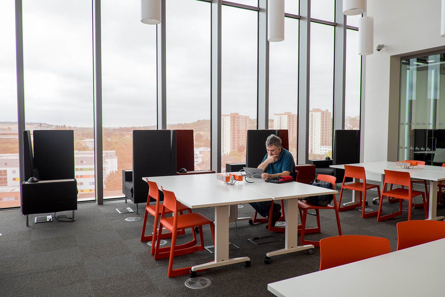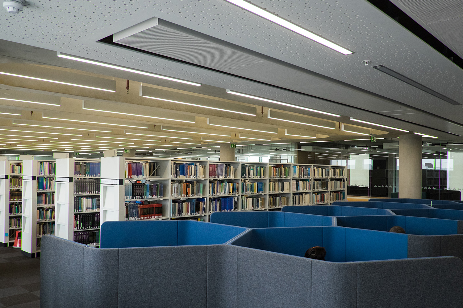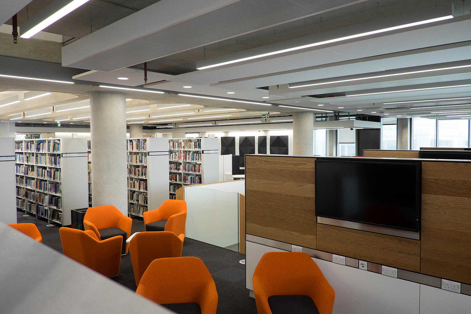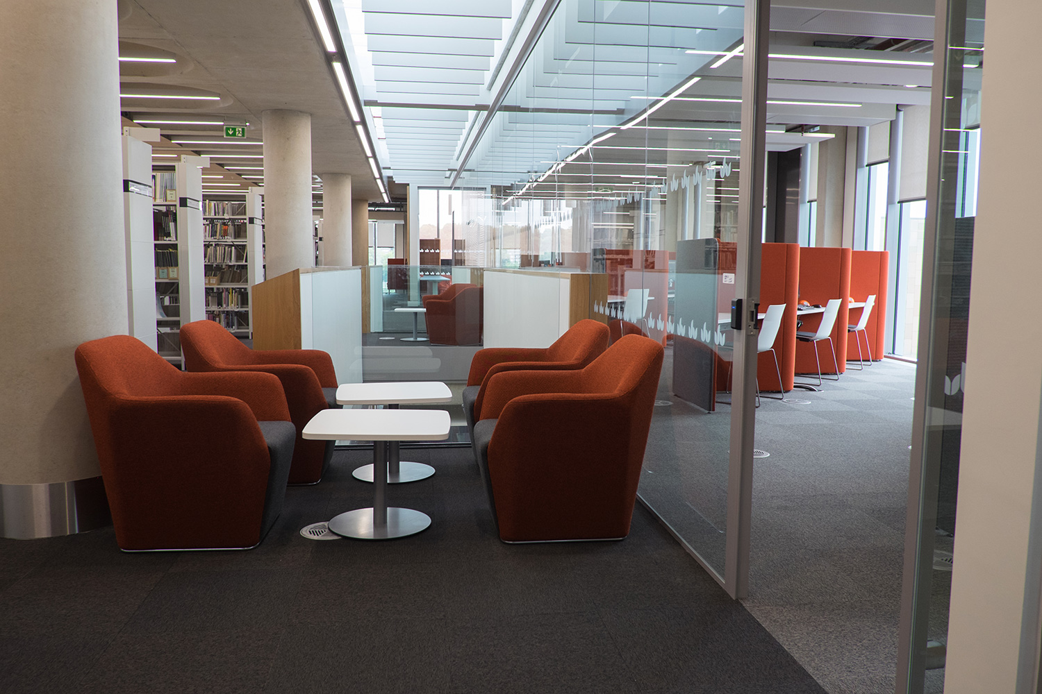 Les cabines ou box de travail peuvent être vus dans différentes combinaisons de couleurs à travers la bibliothèque. Des fauteuils à haut dossier réduisent la nuisance sonore des espaces environnants et peuvent intégrés une surface de travail. Des blocs d'alimentation électrique ont été ajoutés permettant aux étudiants de brancher leur ordinateur portable et de disposer de deux ports USB. Egalement présente, une Table/bureau courbe pour cinq personnes pouvant accueillir des écrans d'ordinateur avec des boîtiers de branchement rétractables permettant une surface de travail plane et sans écran lorsque cela est nécessaire. Un dispositif pour le clavier et la souris et un chemin de câbles intégré sont également inclus. En s'intégrant parfaitement au système d'étagères existant de la bibliothèque de l'université, les cabines d'études donnent à l'espace un aspect moderne et insufflent une variété de couleurs à l'ensemble de l'espace.