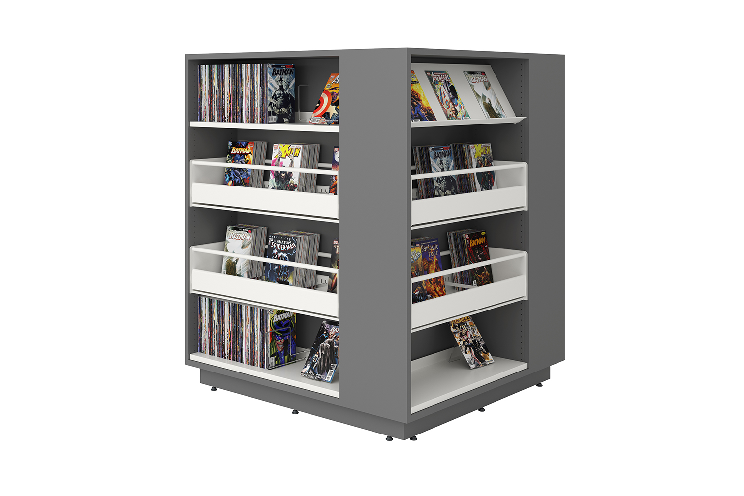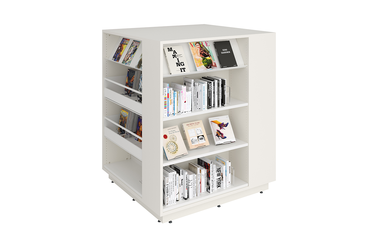 Ce système de rayonnage carré peut être utilisé à la fois pour le rangement et la présentation de livres. Vous pouvez opter pour des étagères droites ou des bacs à albums si vous désirez optimiser l’espace de stockage ou bien exploiter la grande diversité des accessoires fonctionnels disponibles pour créer des espaces de présentation. La partie supérieure du module sert également de table de travail ou d’espace de jeux. Le Lingo Square peut aussi être installé comme tour à thème pour attirer l’attention des visiteurs.