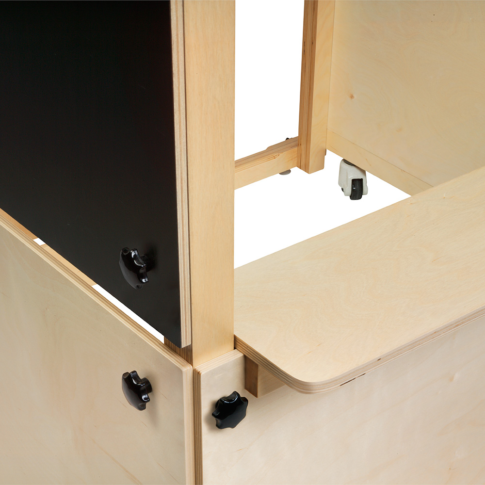 Cubik est constitué d’une ossature et d’éléments muraux en contreplaqué ou en stratifié noir permettant aux enfants d’écrire/d’utiliser des accessoires aimantés.