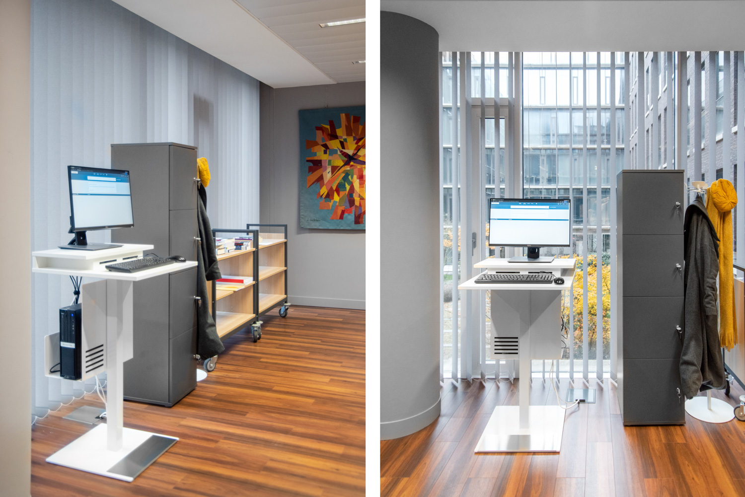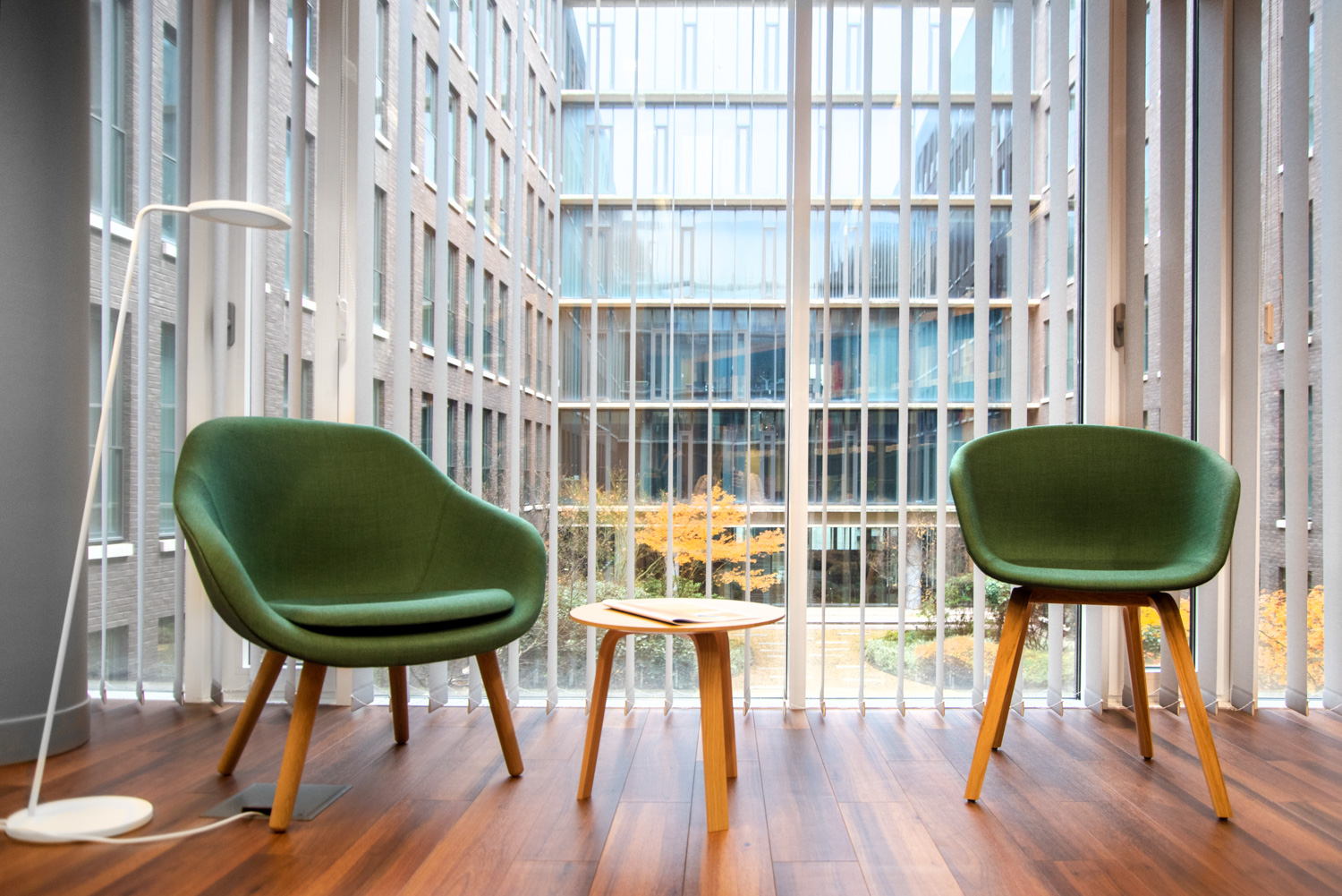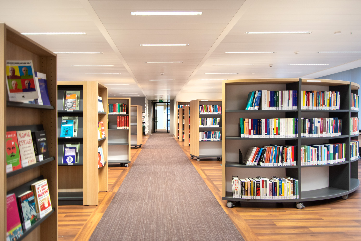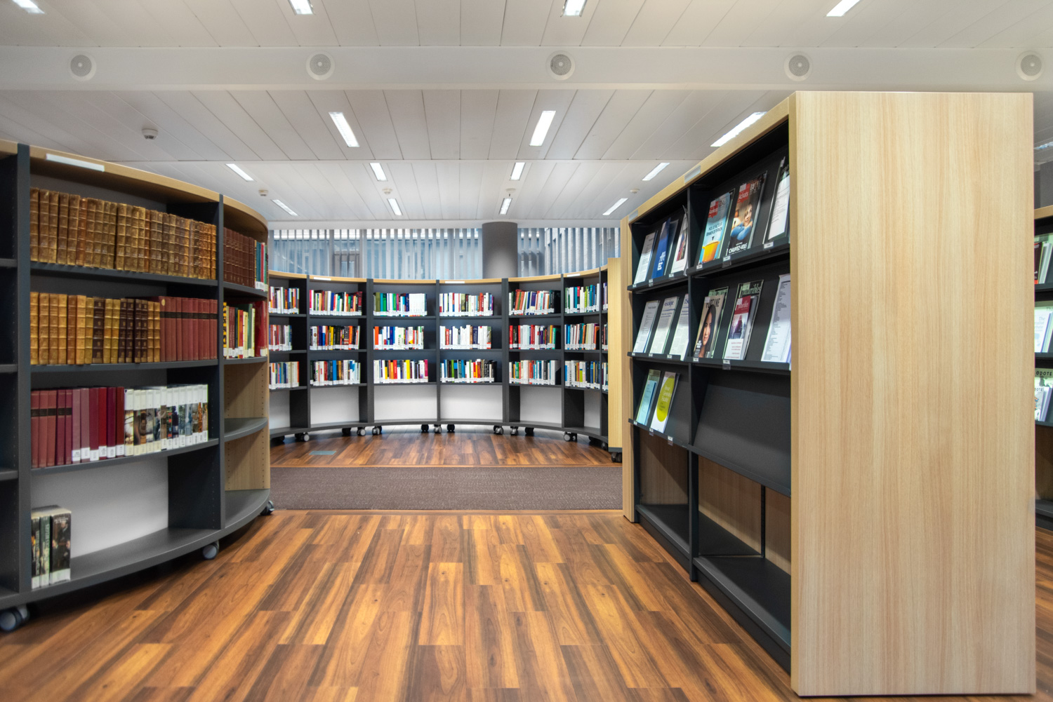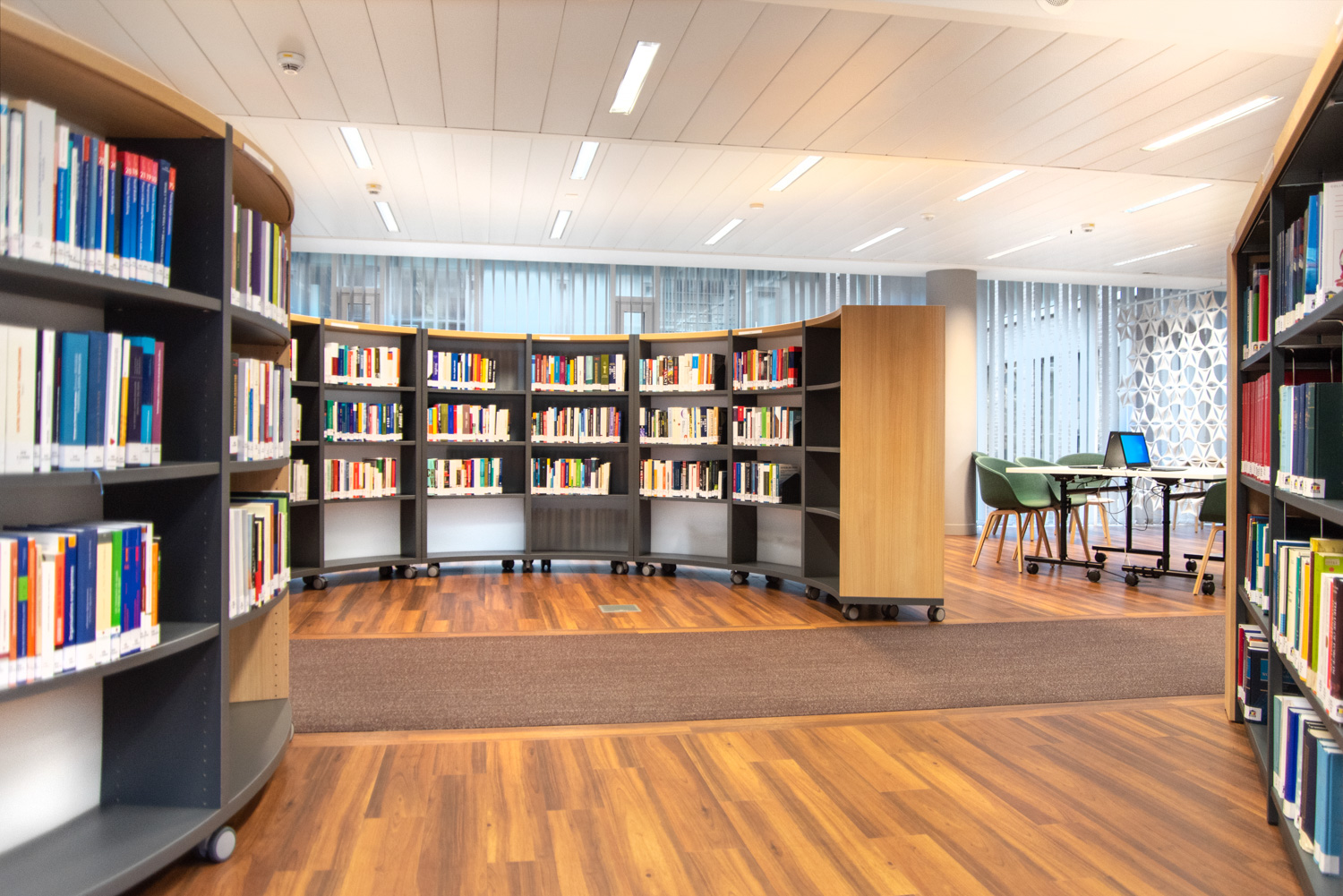 L'installation de rayonnages de forme courbe confère un caractère à la fois élégant et décontracté au design intérieur. Les différents types de chaises et de fauteuils permettent au lecteur de choisir son endroit préféré. Les couleurs et la décoration intérieure sont agréables et chaleureuses. La combinaison des meubles et des couleurs choisis pour la bibliothèque fait de la salle de lecture un lieu de détente confortable et reposant au milieu des nombreuses activités bruyantes et animées qui l'entourent.