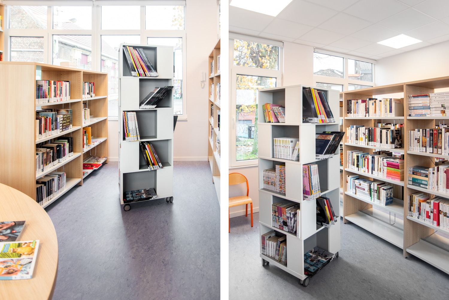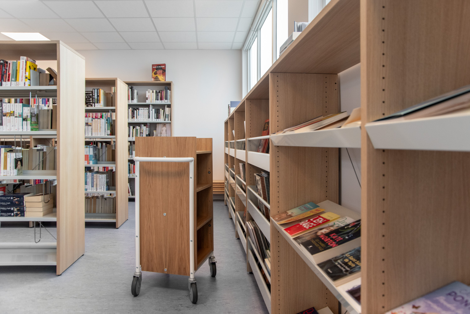 Les rayonnages sont moins nombreux qu'auparavant, ce qui permet une meilleure circulation intérieure. La bibliothèque est divisée en deux espaces distincts séparés par un corridor de circulation : un côté pour les jeunes et un côté pour les adultes. Les deux salles sont visuellement liées par la même utilisation des couleurs et des matériaux.