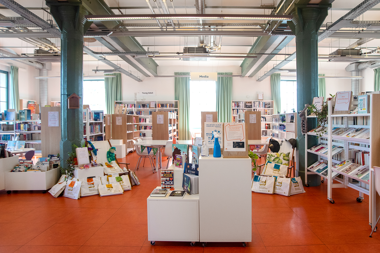 Bibliothécaire Elise Ghyselen : « Notre bibliothèque est une véritable bibliothèque familiale. Il était donc particulièrement important que l'intérieur soit adapté à notre public jeune et diversifié, et aux emprunteurs allophones. Une signalisation claire et visuellement accessible était essentielle.”