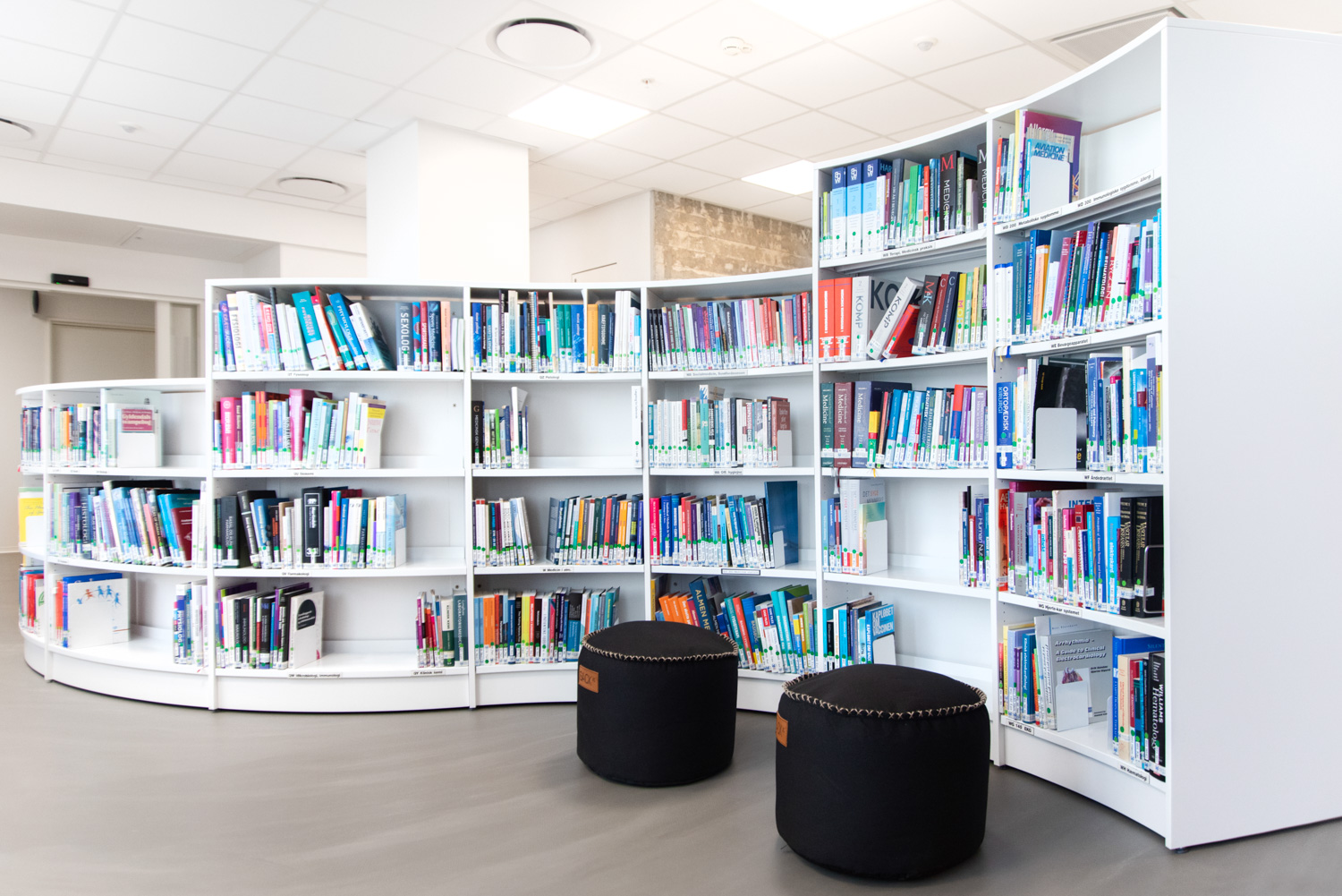 La chaleur du bois contraste avec le verre et le béton du bâtiment. Au fil des ans, le bois se patinera, ce qui donnera une apparence " authentique " et singulière. Nous avons également fourni les systèmes d'étagères courbes ainsi que les grandes tables de travail en chêne où les étudiants peuvent s'asseoir, soit en groupe, soit individuellement. Tout le câblage a été soigneusement dissimulé dans la structure des tables. Les séparations entre les tables créent des espaces de calme et de concentration. Les étudiants travaillent dans un environnement agréable et confortable où les matériaux chaleureux et la lumière naturelle produisent un très bel effet.