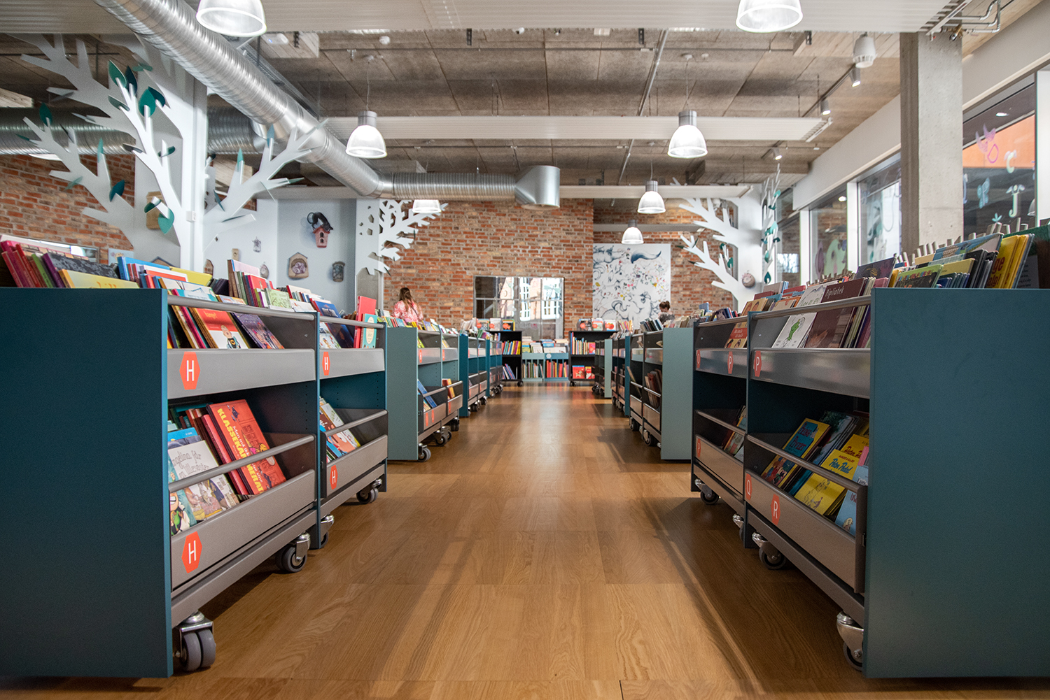 En 2021, l'espace enfants a été rénové avec des bacs multimedia aux belles couleurs pastel. Le nouveau look doux contraste joliment avec l'environnement brut, style new-yorkais, existant.