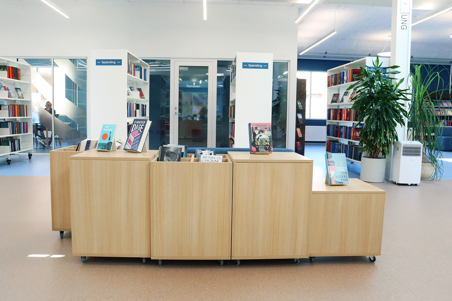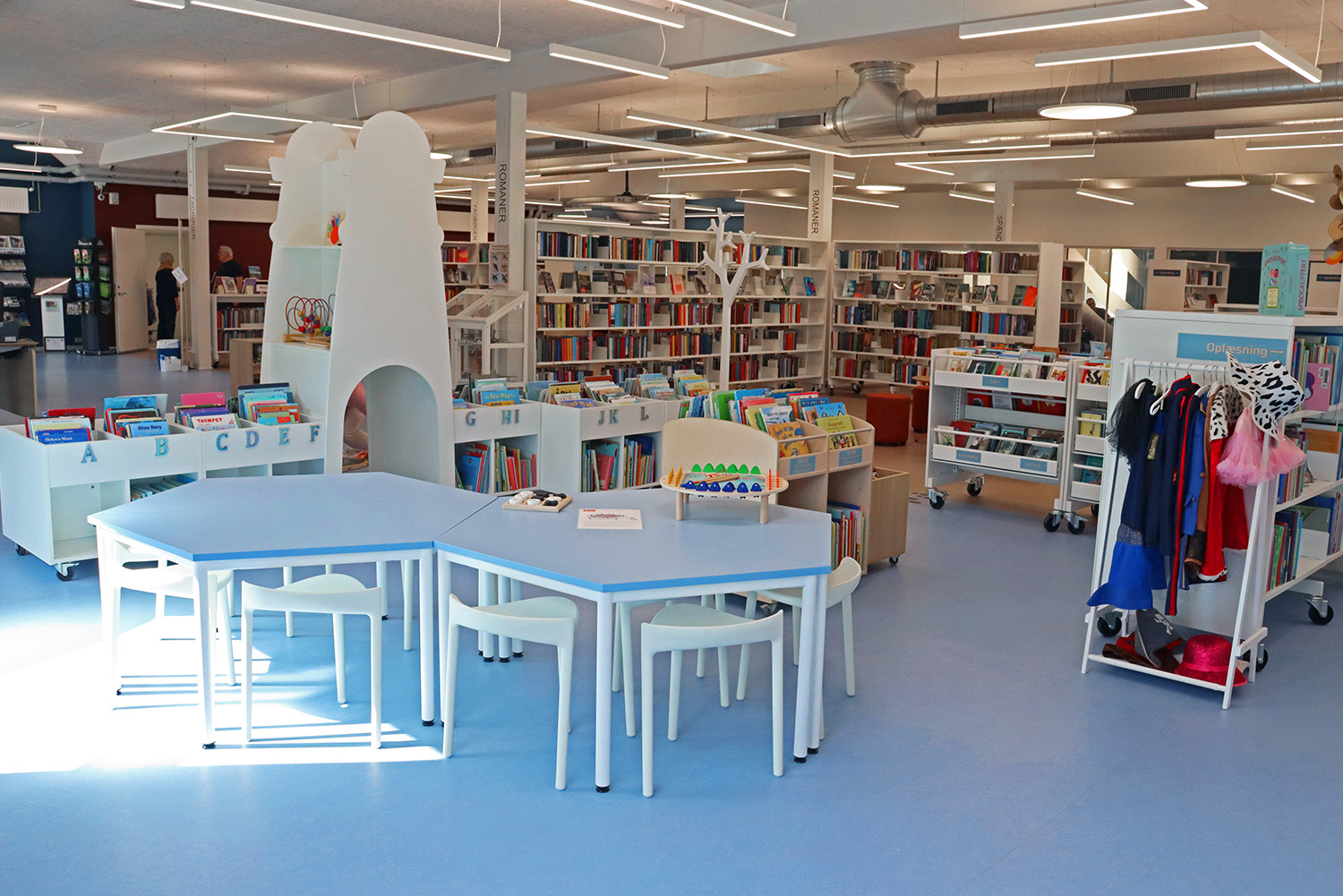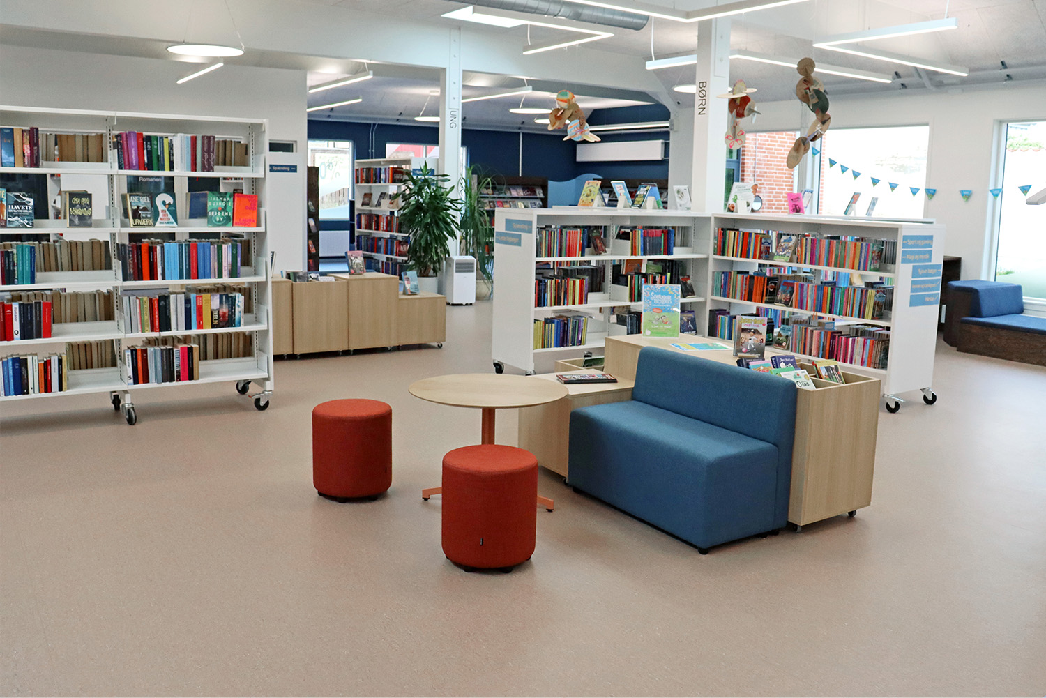 Son design sur-mesure puise son inspiration dans le patrimoine maritime de Kerteminde, avec le navire de Ladby comme point central du thème de la bibliothèque. Une palette apaisante de bleu et de blanc crée une atmosphère accueillante pour les visiteurs de tous âges. La bibliothèque est intelligemment divisée en plusieurs zones distinctes, proposant aussi bien des espaces de lecture silencieux que des espaces créatifs et dynamiques, ainsi qu’une toute nouvelle section dédiée aux enfants. Cette disposition soigneusement réfléchie garantit à chacun de trouver un lieu propice à l’apprentissage et à l’inspiration.