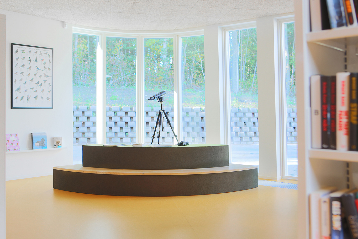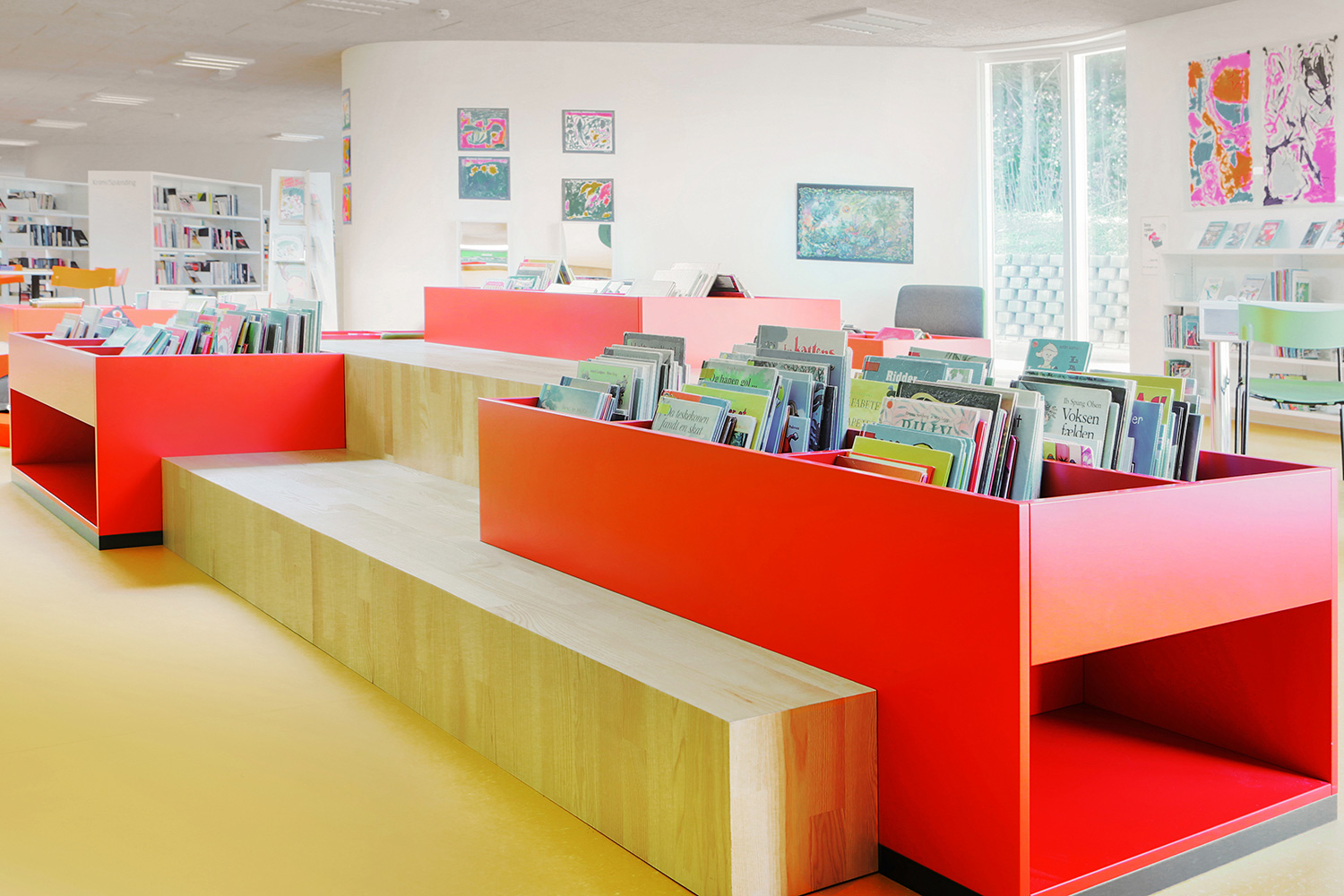 L’architecte d’intérieur, Lykke Jørgin, a d’ailleurs utilisé la nature comme thème principal pour la décoration intérieure de la bibliothèque. Par exemple, du mobilier en frêne conçu spécialement pour ce projet est disposé le long des sections de fenêtre, pour une utilisation optimale de la lumière du jour. Une plateforme panoramique sur mesure et recouverte d’un tapis de feutre offre la possibilité d’admirer la nature en se sentant au plus près de celle-ci. Les teintes verdoyantes se déclinent également à l’intérieur de la bibliothèque et se marient joliment avec les autres couleurs vitaminées (jaune et orange).