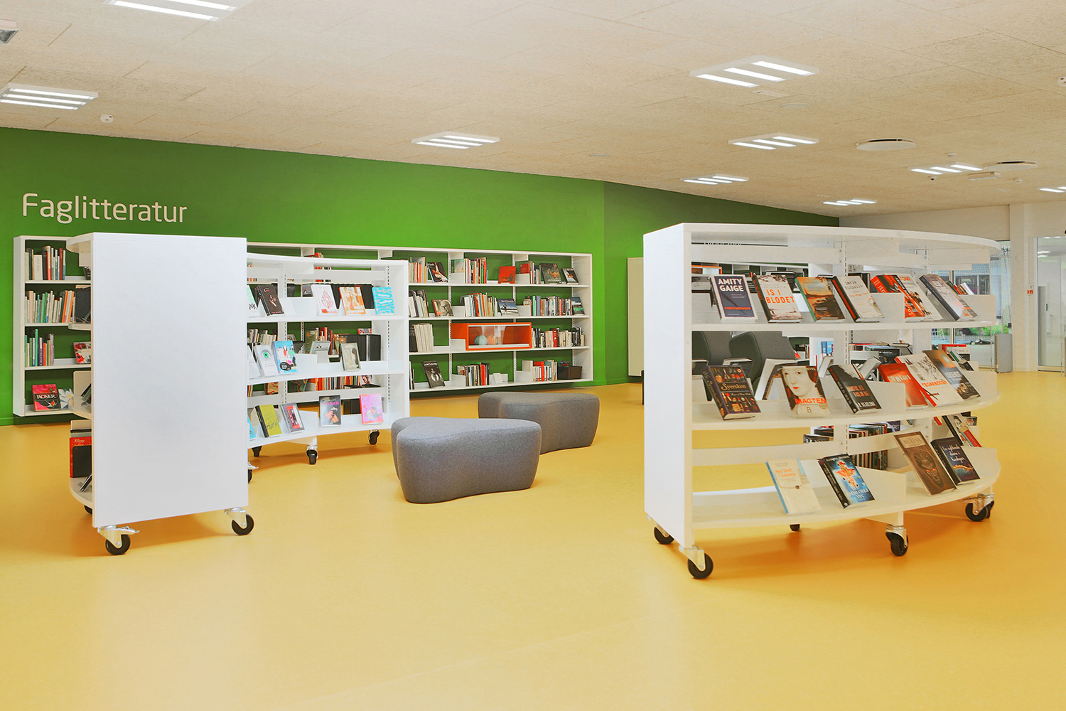 La bibliothèque publique de Tommerup est établie au cœur du « Lighthouse Tommerup » (« Fyrtårn Tommerup »), le nouveau centre culturel et sportif de la ville. Les lignes fluides du bâtiment font également la part belle à la nature environnante, que l’on peut admirer depuis de grandes fenêtres arquées.
