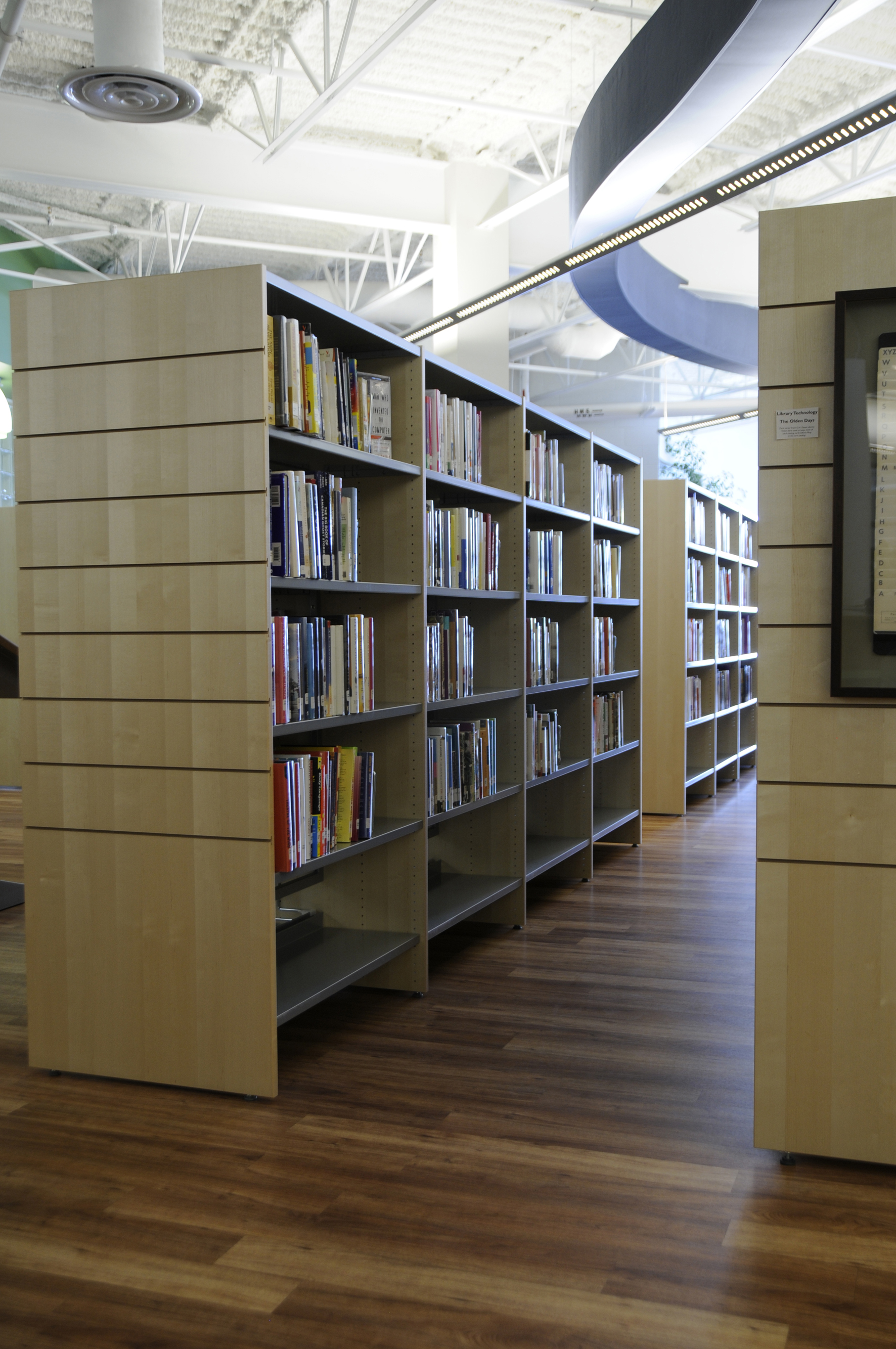 Si la nouvelle bibliothèque est à présent dotée des équipements technologiques de pointe, tels que des bornes d’emprunt en libre service, des bornes OPAC ou encore des puces RFID pour l’ensemble de la collection, son agencement a été conçu de manière à créer un véritable espace dédié à la détente. Le mouvement curviligne de la façade en murs rideaux, le vitrage intérieur et les panneaux acoustiques flottants de forme arrondie également créent une atmosphère propice au calme et au travail. Des locaux cloisonnés accueillant différentes activités sont disposés de part et d’autre d’un vaste espace ouvert et les espaces adjacents offrent tous une jolie vue sur la bibliothèque.