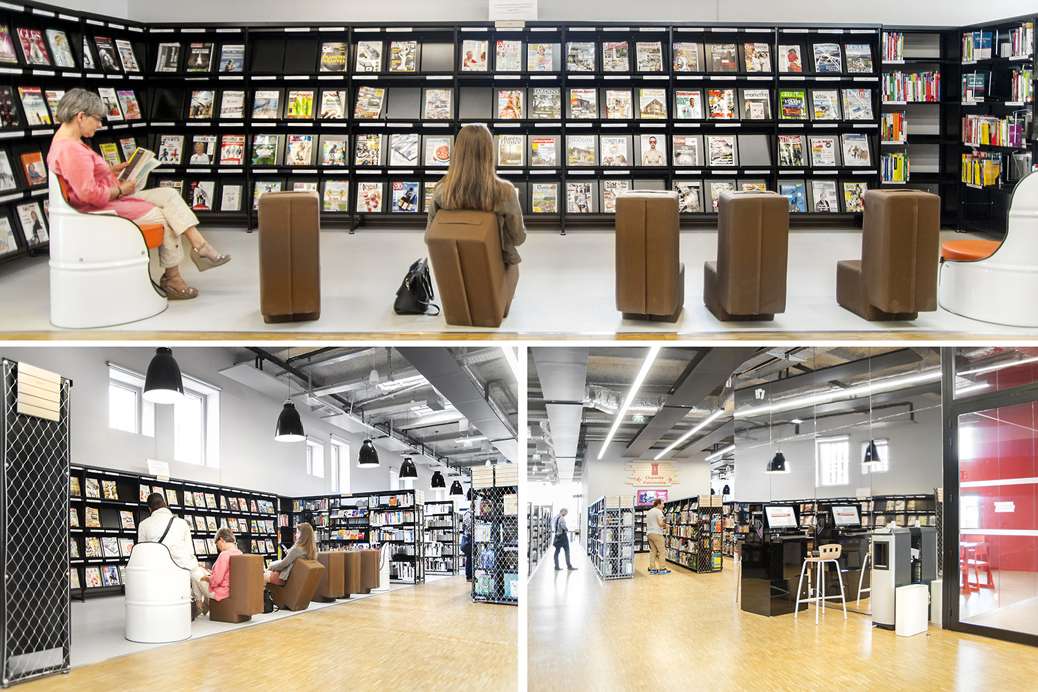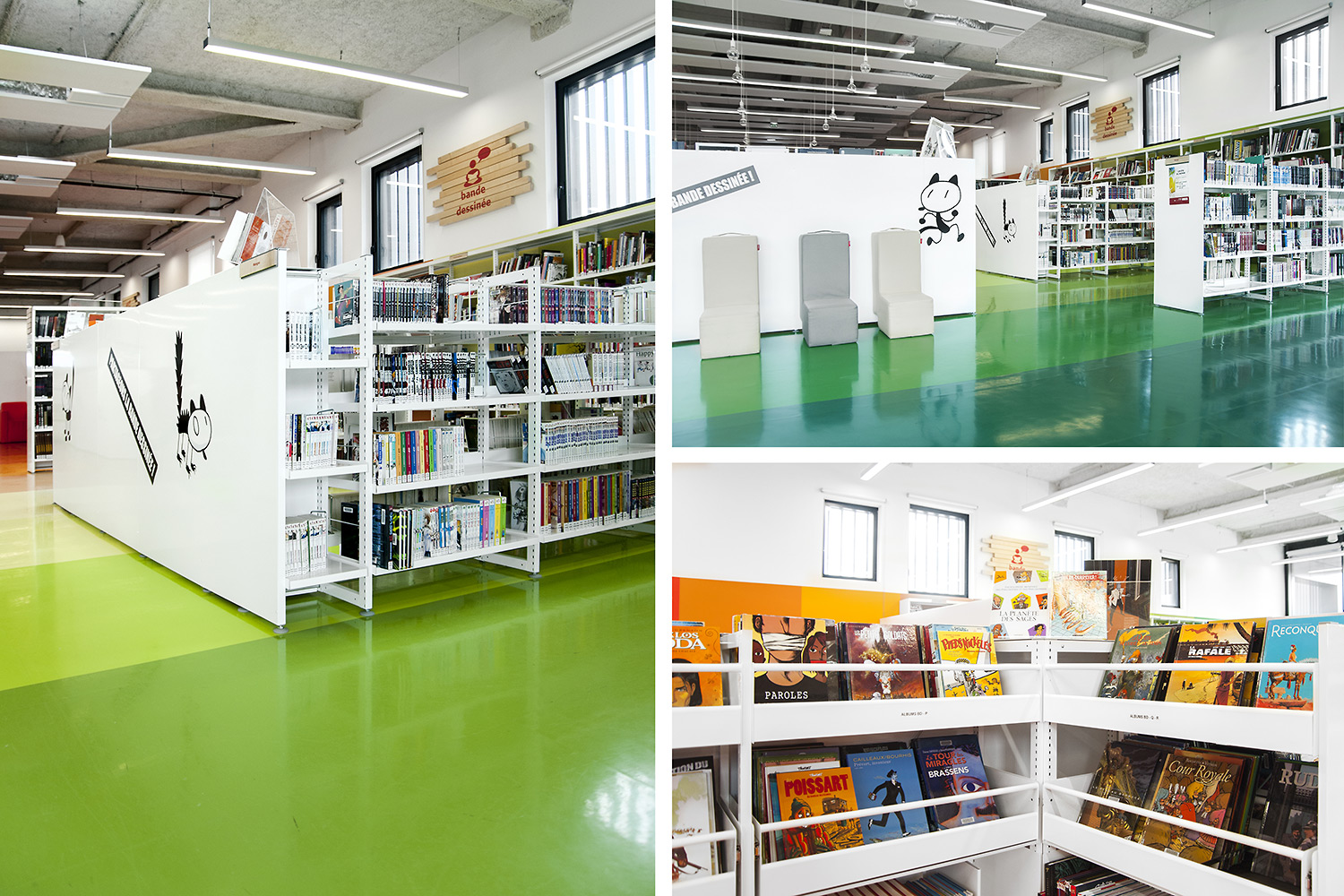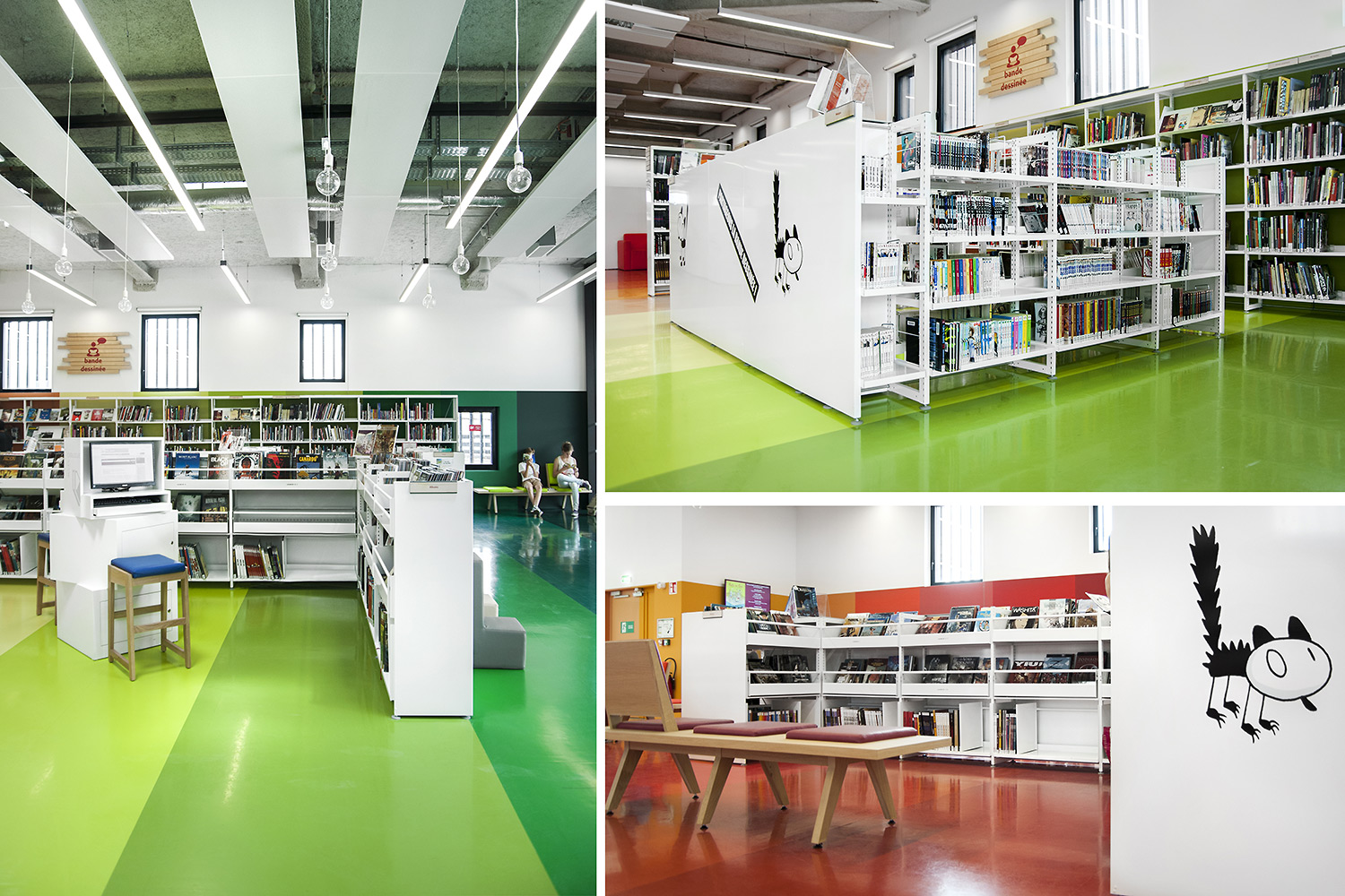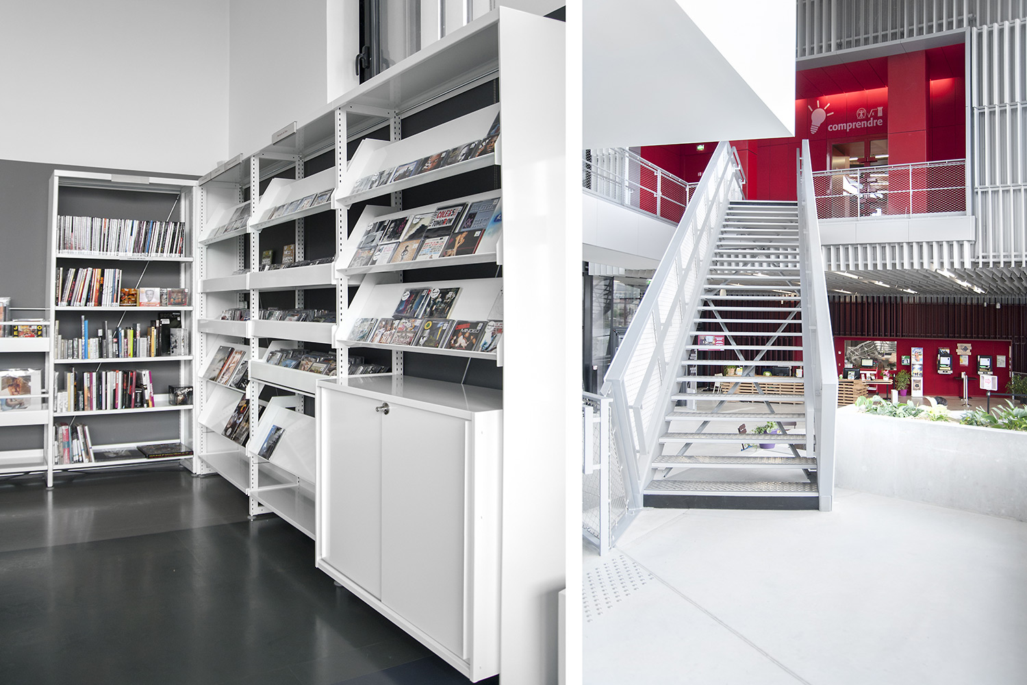 La bibliothèque se déploie autour de 3 « mondes » : « Imaginer », « Créer » et « Comprendre ». « Créer » est un espace dédié à la bande dessinée, au cinéma, à la musique et aux arts sous toutes leurs formes. « Comprendre » couvre les principaux domaines de la connaissance, propose un espace et des collections dédiés au patrimoine écrit et à l’histoire charentaise, et offre des espaces privés et collectifs pour la lecture et l’étude. Le monde « Imaginer », enfin, rassemble l’espace enfance et littérature, et donne accès au jardin intérieur et à l’auditorium.