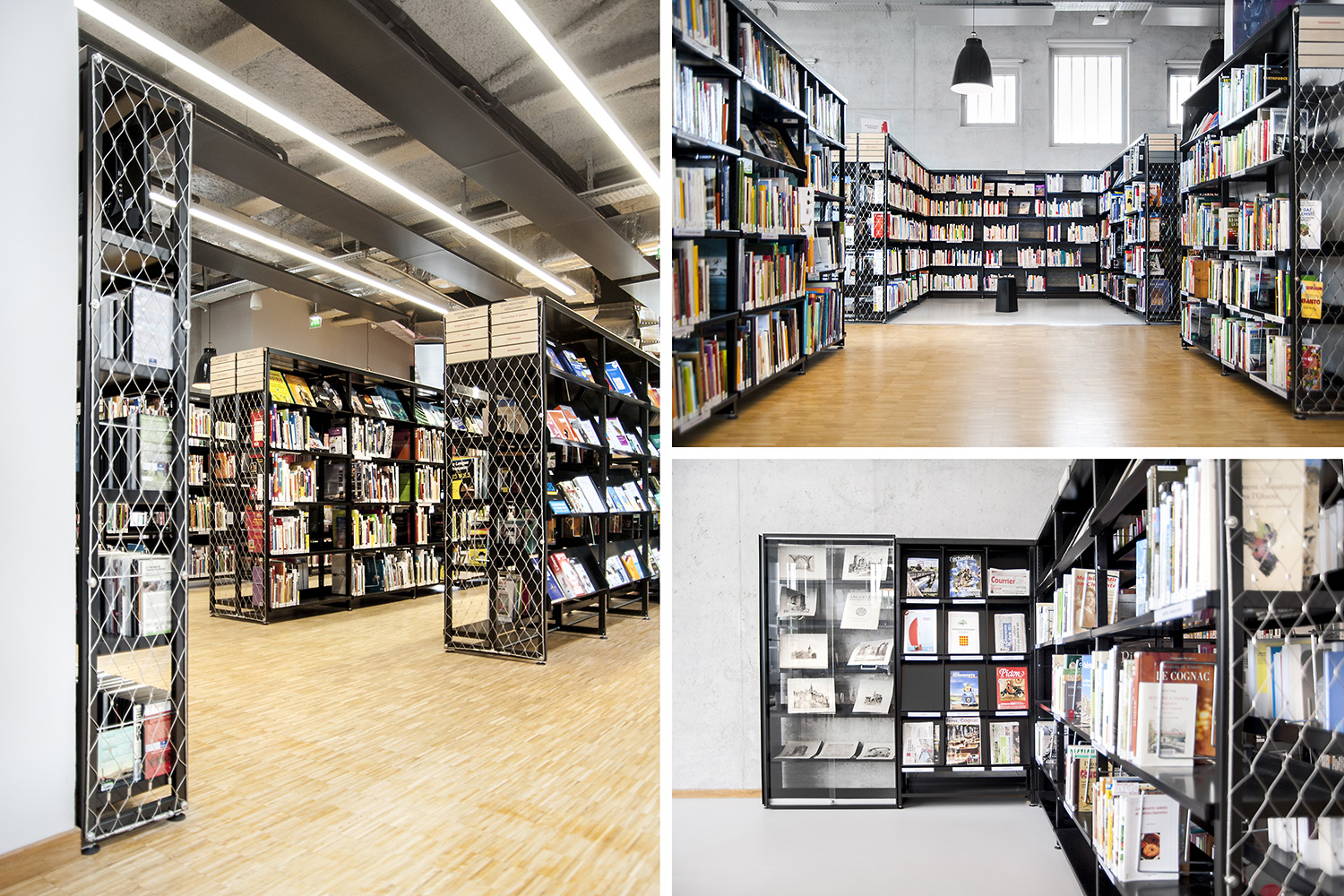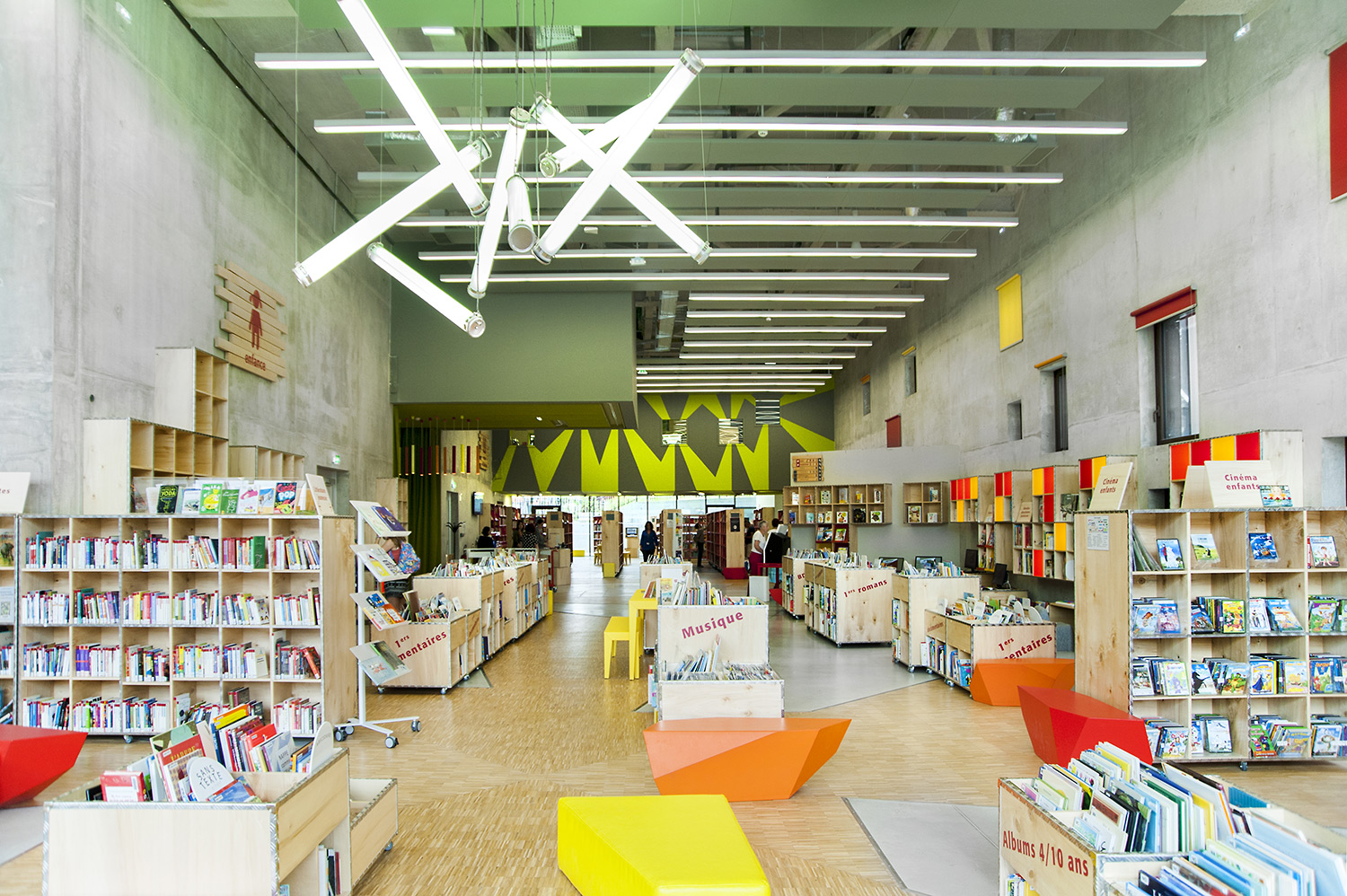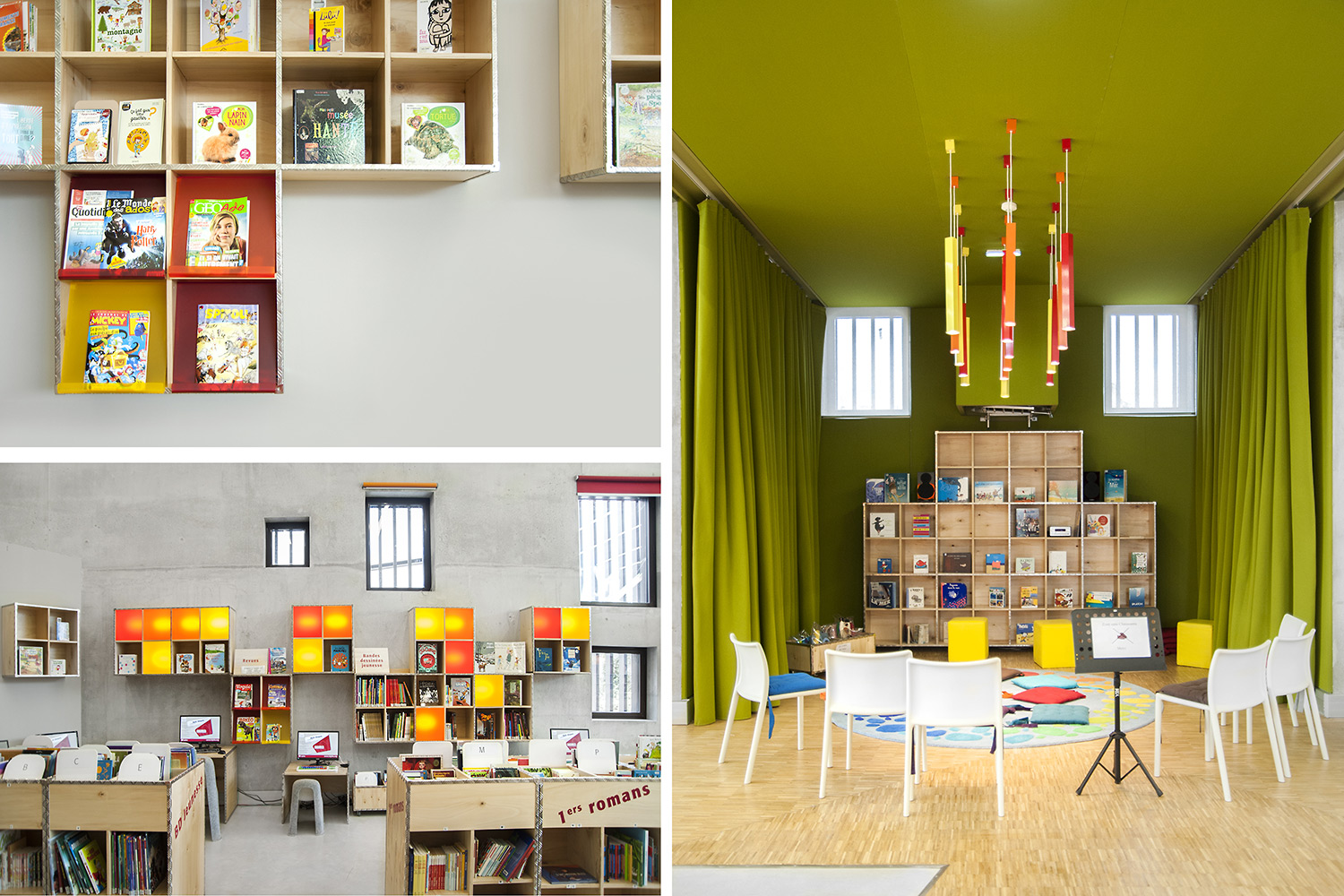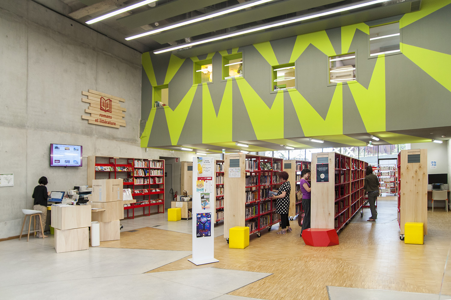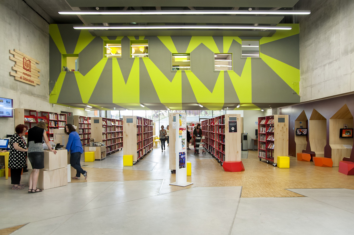 La bibliothèque se déploie autour de 3 « mondes » : « Imaginer », « Créer » et « Comprendre ». « Créer » est un espace dédié à la bande dessinée, au cinéma, à la musique et aux arts sous toutes leurs formes. « Comprendre » couvre les principaux domaines de la connaissance, propose un espace et des collections dédiés au patrimoine écrit et à l’histoire charentaise, et offre des espaces privés et collectifs pour la lecture et l’étude. Le monde « Imaginer », enfin, rassemble l’espace enfance et littérature, et donne accès au jardin intérieur et à l’auditorium.