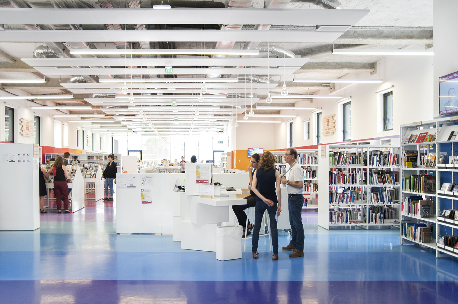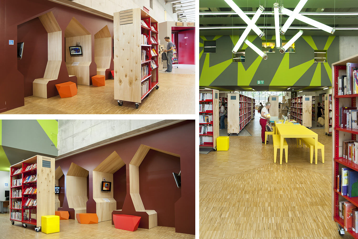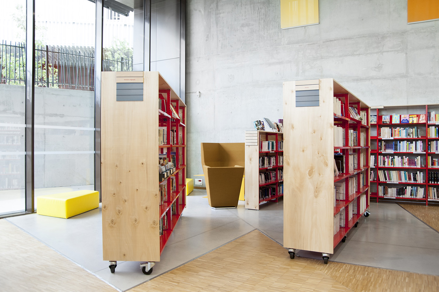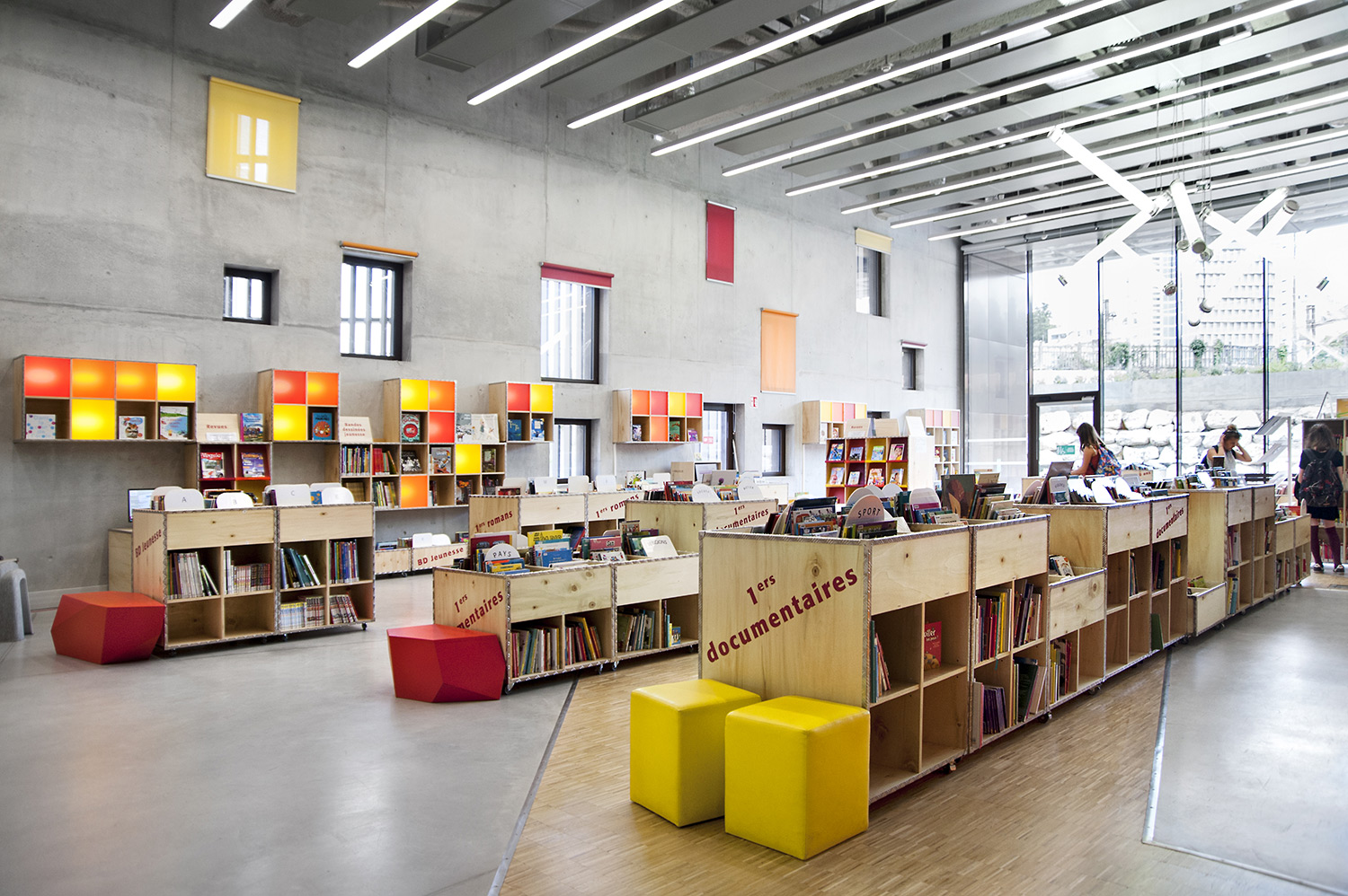 La bibliothèque se déploie autour de 3 « mondes » : « Imaginer », « Créer » et « Comprendre ». « Créer » est un espace dédié à la bande dessinée, au cinéma, à la musique et aux arts sous toutes leurs formes. « Comprendre » couvre les principaux domaines de la connaissance, propose un espace et des collections dédiés au patrimoine écrit et à l’histoire charentaise, et offre des espaces privés et collectifs pour la lecture et l’étude. Le monde « Imaginer », enfin, rassemble l’espace enfance et littérature, et donne accès au jardin intérieur et à l’auditorium.