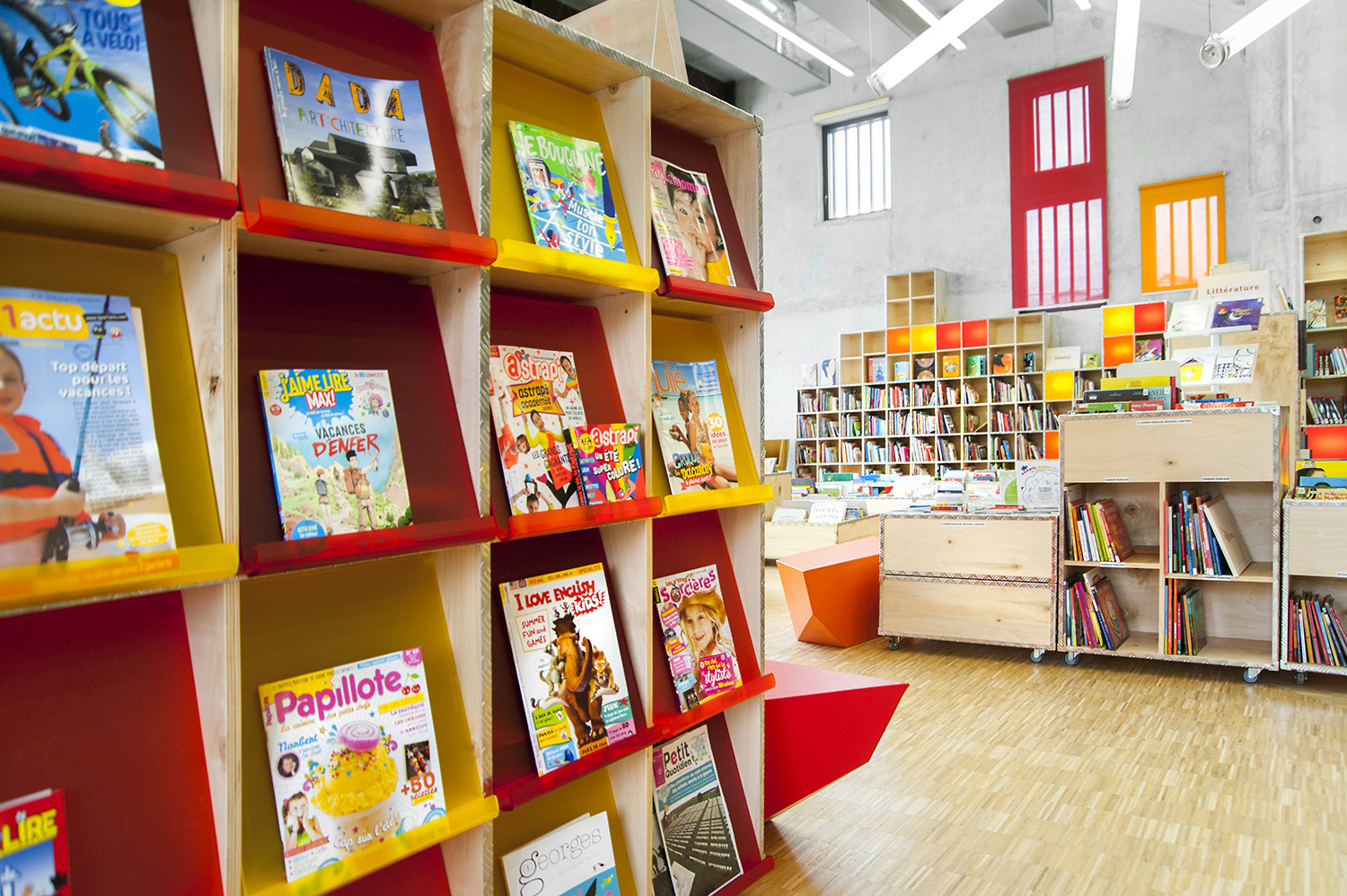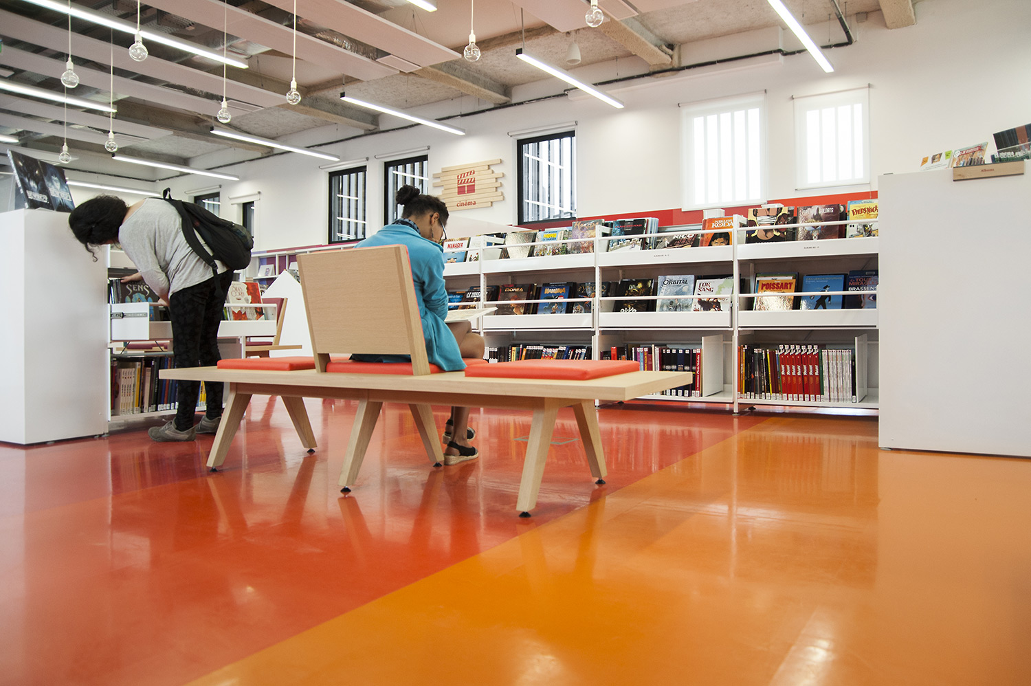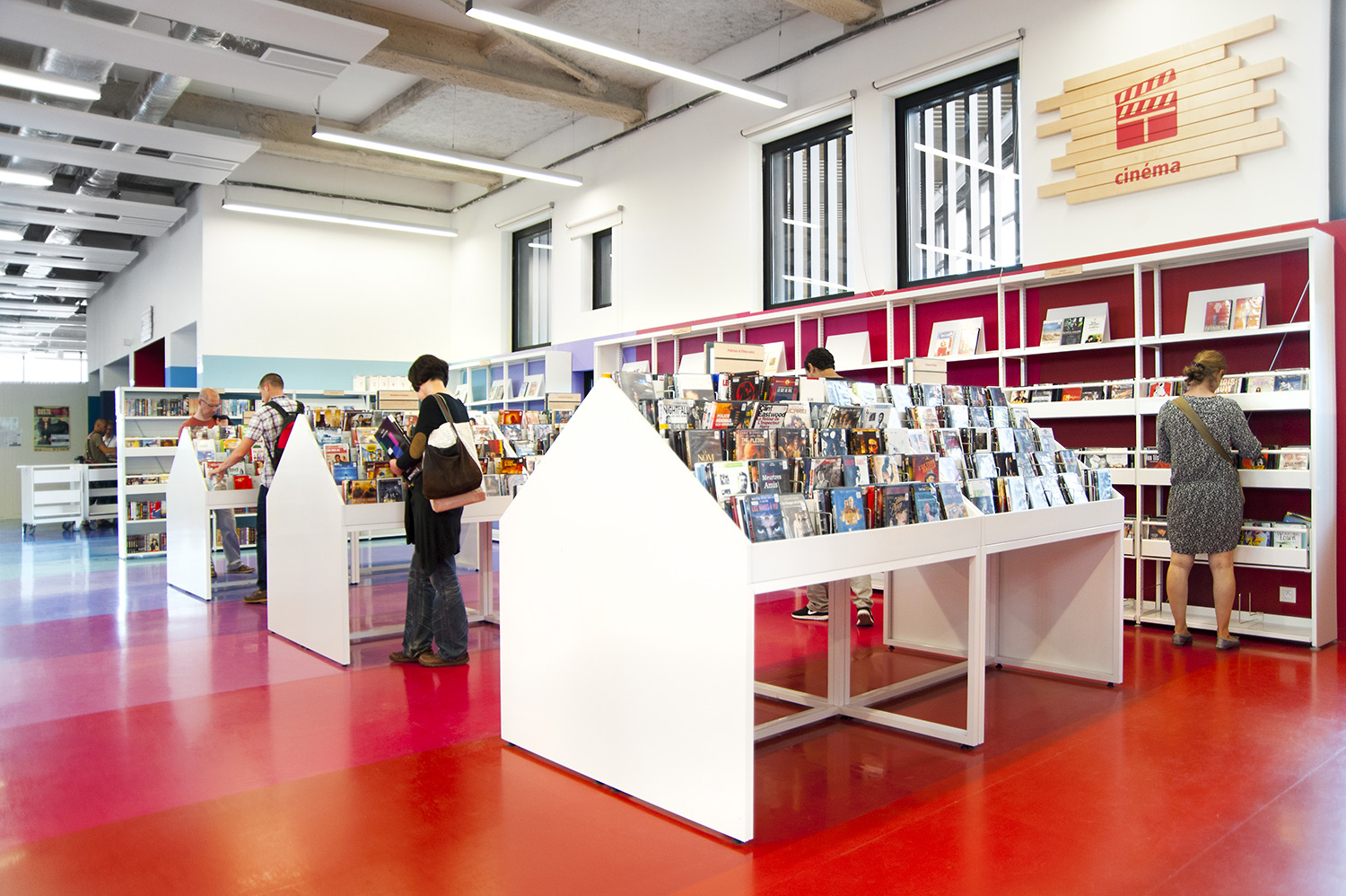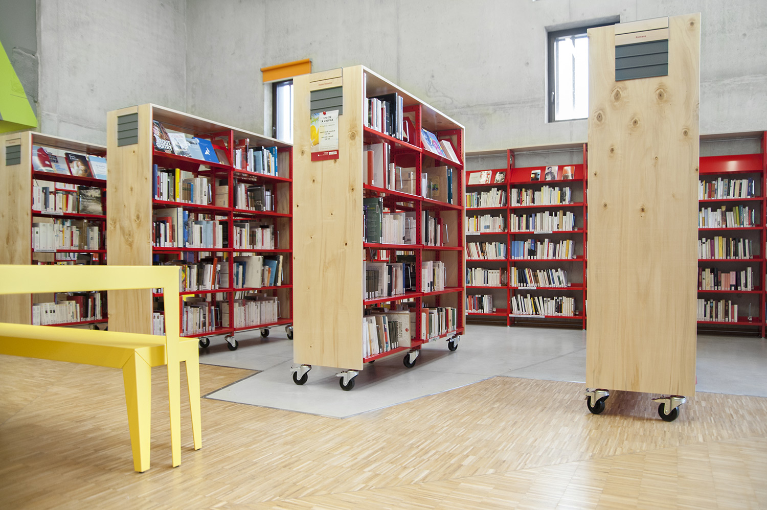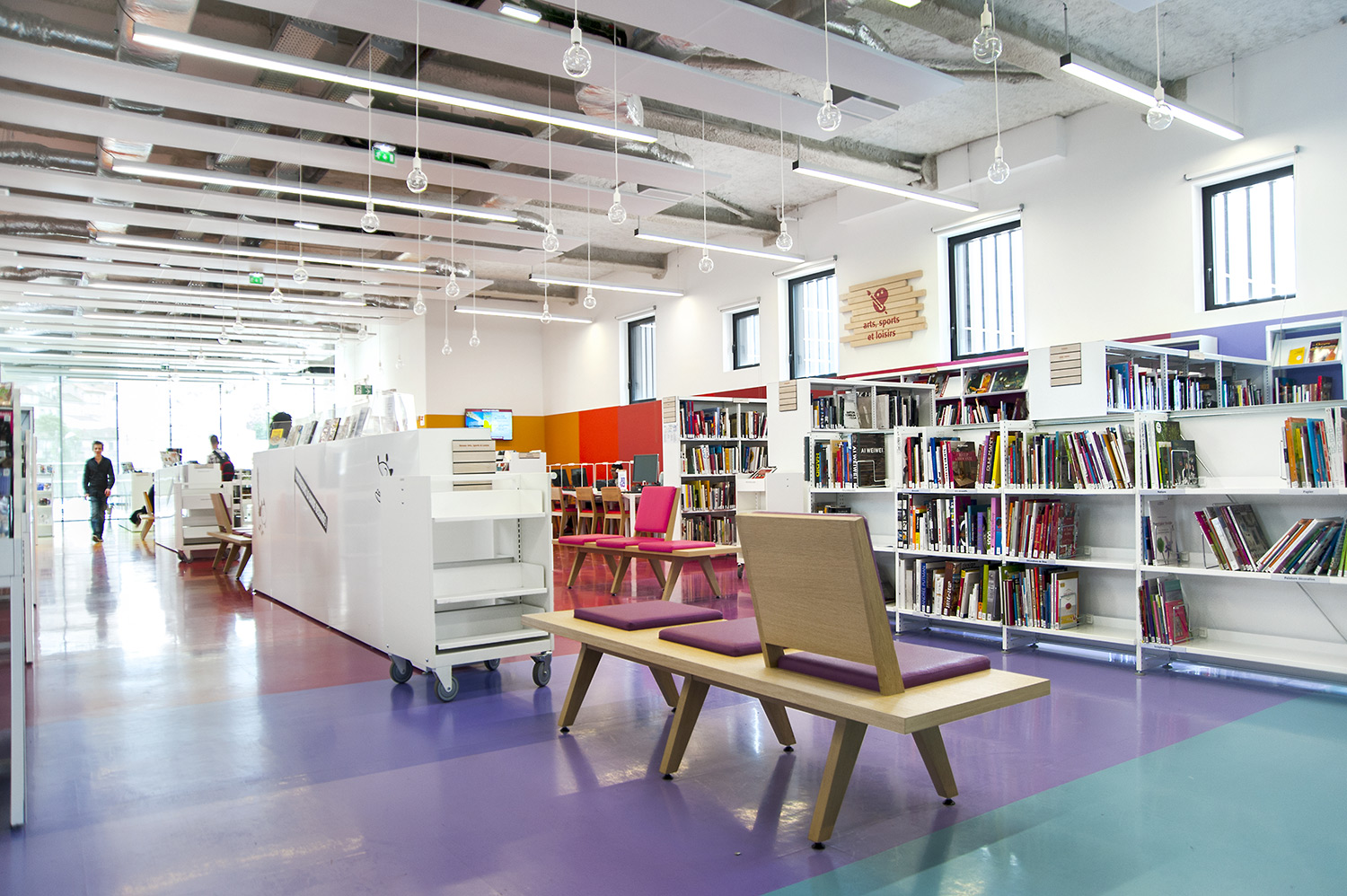 La bibliothèque se déploie autour de 3 « mondes » : « Imaginer », « Créer » et « Comprendre ». « Créer » est un espace dédié à la bande dessinée, au cinéma, à la musique et aux arts sous toutes leurs formes. « Comprendre » couvre les principaux domaines de la connaissance, propose un espace et des collections dédiés au patrimoine écrit et à l’histoire charentaise, et offre des espaces privés et collectifs pour la lecture et l’étude. Le monde « Imaginer », enfin, rassemble l’espace enfance et littérature, et donne accès au jardin intérieur et à l’auditorium.