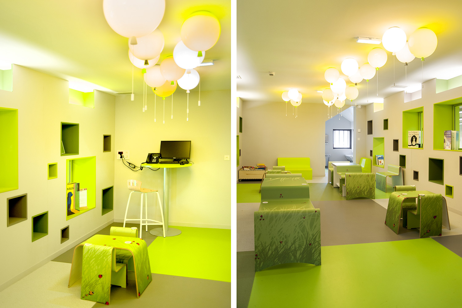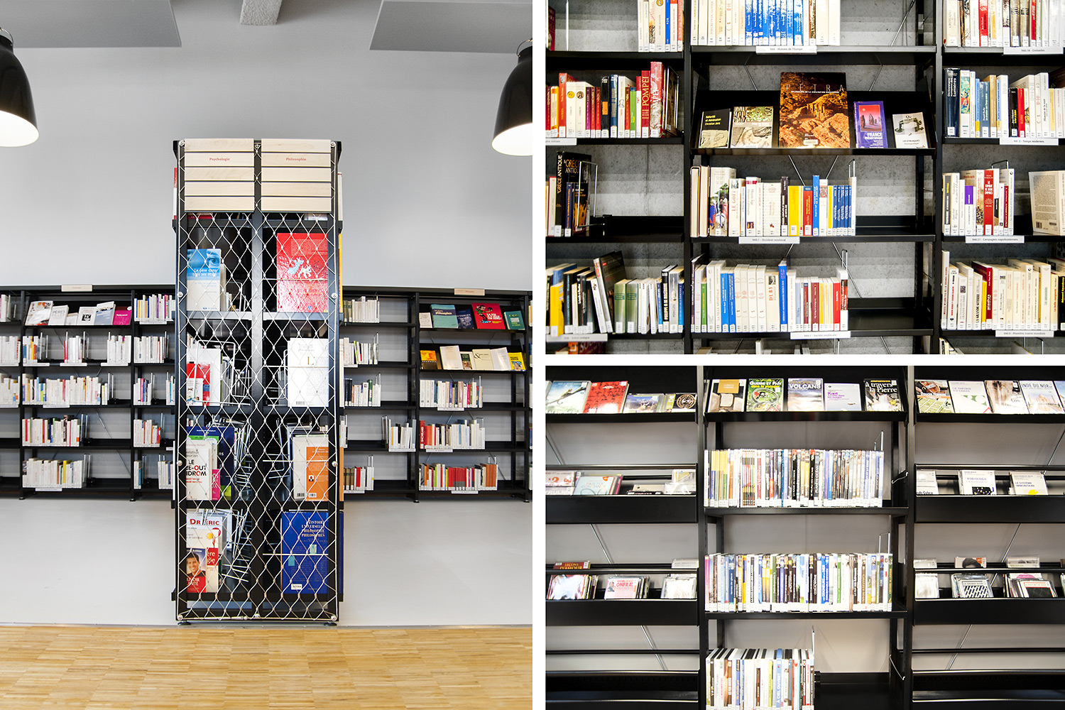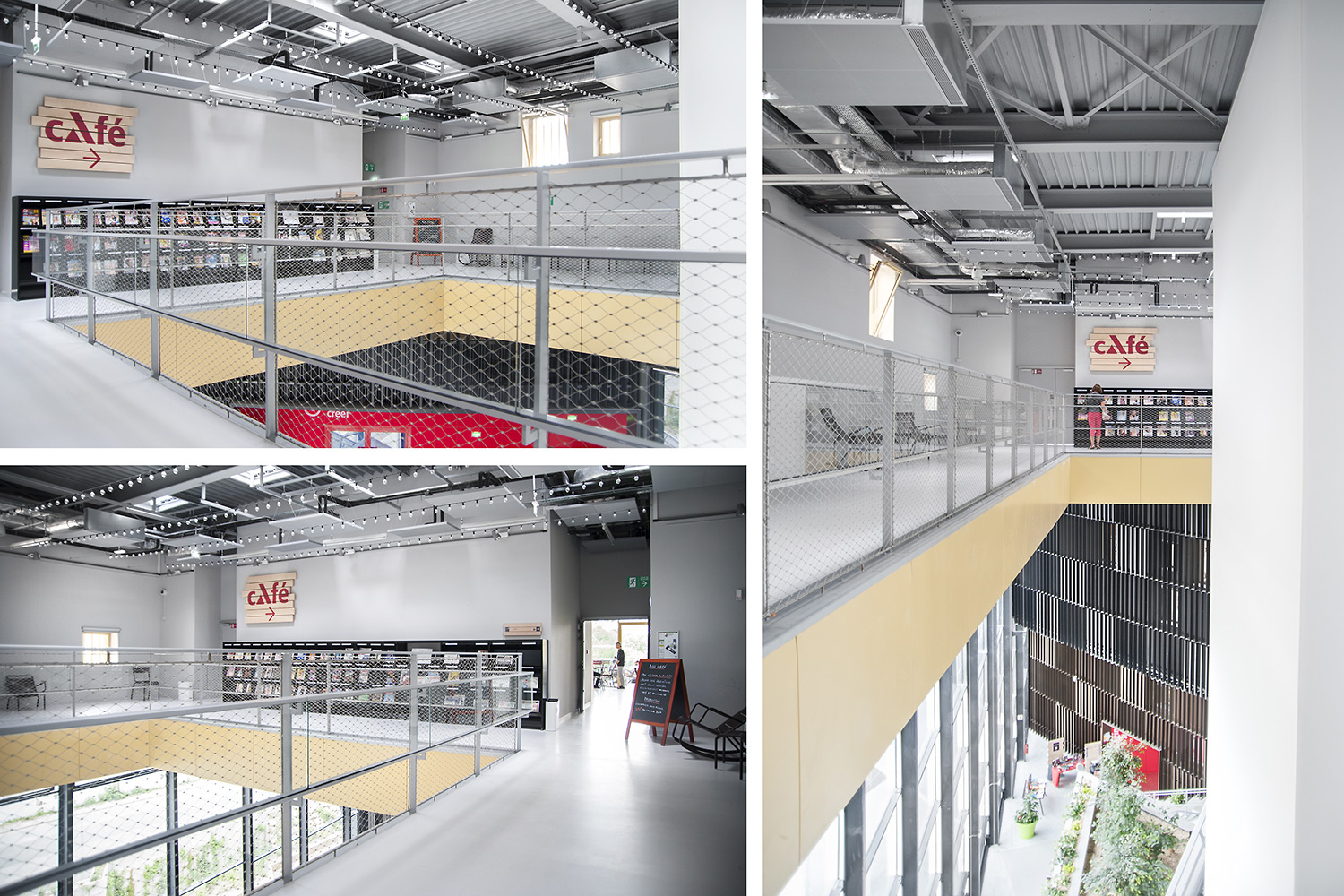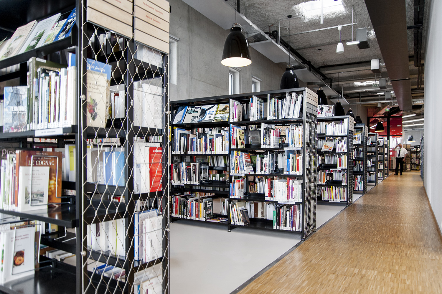 La bibliothèque se déploie autour de 3 « mondes » : « Imaginer », « Créer » et « Comprendre ». « Créer » est un espace dédié à la bande dessinée, au cinéma, à la musique et aux arts sous toutes leurs formes. « Comprendre » couvre les principaux domaines de la connaissance, propose un espace et des collections dédiés au patrimoine écrit et à l’histoire charentaise, et offre des espaces privés et collectifs pour la lecture et l’étude. Le monde « Imaginer », enfin, rassemble l’espace enfance et littérature, et donne accès au jardin intérieur et à l’auditorium.