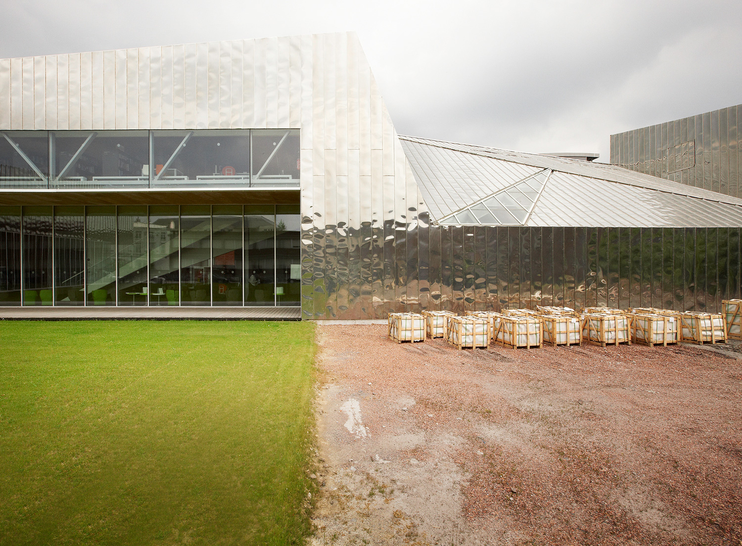 Le toit, réalisé en tôles d’acier inoxydable brillantée et recuites constitue une enveloppe horizontale ondulée, comportant divers replis afin de répondre aux contraintes de perspective et de niveau sur les différentes dénivelées. Pour les architectes, le style est une forme de narration et d’expressionisme appropriée à une interprétation formelle, mais sans faire l’objet d’une rigueur trop théorique.
