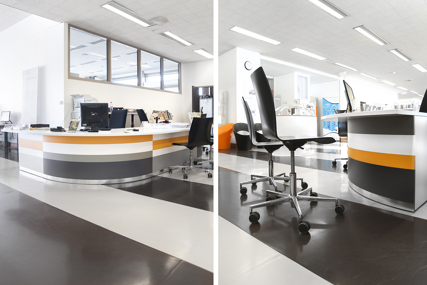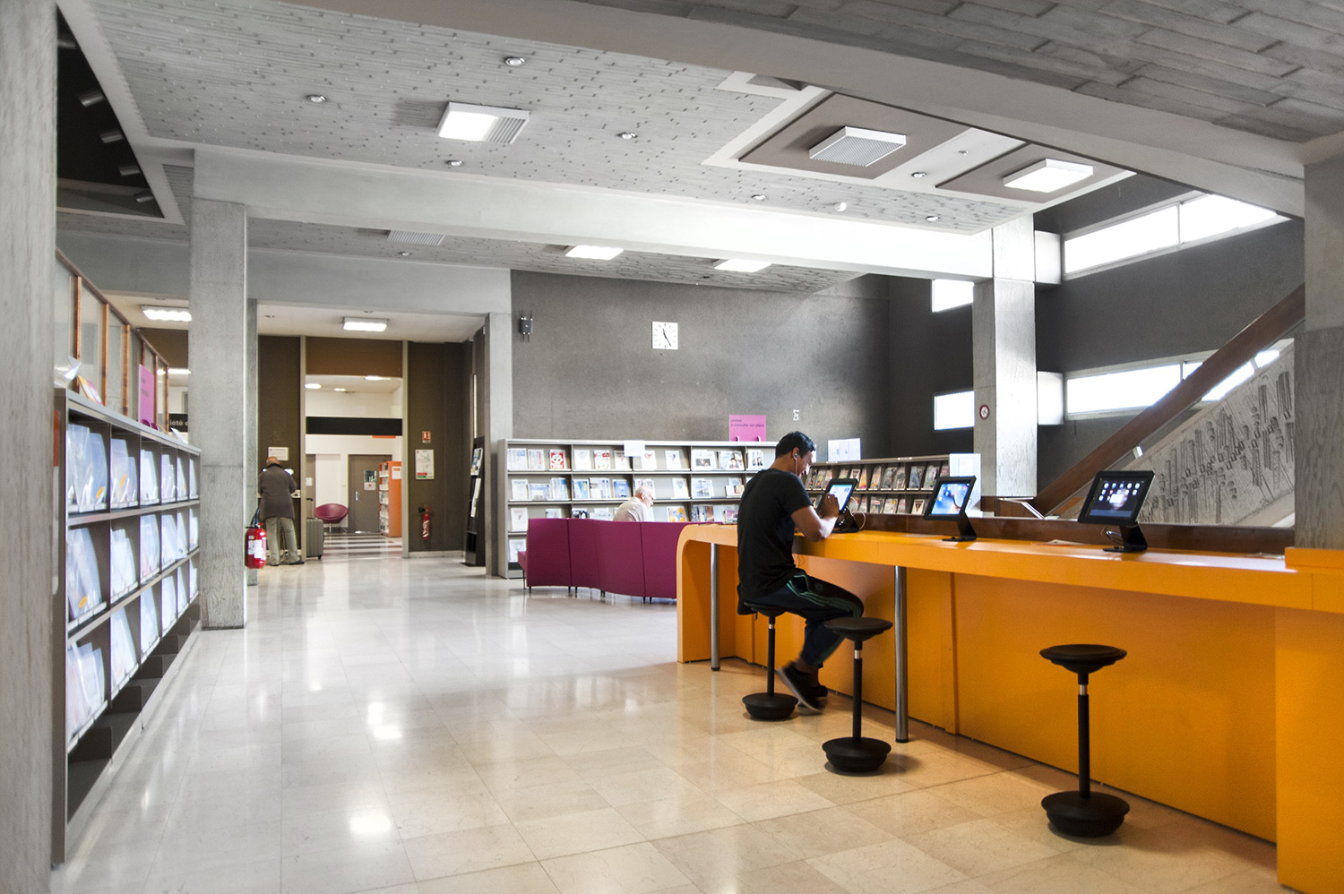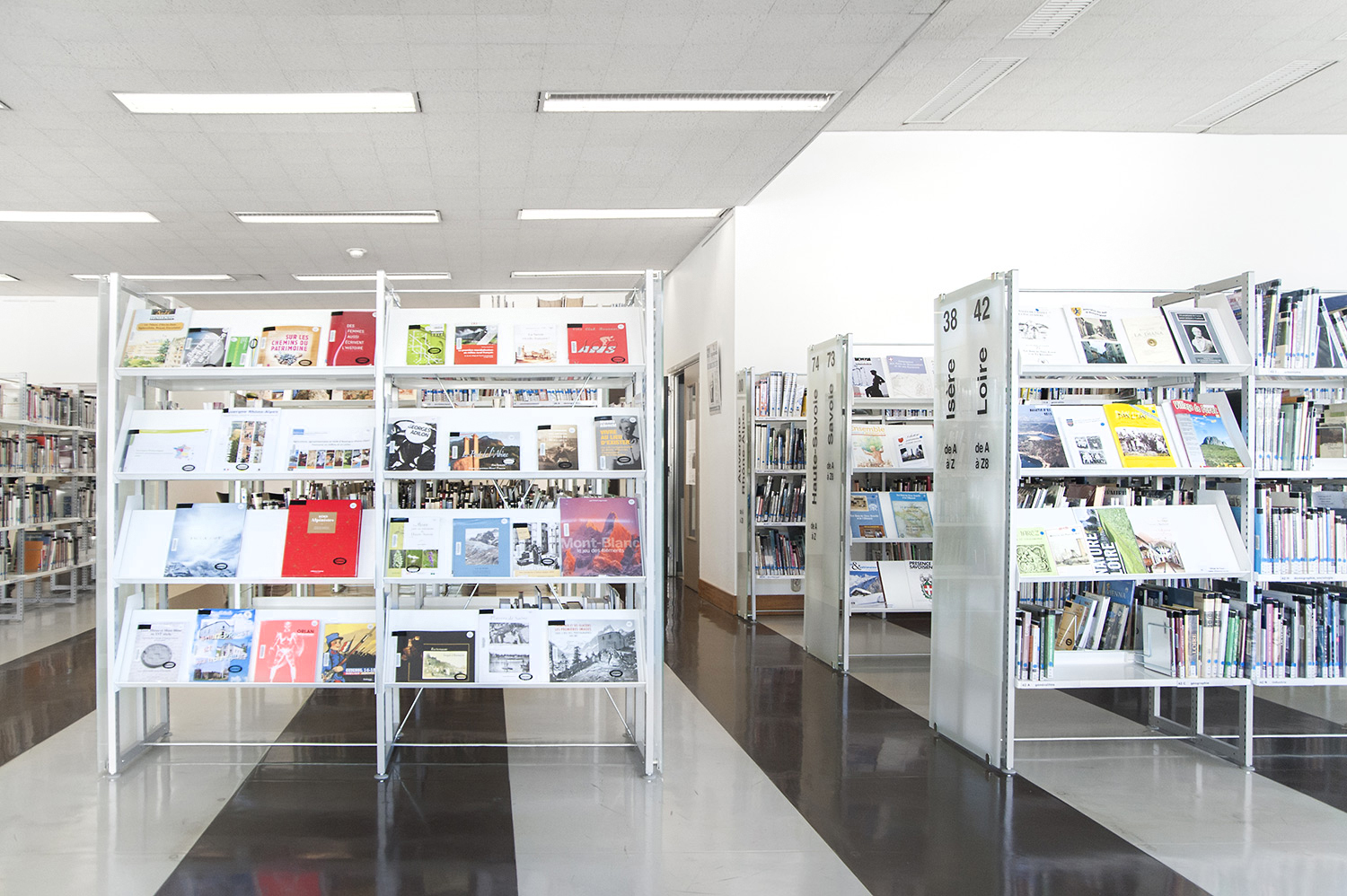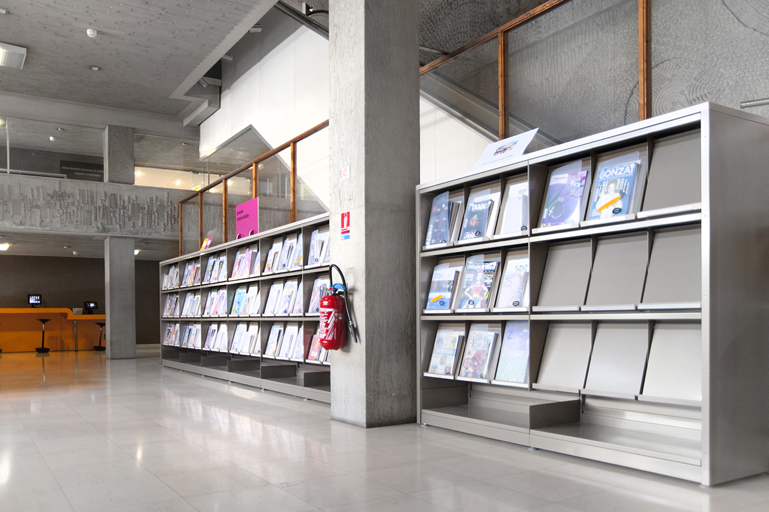 Le mobilier installé inclut notamment la gamme de rayonnages Classic London, droit et courbe, la gamme Opal verre, les banques d’accueil, des postes de travail, du mobilier de présentation et du mobilier de confort. Fonctionnel et esthétique le mobilier joue son rôle dans l’amélioration du confort général, des utilisateurs comme du personnel.