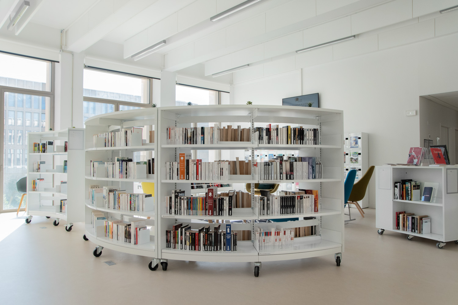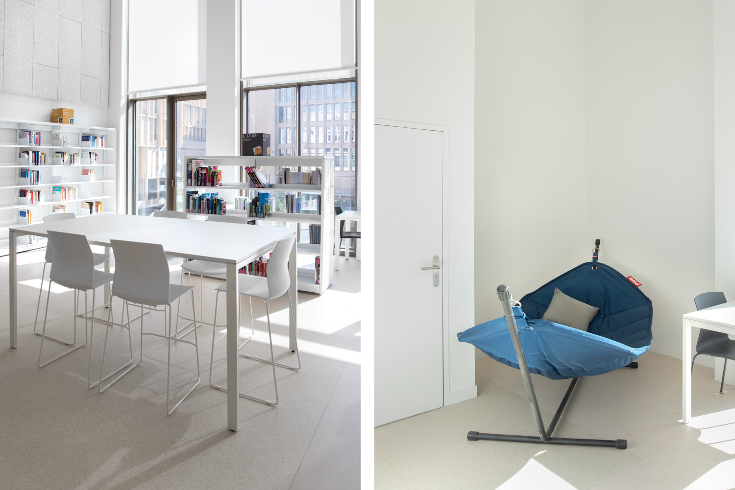Cette bibliothèque est très appréciée et fréquentée par ses usagers, la proposition de mobilier éclectique contribue à cet attrait (tables – certaines avec boîtiers de connexion - de différentes tailles et hauteurs ; alcôves ; hamacs ; rocking-chair ; fauteuils et canapés). Les rayonnages sont également différents selon le type de collection qu’ils conservent (classique pour les fonds en sciences exactes ou sociales ; arrondis et bas pour les romans ; à tiroirs pour les romans graphiques ; avec portes pour les magazines grâce au présentoir Ordrup)."
