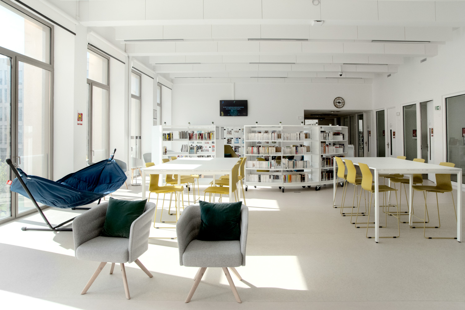 Le CRDN étant particulièrement lumineux et spacieux, le choix a été fait de l’équiper avec du mobilier blanc afin d’intensifier cette lumière. Des notes de bleu et jaune contrastent avec ce blanc et créent ainsi une ambiance chaleureuse et cosy.