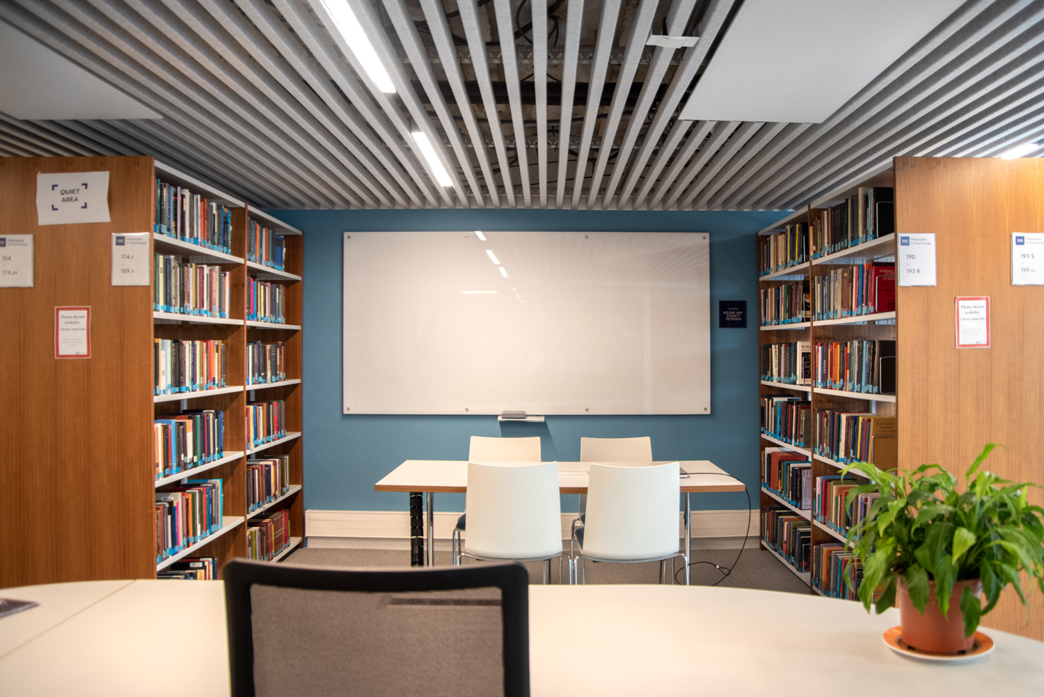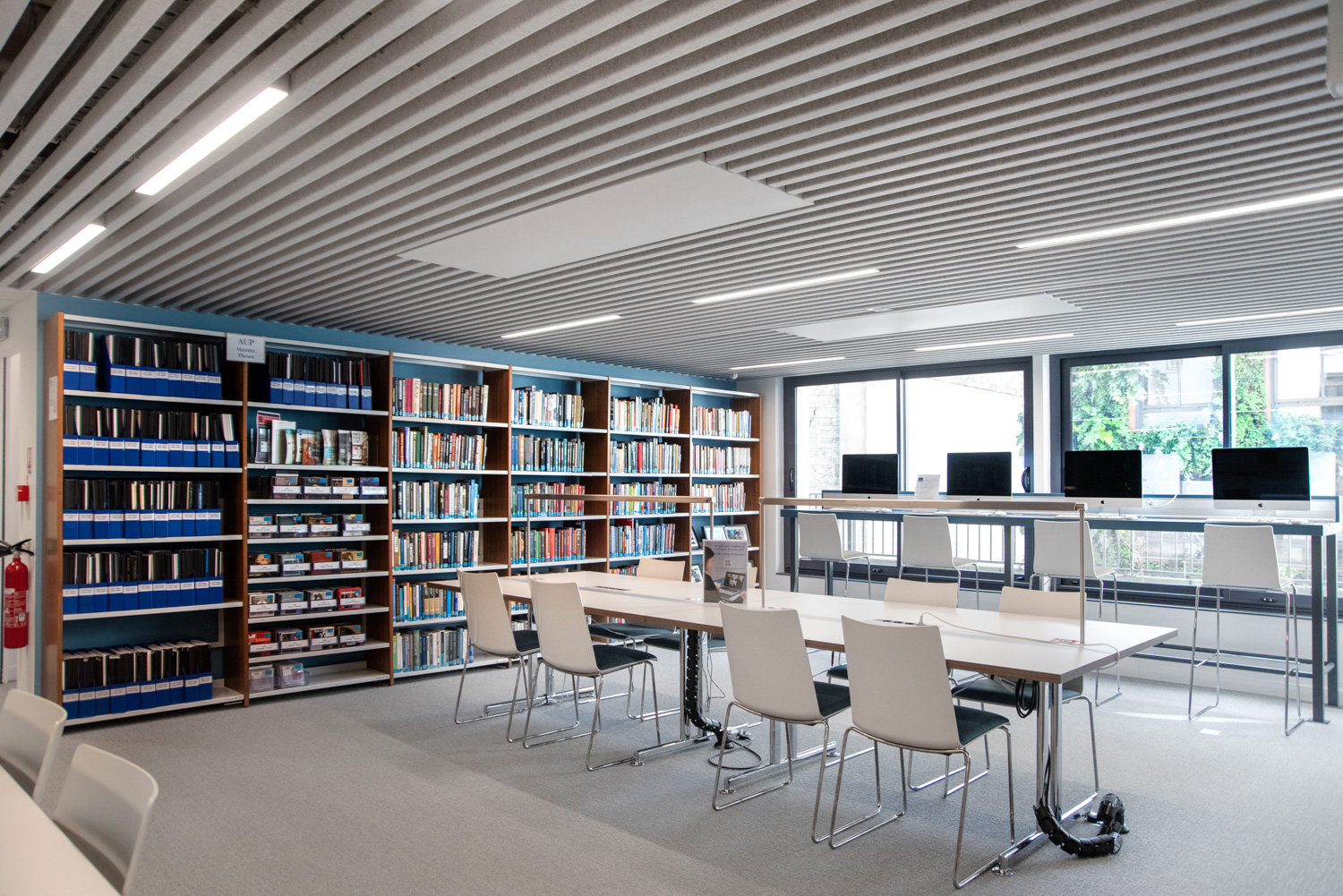 Située au centre de l’école et d’une superficie de 800 m2 environ, la bibliothèque a été complétement réaménagée avec le mobilier de BC Intérieur. Elle se compose de trois grands espaces (salle de travail, salle des ouvrages et salle détente) et de 11 salles de travail collaboratif. Une cafétéria attenante abrite un meuble Cocoon dans lequel les bibliothécaires proposent des dons d’ouvrages et de journaux.