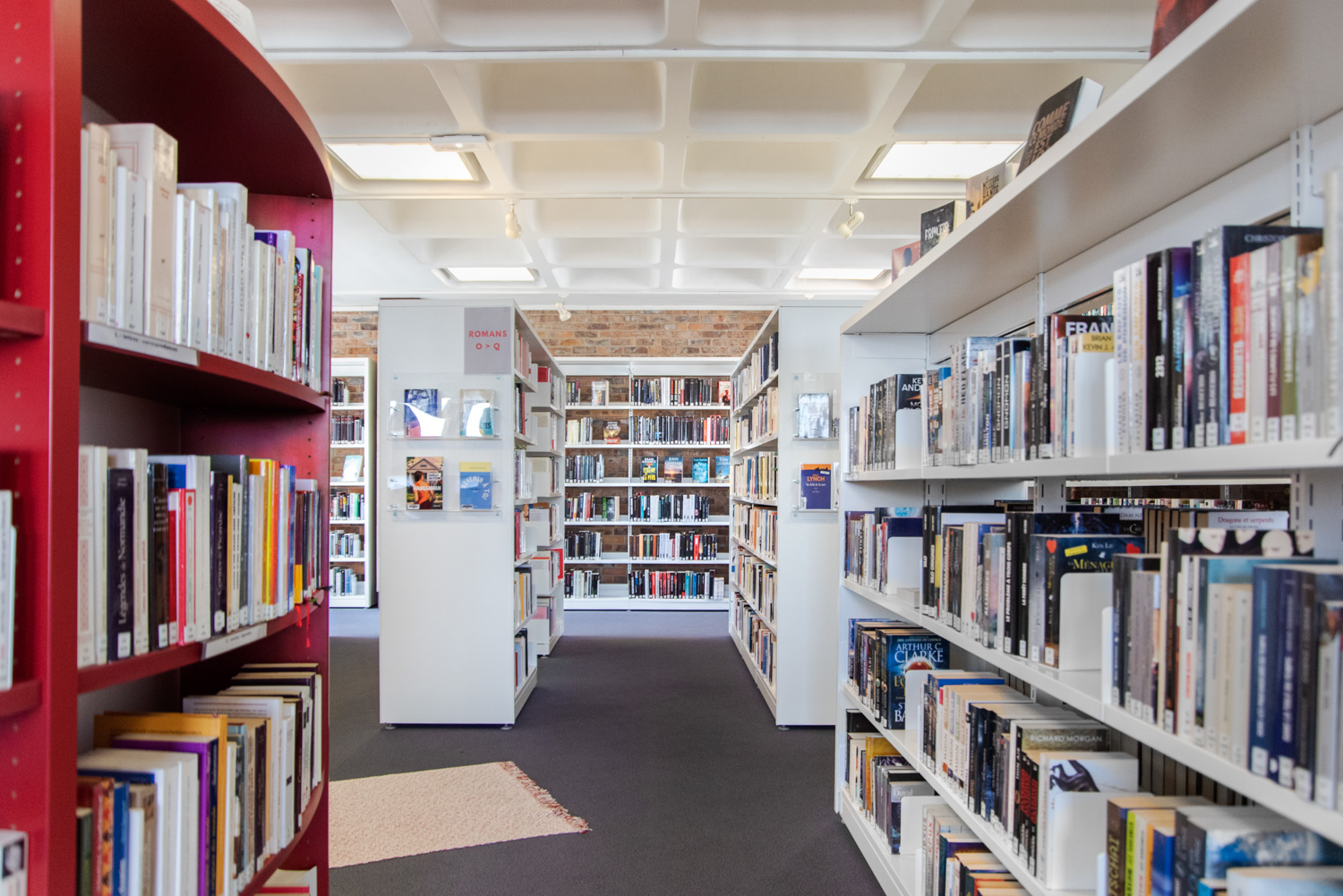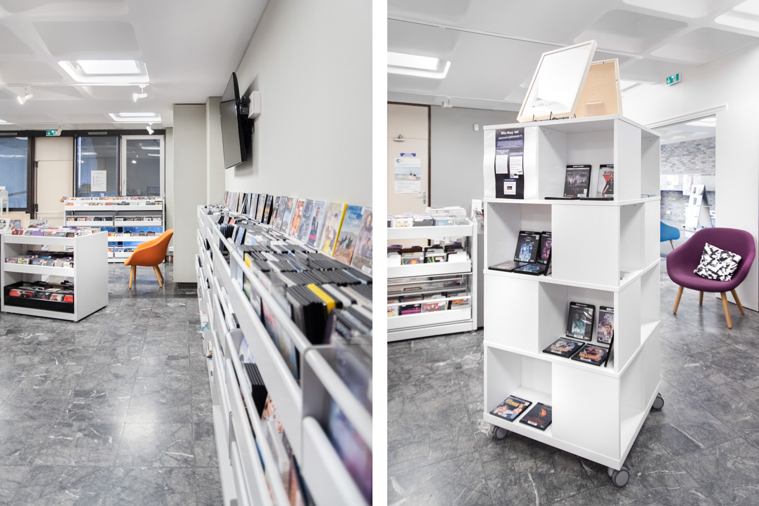 Nous avons également travaillé sur la visibilité interne en diminuant les hauteurs des rayonnages et à l’aide de rayonnages courbes.