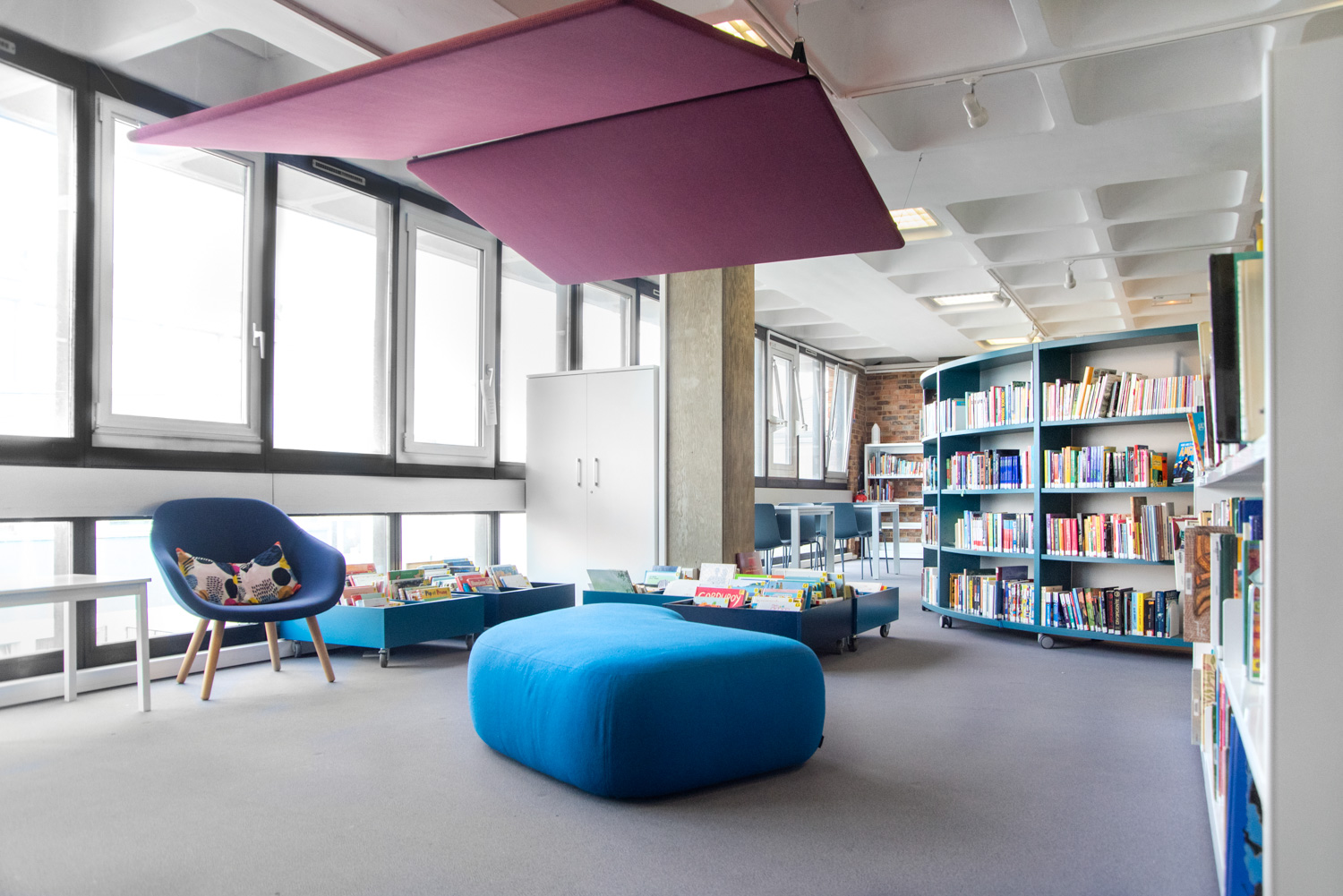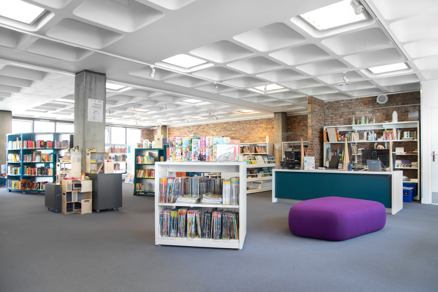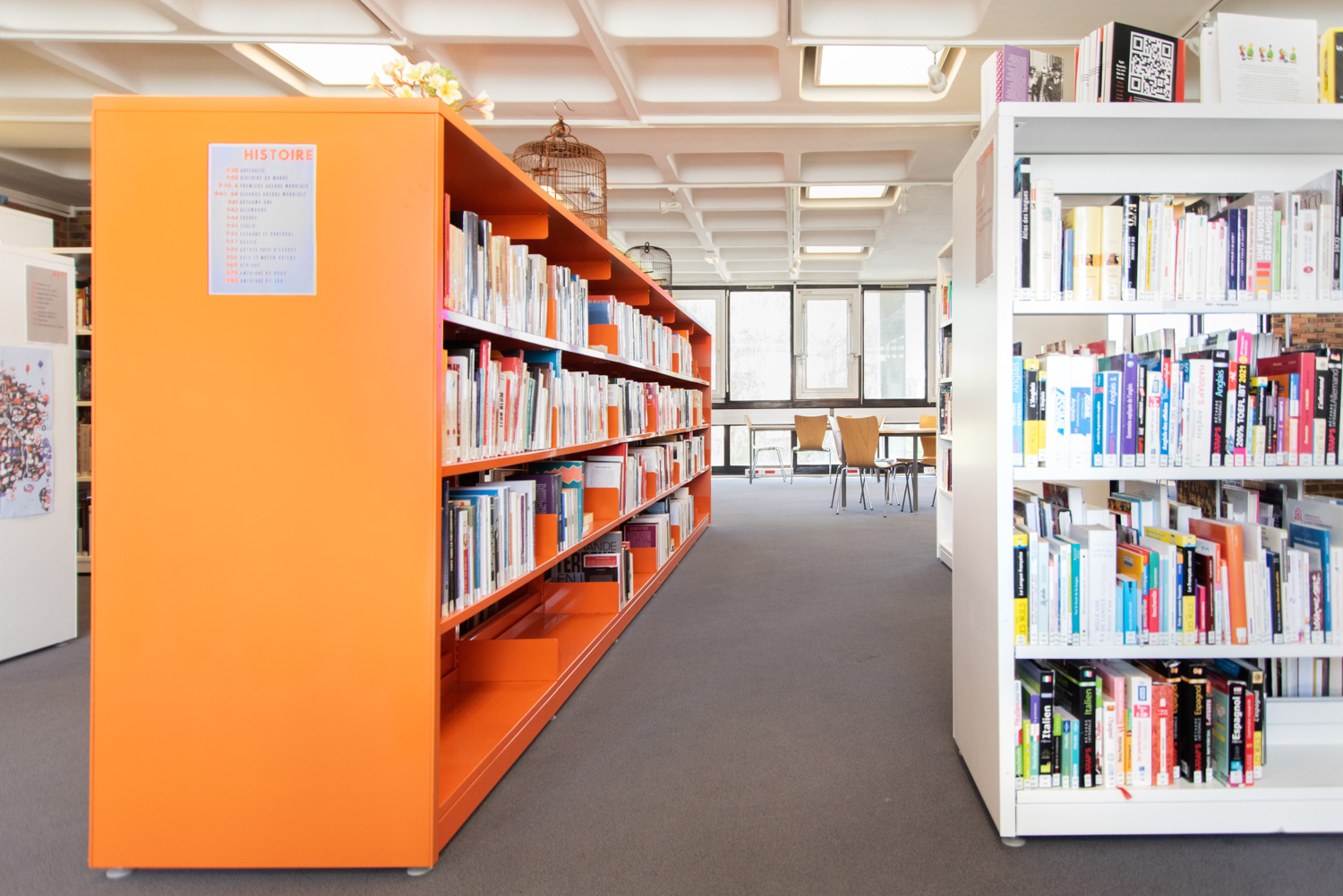 Ce réaménagement a permis de repenser la distribution des espaces au regard des nouveaux usages et comportements du public. Le mobilier des trois plateaux desservis par un escalier central, est à dominante blanche avec une couleur forte qui personnalise chaque palier.