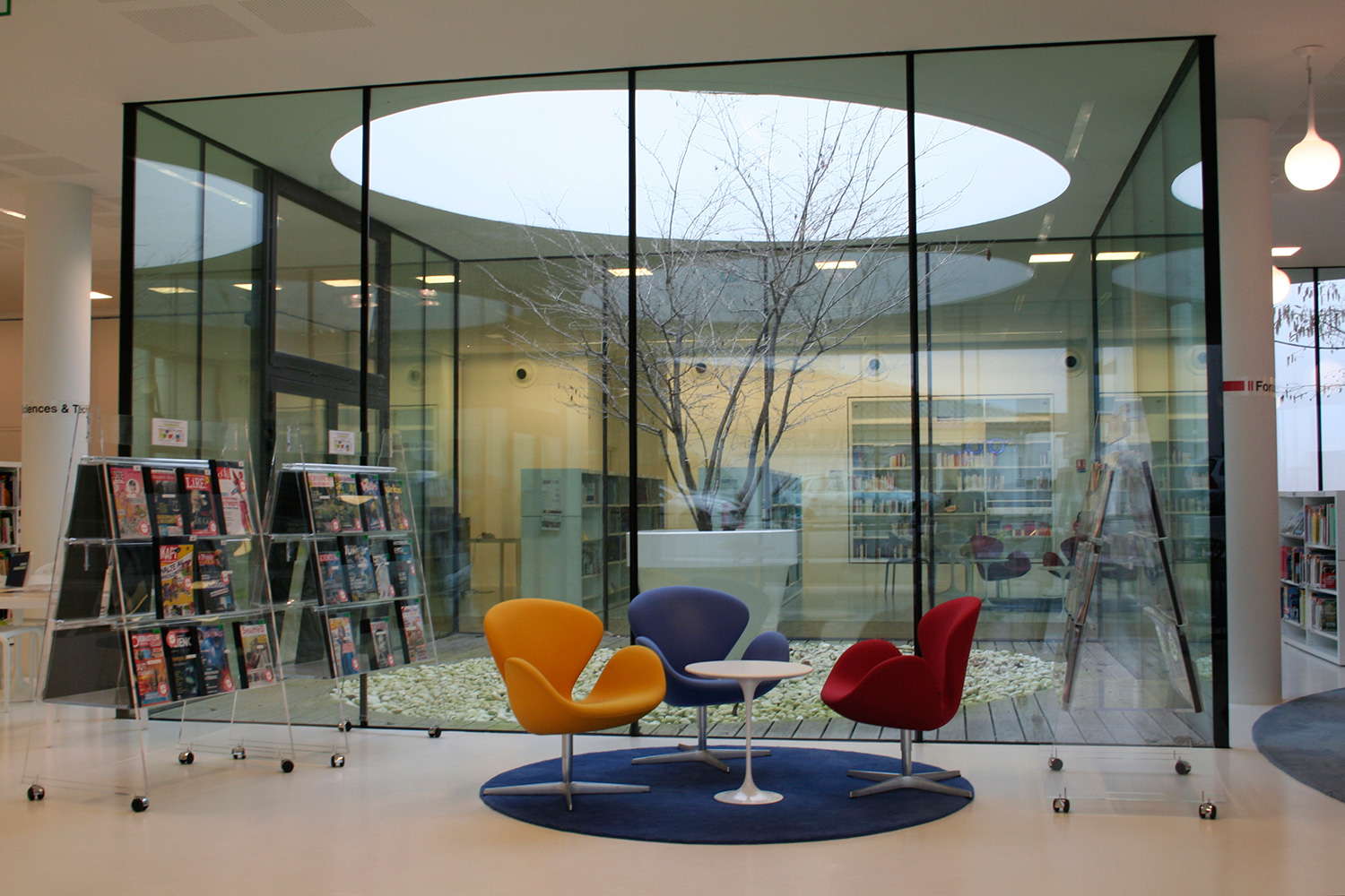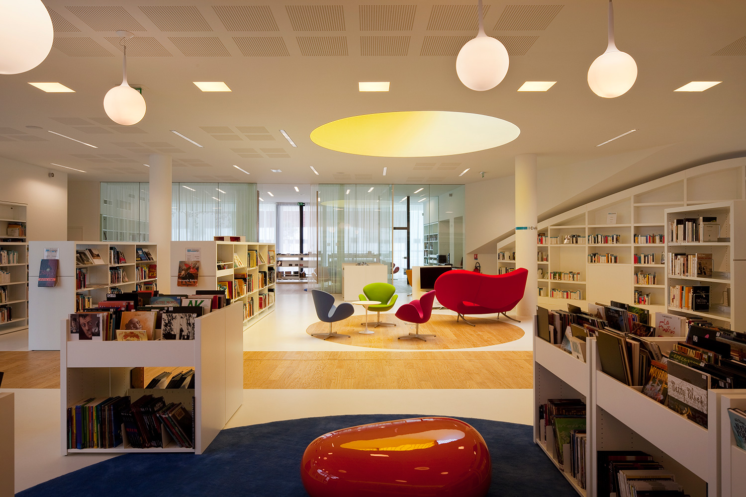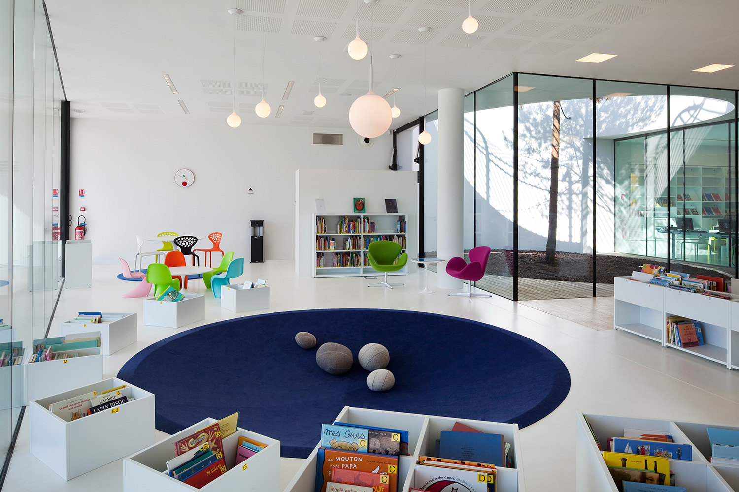 Le bâtiment est en grande partie vitré sur l’extérieur, l’intérieur est à dominante blanche avec sol en béton blanc, murs blancs et une bande de circulation traversant la Médiathèque en chêne. Seul le mobilier de confort et 2 très grands tapis apportent les couleurs nécessaires à ce projet.