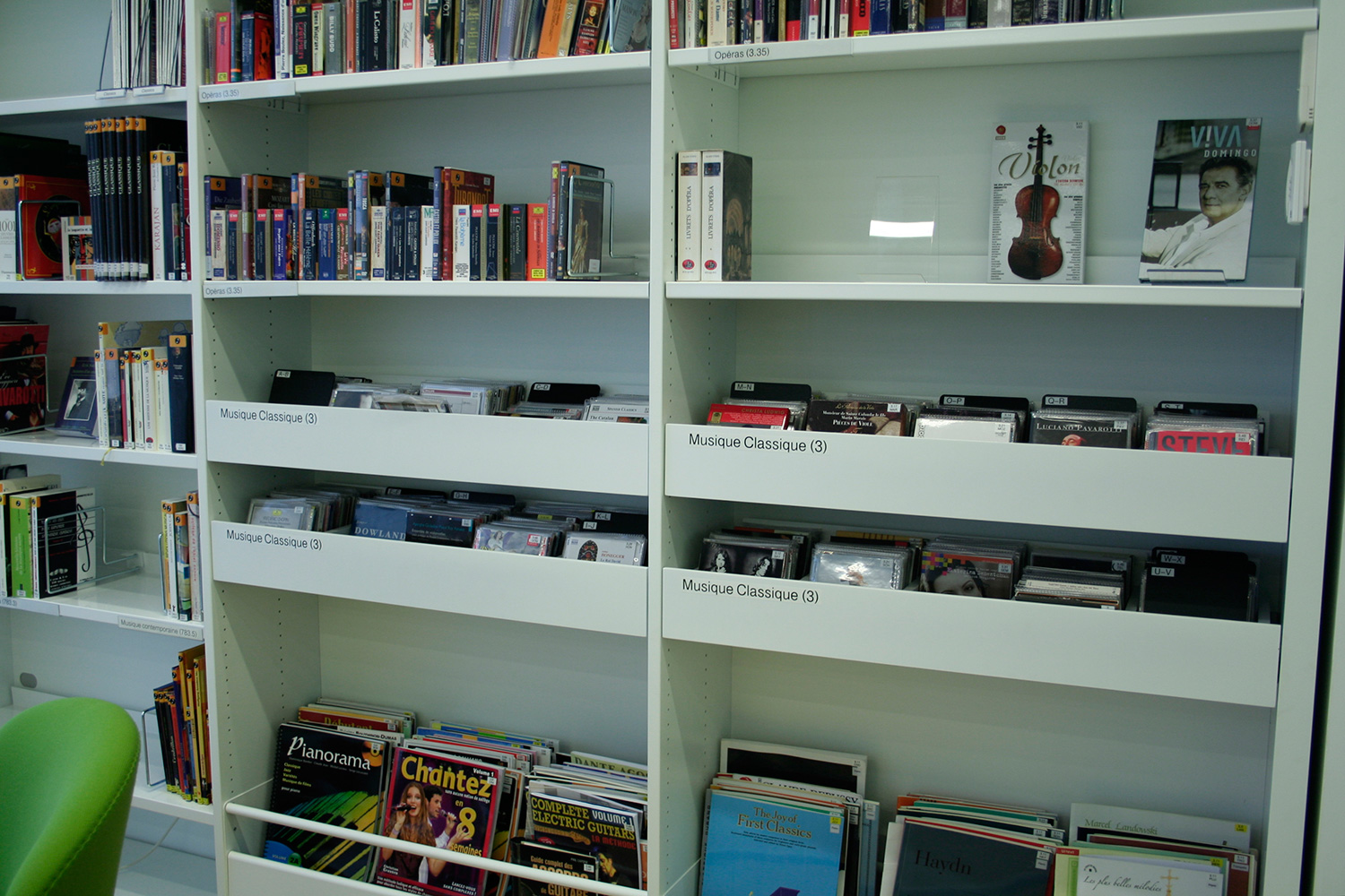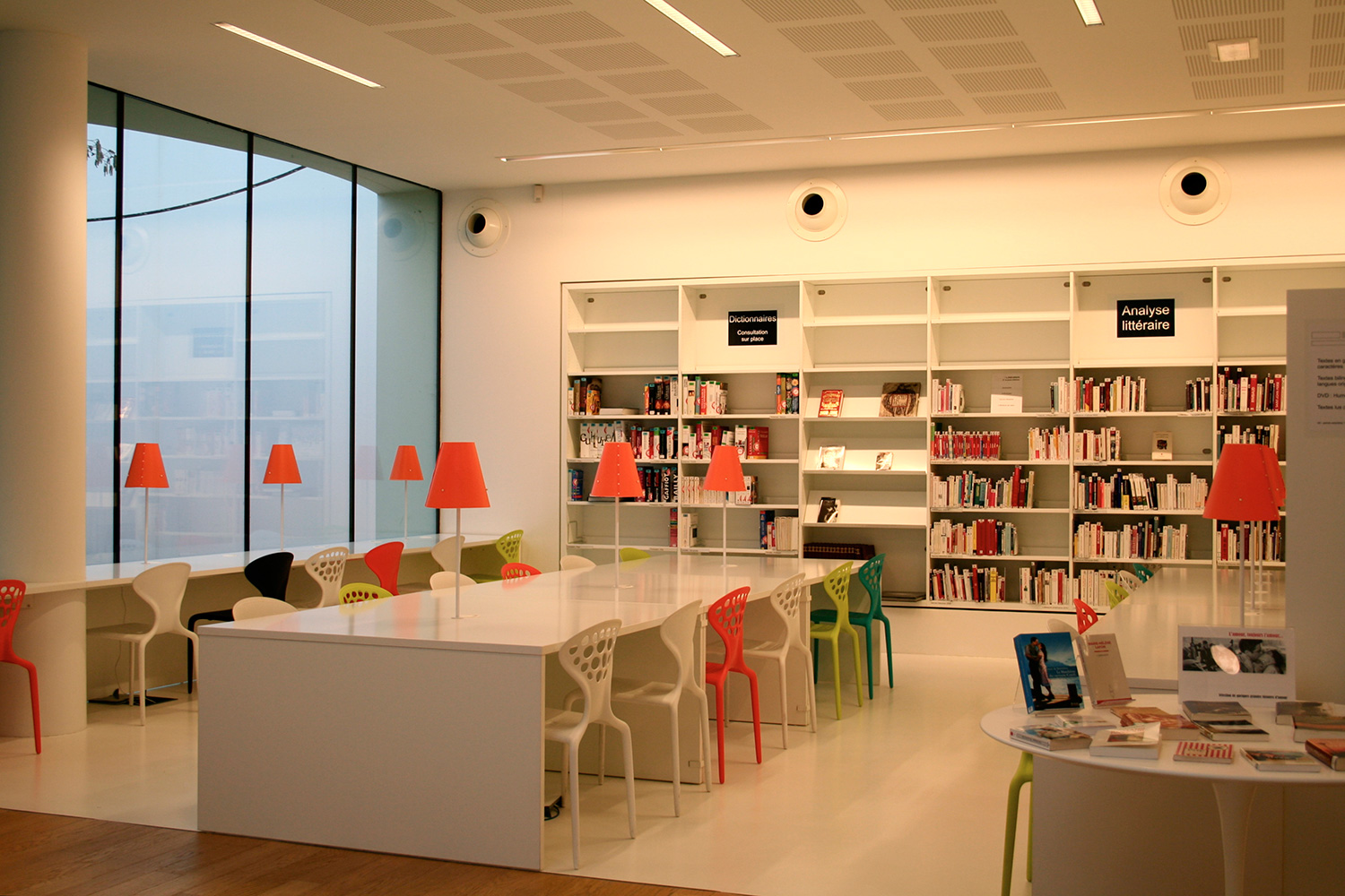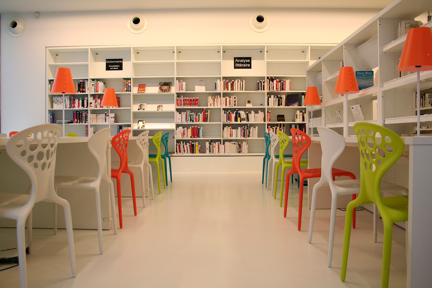 Le bâtiment est en grande partie vitré sur l’extérieur, l’intérieur est à dominante blanche avec sol en béton blanc, murs blancs et une bande de circulation traversant la Médiathèque en chêne. Seul le mobilier de confort et 2 très grands tapis apportent les couleurs nécessaires à ce projet.
