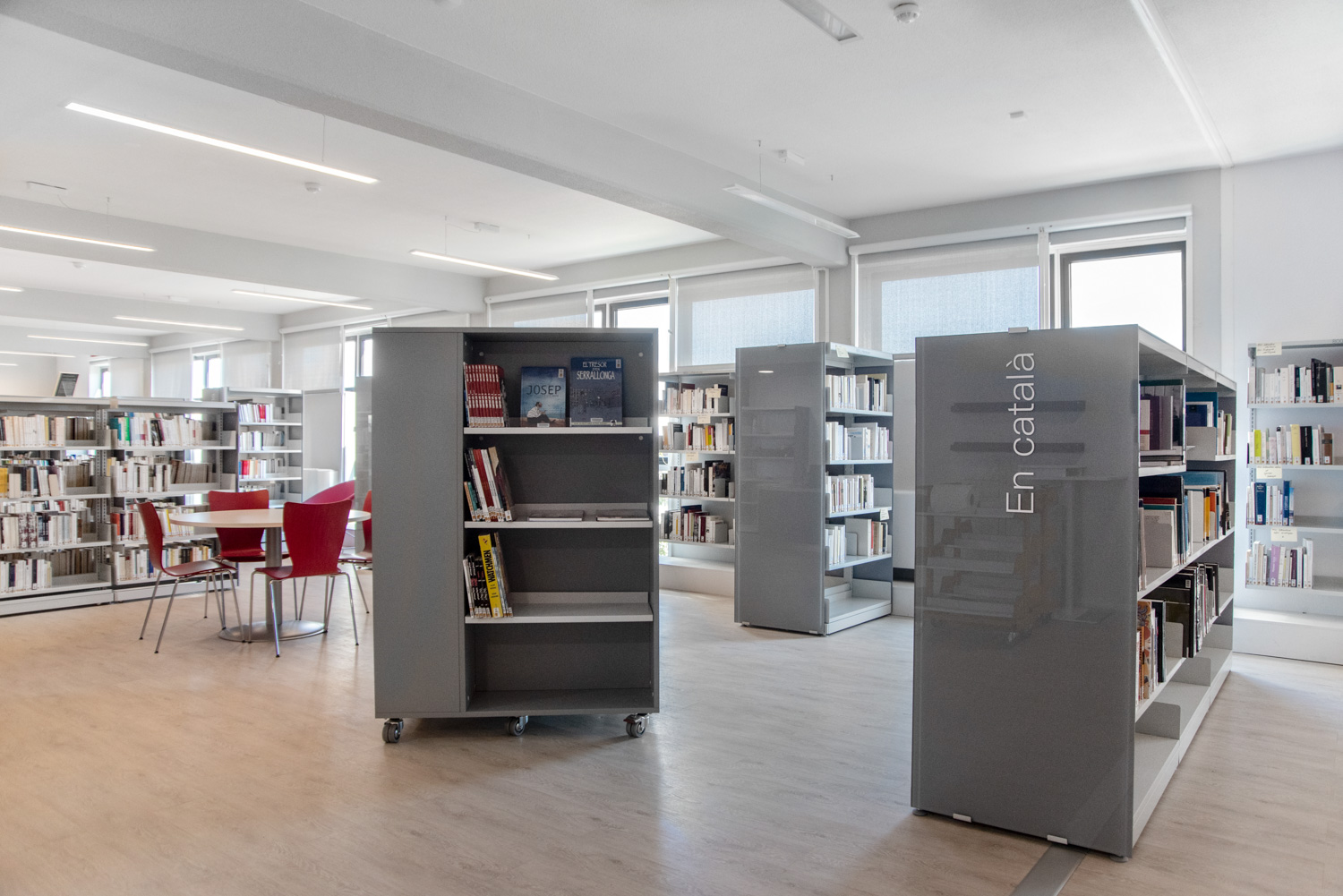 Les anciens magasins rénovés se distribuent désormais en quatre espaces : espace jeunesse et espace animations au rez-de-chaussée, espace adultes et espace jeux de société à l’étage. A chaque espace est associée une couleur pour la signalétique. Chaque espace intègre des ressources en langue catalane, des ressources accessibles aux publics éloignés (collections en gros caractères, DYS, braille, livres lus..) et multisupports (CD, vinyles, partitions, DVD...).