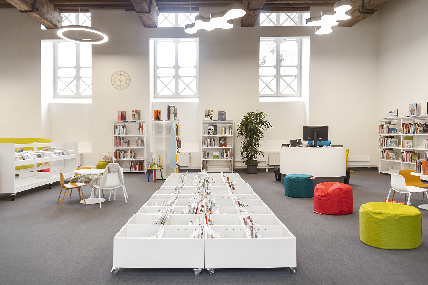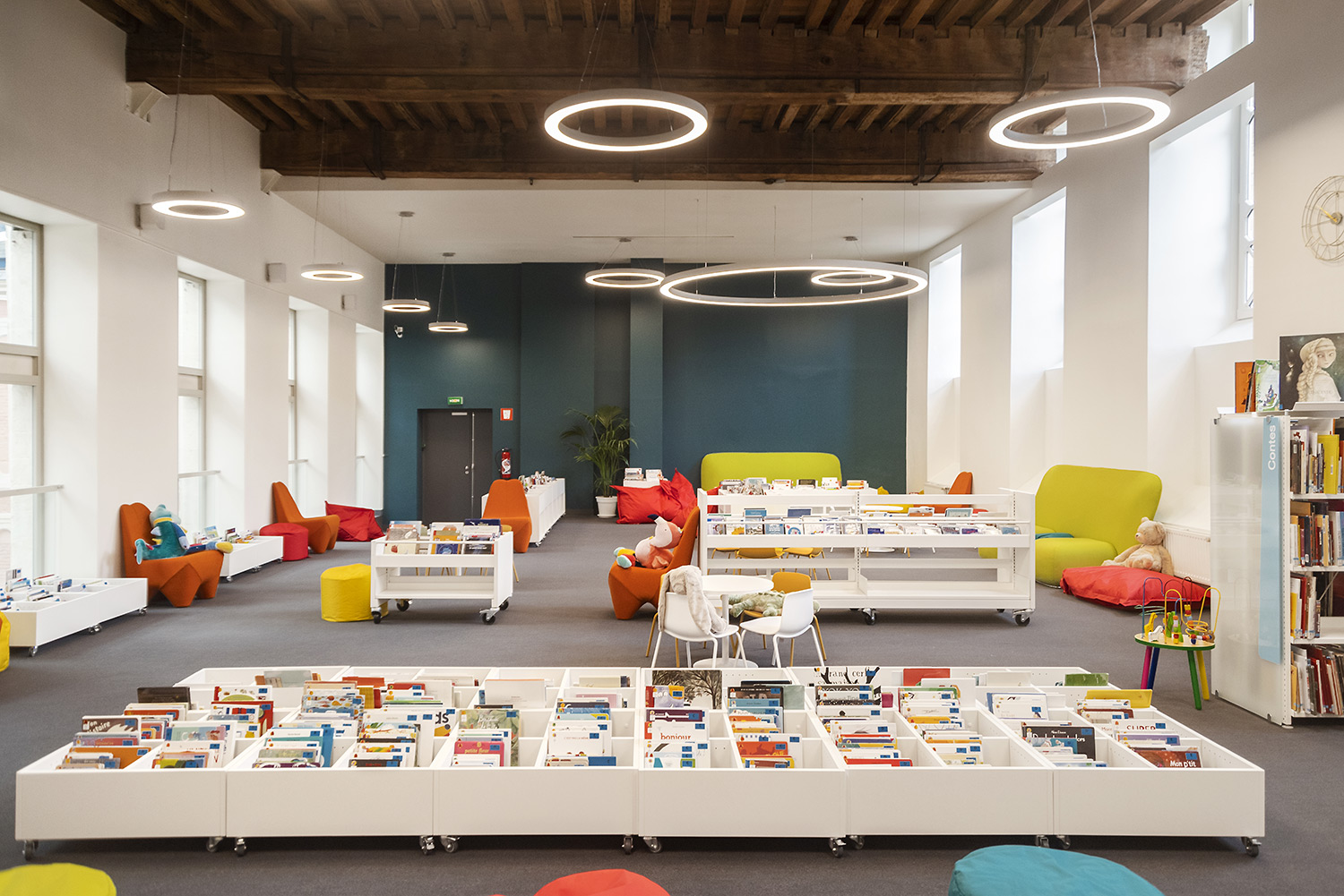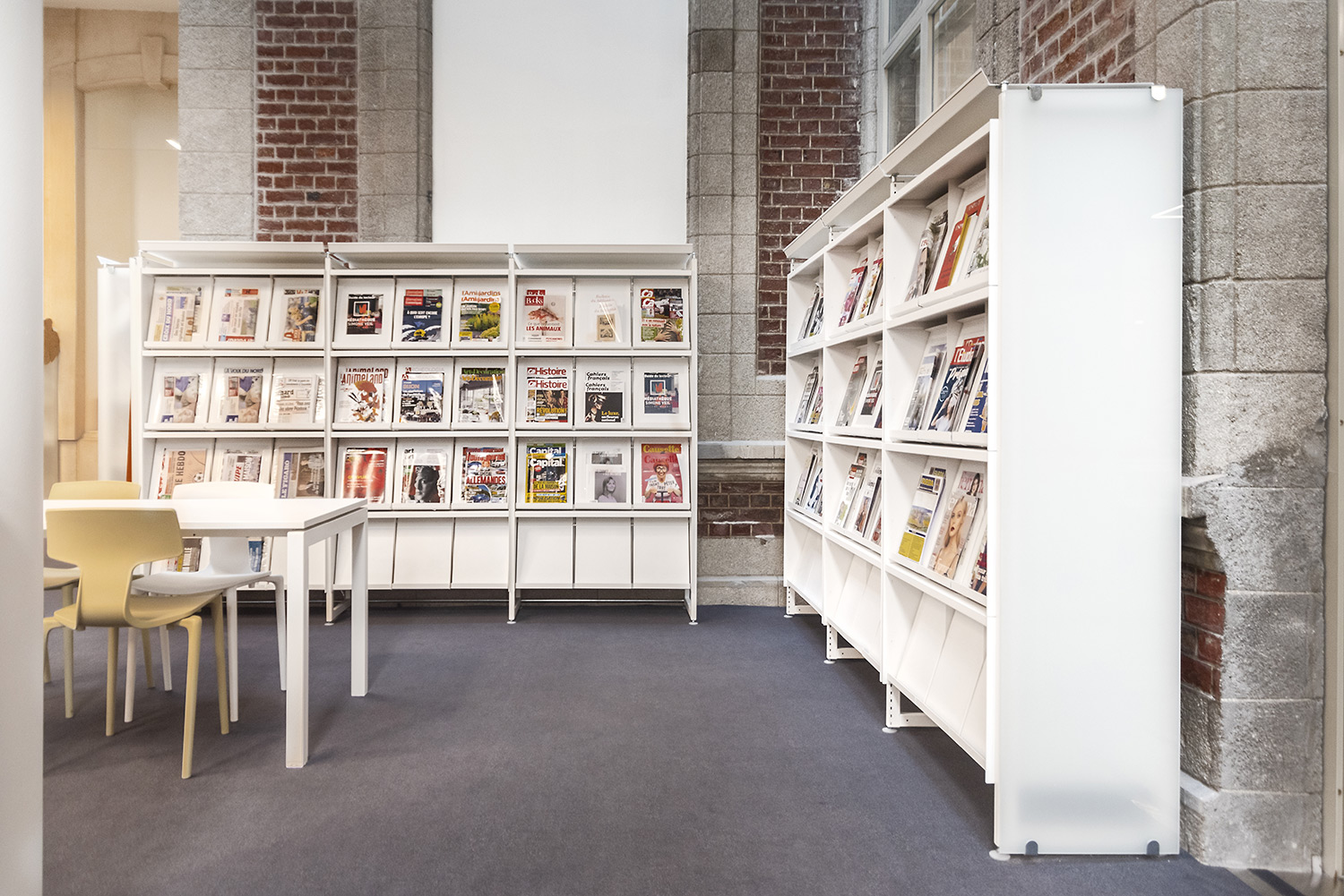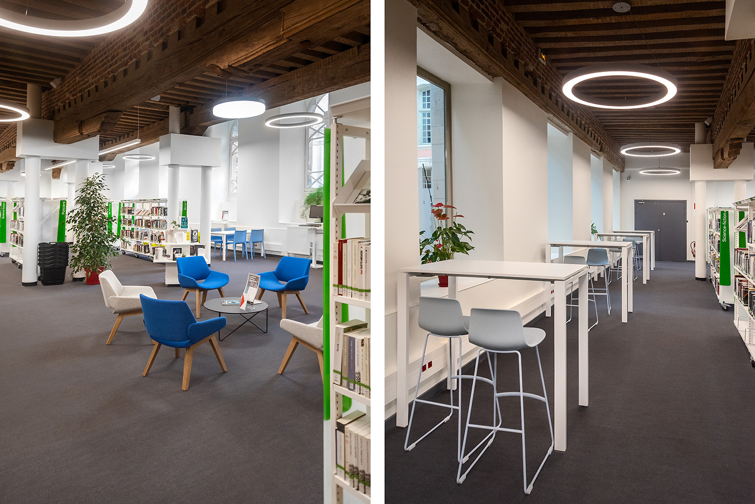 La médiathèque Simone Veil de Valenciennes s'est complètement transformée en 2019 pour offrir un écrin et des services adaptés à un équipement de lecture publique du XXIème siècle. Le mobilier contemporain au design élégant vient ainsi souligner une architecture patrimoniale (la médiathèque est classée Monument Historique avec une origine remontant au XVIème siècle).