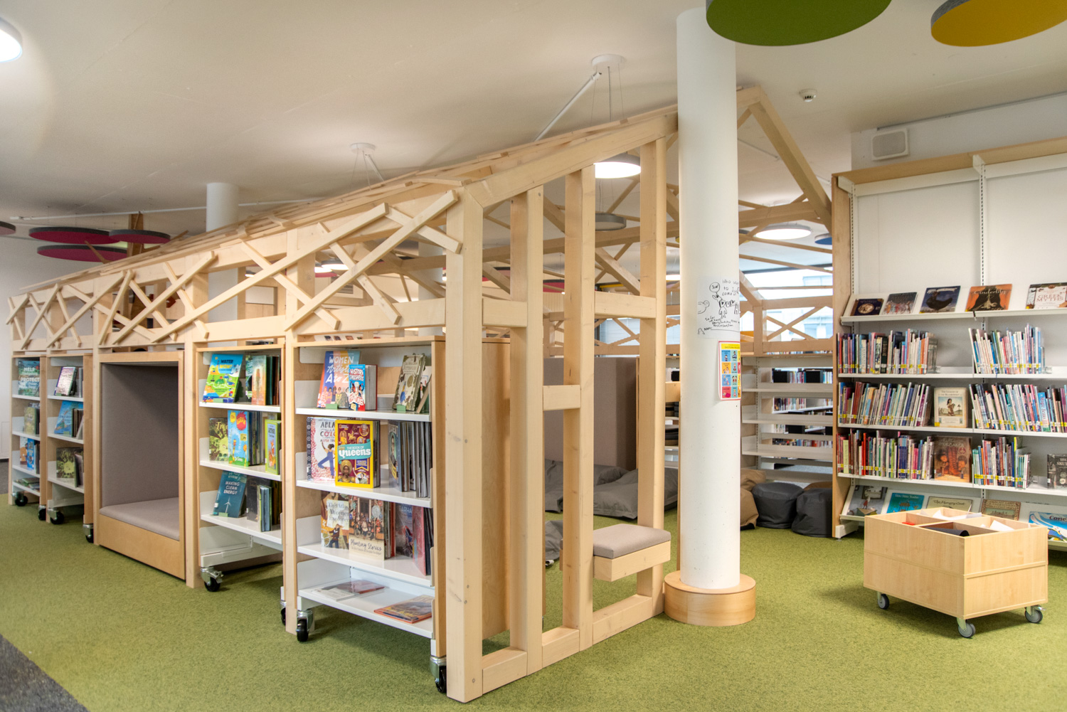 Les panneaux d'extrémité rainurés des rayonnages permettent de réaliser une signalétique attrayante, personnalisée en fonction des besoins des lecteurs. Dans cette bibliothèque bien conçue, les enfants sont soutenus dans leur parcours pour devenir des citoyens du monde avertis en matière d'information.