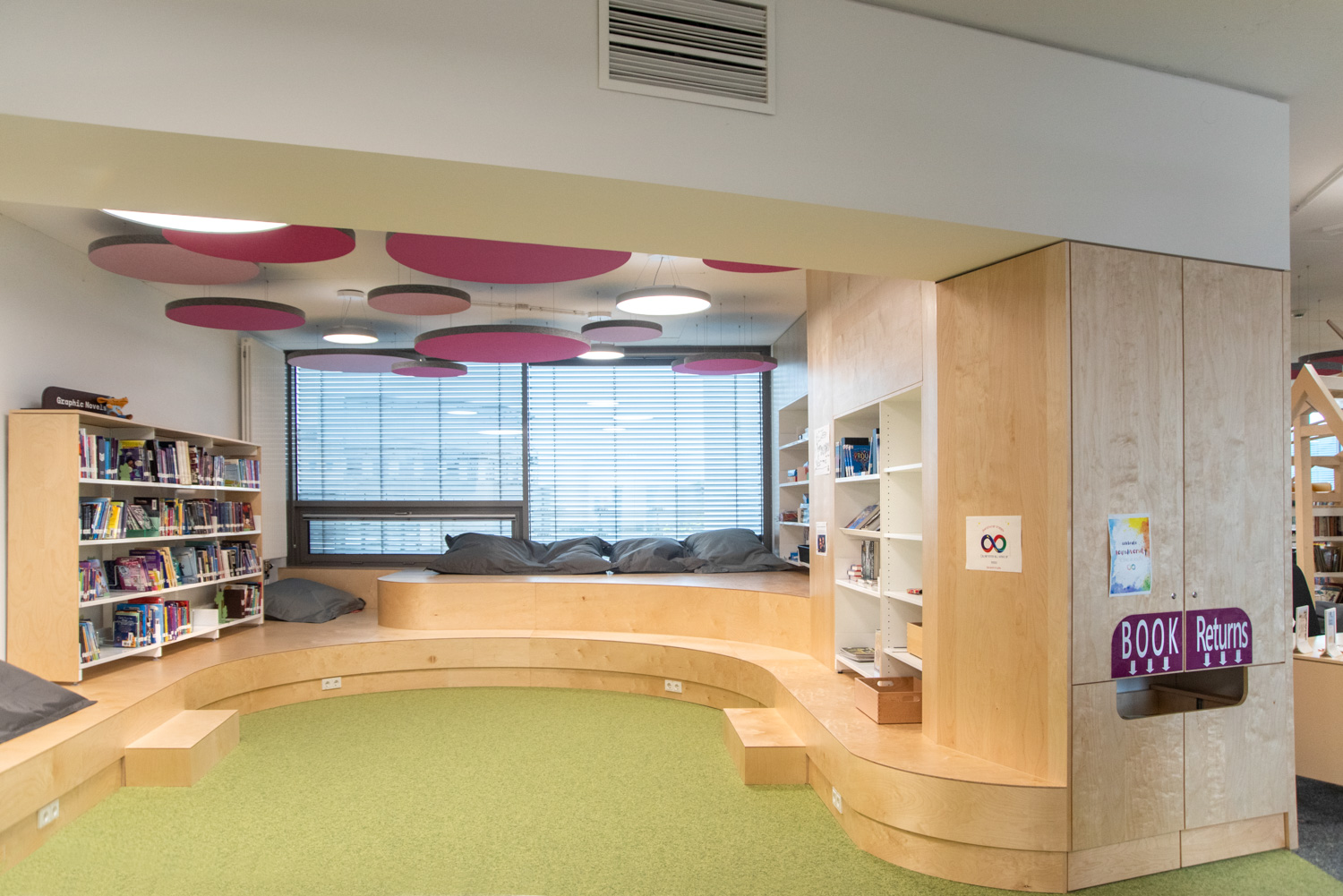 Les ouvrages sont présentés sur le système d'étagères métalliques 60/30 avec habillage d'extrémité en bois ou intégrés dans des meubles faits sur mesure. L'utilisation du blanc éclatant et du bois clair attirent l'attention sur les livres. Les îlots acoustiques installés au plafond ajoutent des touches de couleur qui s'harmonisent parfaitement avec le revêtement de sol.