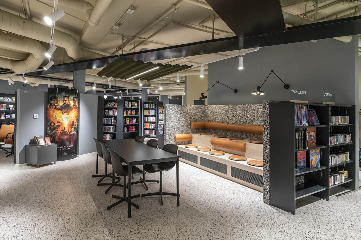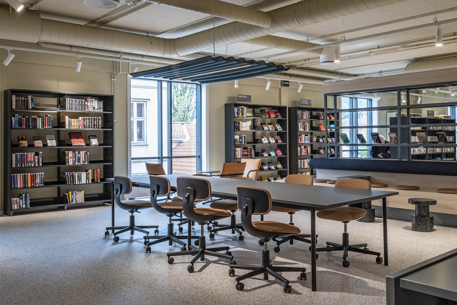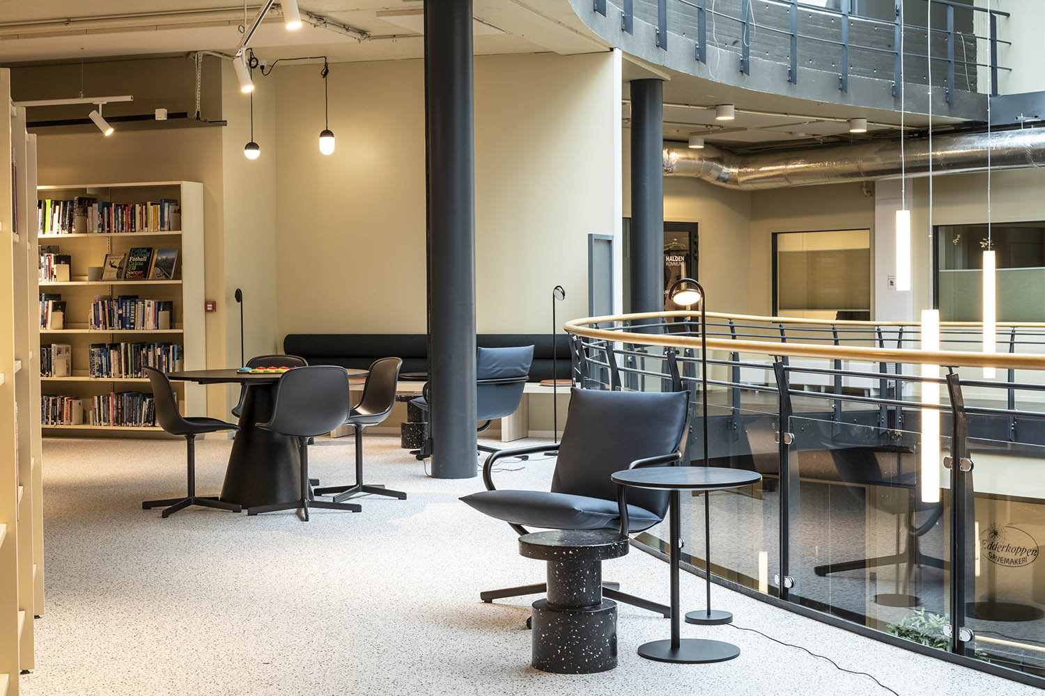 Le secteur adulte est, quant à lui, situé au 1er étage, où se trouvent, en plus des zones de lecture, de petits espaces pour les événements scénographiques et une salle dédiée au "Makerspace", tiers lieu de type atelier numérique, imprimante 3D. Les archives municipales d’Halden ont également leur propre espace dans la bibliothèque.