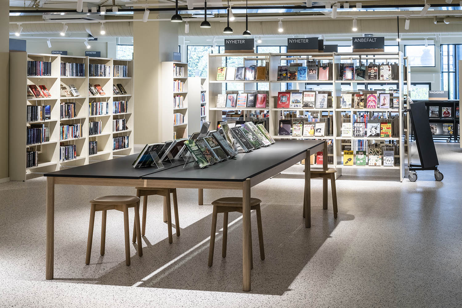 La médiathèque est en grande partie meublée de systèmes d'étagères dans des couleurs tantôt claires, tantôt foncées, qui se combinent entre elles et qui, avec le reste du mobilier, créent une atmosphère accueillante et intime, avec différents espaces pour tous les types de visiteurs.